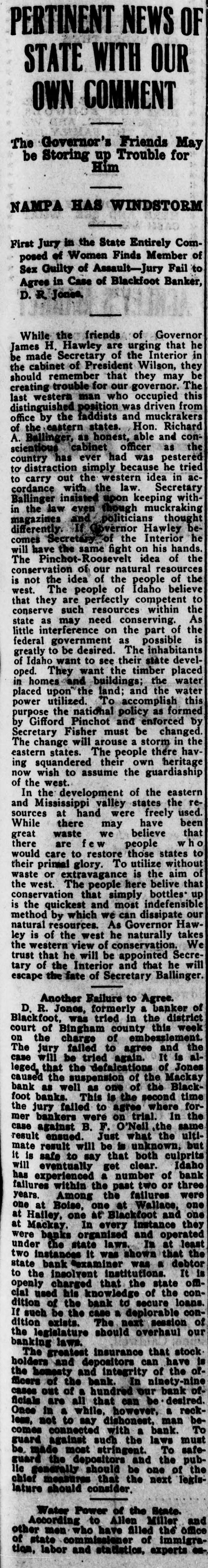 PERTINENT NEWS OF STATE WITH OUR OWN COMMENT The Governor's Friends May be Storing up Trouble for Him nampa HAS WINDSTORM First Jury in the State Entirely Composed of Women Finds Member of Sex Guilty of Assault-Jury Fail to Agree in Case of Blackfoot Banker, D. R Jones. While the friends of Governor James H. Hawley are urging that he be made Secretary of the Interior in the cabinet of President Wilson, they should remember that they may be creating trouble for our governor. The last western man who occupied this distinguished position was driven from office by the faddists and muckrakers of the eastern states. Hon. Richard A. Ballinger, as honest, able and conscientious cabinet officer as the country has ever had was pestered to distraction simply because he tried to carry out the western idea in accordance with the law. Secretary Ballinger insisted upon keeping within the law even though muckraking magazines and politicians thought differently. If overnor Hawley becomes Secretary of the Interior he will have the same fight on his hands. The Pinchot-Roosevelt idea of the conservation of our natural resources is not the idea of the people of the west. The people of Idaho believe that they are perfectly competent to conserve such resources within the state as may need conserving. As little interference on the part of the is federal government as possible greatly to be desired. The inhabitants of Idaho want to see their state developed. They want the timber placed in homes and buildings; the water placed upon" the land; and the water power utilized. To accomplish this purpose the national policy as formed by Gifford Pinchot and enforced by Secretary Fisher must be changed. The change will arouse a storm in the eastern states. The people there having squandered their own heritage now wish to assume the guardiaship of the west. In the development of the eastern and Mississippi valley states the resources at hand were freely used. While there may have been great waste we believe that there are few people who would care to restore those states to their primal glory. To utilize without waste or extravagance is the aim of the west. The people here belive that conservation that simply bottles up is the quickest and most indefensible method by which we can dissipate our natural resources. As Governor Hawley is of the west he naturally takes the western view of conservation. We trust that he will be appointed Secretary of the Interior and that he will escape the fate of Secretary Ballinger. Another Failure to Agree. D. R. Jones, formerly a banker of Blackfoot, was tried in the district court of Bingham county this week on the charge of embesslement. The jury failed to agree and the case will be tried again. It is alleged, that the defalcations of Jones caused the suspension of the Mackay bank as well as one of the Blackfoot banks. This is the second time the jury failed to agree where former bankers were on trial. In the case against B. F. O'Neil the same result ensued. Just what the ultimate result will be is unknown, but it is safe to say that both culprits will eventually get clear. Idaho has experienced a number of bank failures within the past two or three years. Among the failures were one at Boise, one at Wallace, one at Hailey, one at Blackfoot and one at Mackay. In every instance they were banks organized and operated under the state laws. Im at least two instances it was shown that the state bank *examiner was a debtor to the insolvent institutions. It is openly charged that the state official used his knowledge of the condition of the bank to secure loans. If such be the case a deplorable condition exists. The next session of the legislature should overhaul our banking laws. The greatest insurance that stock holders and depositors can have is the honesty and integrity of the offficers of the bank. In ninety-nine cases out of a hundred our bank officials are all that can be desired. Once in a while, however, a reckless, not to say dishonest, man becomes connected with a bank. To guard against such the laws must be, made most stringent. To safeguard the depositors and the publie generally should be one of the chief measures that the next legislature should consider. Water Power of the State. According to Allen Miller and other filled the office