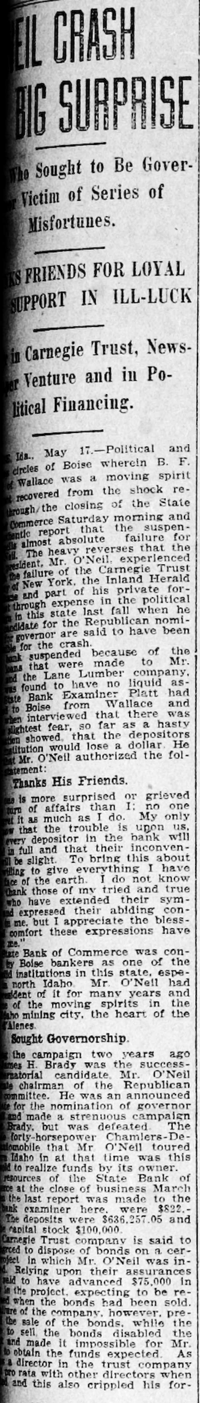 EIL CRASH BIG SURPRISE The Sought to Be GoverVictim of Series of Misfortunes. FRIENDS FOR LOYAL SUPPORT IN ILL-LUCK in Carnegie Trust, NewsVenture and in PoLitical Financing. Ida., May 17.-Political and circles of Boise wherein B. F. Wallace was a moving spirit recovered from the shock rebrough/the closing of the State Commerce Saturday morning and entic report that the suspenalmost absolute failure for The heavy reverses that the esident. Mr. O'Neil, experienced failure of the Carnegie Trust the New York. the Inland Herald of and part of his private forthrough expense in the political in this state last fall when he edidate for the Republican nomigovernor are said to have been for the crash. suspended because of the ans that were made to Mr. the Lane Lumber company. found to have no liquid astrie Bank Examiner Platt had to Boise from Wallace and interviewed that there was lightest fear, so far as a hasty Hon showed. that the depositors litution would lose a dollar He Mr. O'Neil authorized the folatement: Thanks His Friends. is more surprised or grieved turn of affairs than I: no one it as much as I do. My only that the trouble is upon us, every depositor in the bank will in full and that their inconvenbe slight. To bring this about Wing to give everything I have face of the earth. I do not know thank those of my tried and true who have extended their symad expressed their abiding conme. but I appreciate the blesscomfort these expressions have me.' late Bank of Commerce was conby Boise bankers as one of the did institutions in this state, espenorth Idaho Mr. O'Nell had ddent of It for many years and of the moving spirits in the sho mining city, the heart of the Alenes. Sought Governorship. the campaign two years ago uses H. Brady was the successmatorial candidate. Mr. O'Neil ate chairman of the Republican committee. He was an announced for the nomination of governor and made a strenuous campaign Brady. but was defeated. The forly-horsepower Chamlers-Detomobile that Mr O'Neil toured Idaho in at that time was this to realize funds by its owner. resources of the State Bank of Ice at the close of business March the last report was made to the ank examiner here. were $822.The deposits were $636,257.05 and rapital stock $100,000 Carnegie Trust company is said to sced to dispose of bonds on a cerneel in which Mr. O'Neil was inRelying upon their assurances reid to have advanced $75,000 In in the project. expecting to be rewhen the bonds had been sold. the of the company. however. prethe sale of the bonds. while the to sell, the bonds disabled the and made it impossible for Mr. to obtain the funds expected. As & director in the trust company pro rata with other directors when and this also crinnled his for-