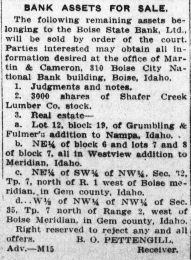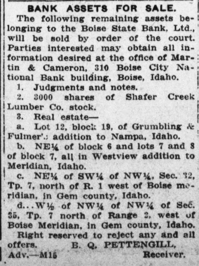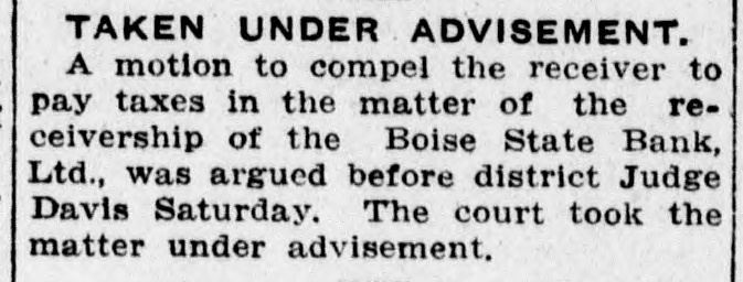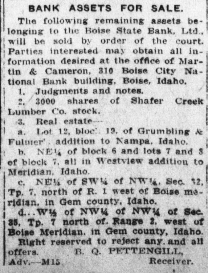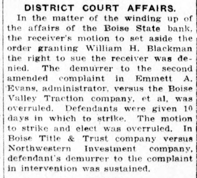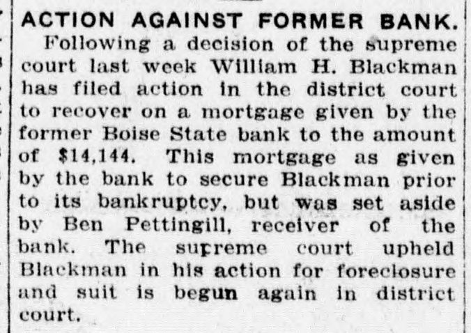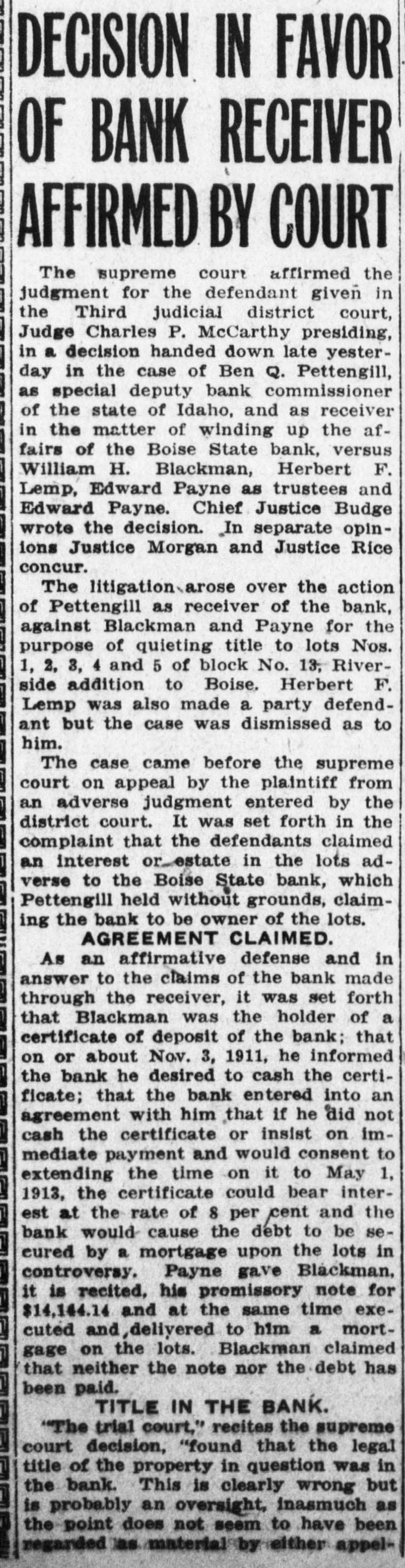 DECISION IN FAVOR OF BANK RECEIVER AFFIRMED BY COURT The supreme court affirmed the judgment for the defendant given in the Third judicial district court, Judge Charles P. McCarthy presiding, in a decision handed down late yesterday in the case of Ben Q. Pettengill, as special deputy bank commissioner of the state of Idaho, and as receiver in the matter of winding up the affairs of the Boise State bank, versus William H. Blackman, Herbert F. Lemp, Edward Payne as trustees and Edward Payne. Chief Justice Budge wrote the decision. In separate opinions Justice Morgan and Justice Rice concur. The litigation-arose over the action of Pettengill as receiver of the bank, against Blackman and Payne for the purpose of quieting title to lots Nos. 1, 2, 3, 4 and 5 of block No. 13, Riverside addition to Boise. Herbert F. Lemp was also made a party defendant but the case was dismissed as to him. The case came before the supreme court on appeal by the plaintiff from an adverse judgment entered by the district court. It was set forth in the complaint that the defendants claimed an interest or estate in the lots adverse to the Boise State bank, which Pettengill held without grounds, claiming the bank to be owner of the lots. AGREEMENT CLAIMED. As an affirmative defense and in answer to the claims of the bank made through the receiver, it was set forth that Blackman was the holder of a certificate of deposit of the bank; that on or about Nov. 3, 1911, he informed the bank he desired to cash the certificate; that the bank entered into an agreement with him that if he did not cash the certificate or insist on immediate payment and would consent to extending the time on it to May 1, 1913, the certificate could bear interest at the rate of 8 per cent and the bank would cause the debt to be secured by a mortgage upon the lots in controversy. Payne gave Blackman, it is recited. his promissory note for $14,144.14 and at the same time executed and delivered to him a mortgage on the lots. Blackman claimed that neither the note nor the debt has been paid. TITLE IN THE BANK. "The trial court," recites the supreme court decision, "found that the legal title of the property in question was in the bank. This is clearly wrong but is probably an oversight, inasmuch as the point does not seem to have been regarded law material by either appel-