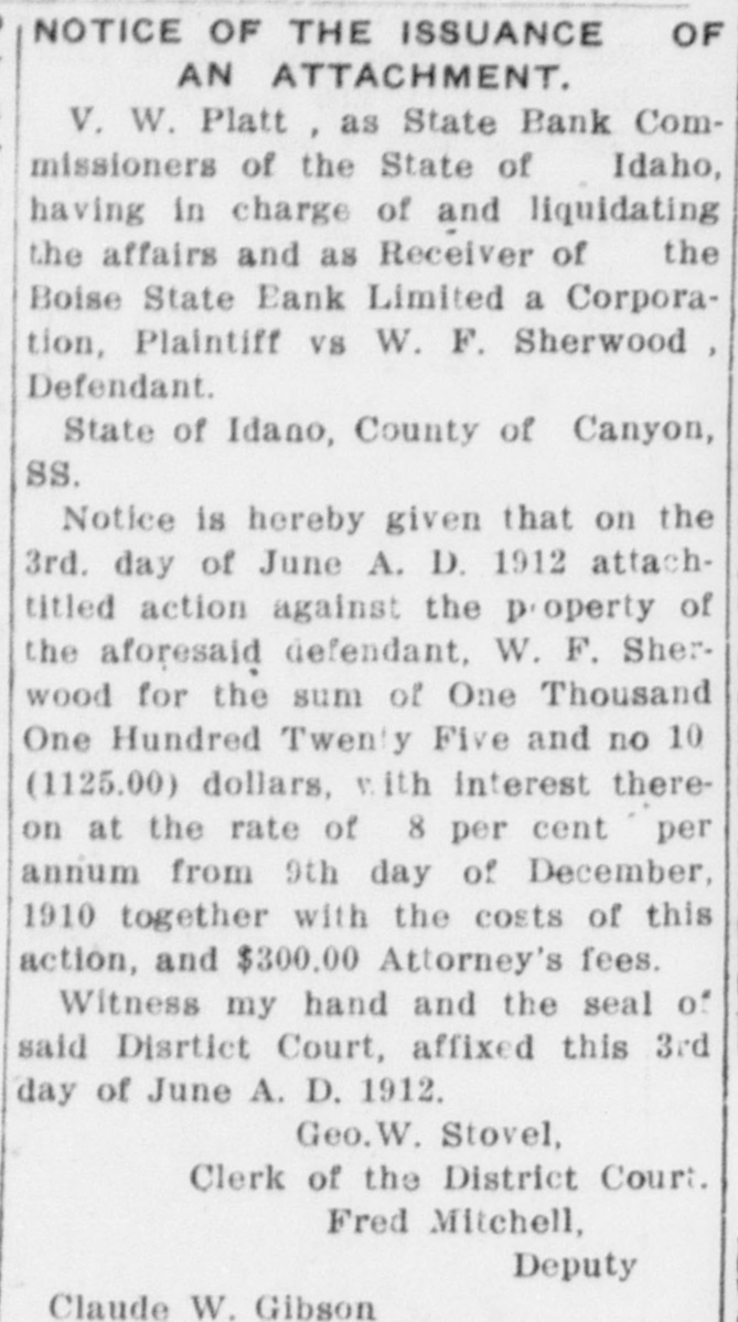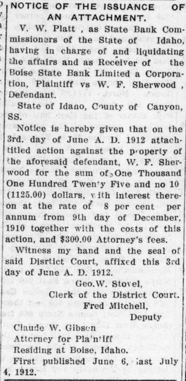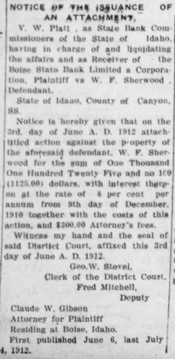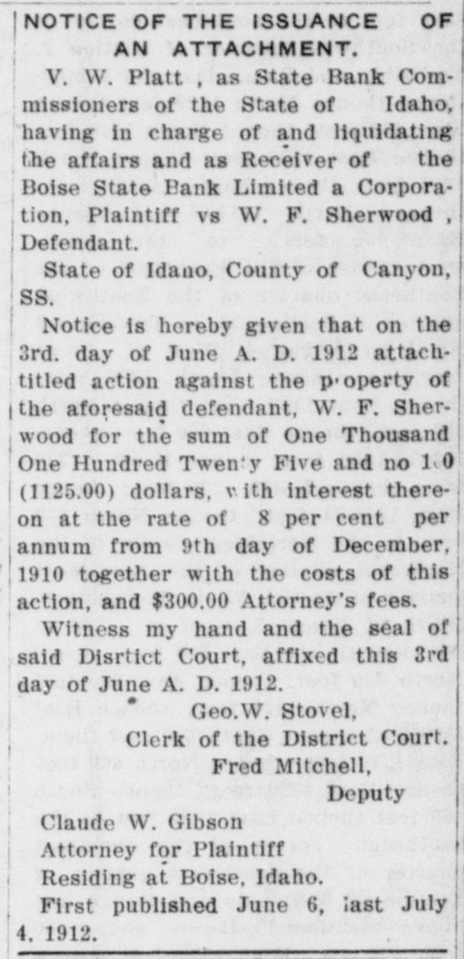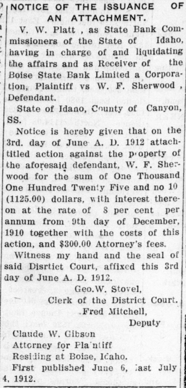 NOTICE OF THE ISSUANCE OF AN ATTACHMENT, V. W. Platt as State Bank Commissioners of the State of Idaho, having in charge of and liquidating the affairs and as Receiver of the Boise State Bank Limited a Corporation, Plaintiff vs W. F. Sherwood, Defendant. State of Idano, County of Canyon, SS. Notice is hereby given that on the 3rd. day of June A. D. 1912 attachutied action against the p-operty of the aforesaid defendant. W. F. Sherwood for the sum of One Thousand One Hundred Twenty Five and no 1CO (1125.00) dollars. with interest thereon at the rate of 8 per cent per annum from 9th day of December. 1910 together with the costs of this action, and $300.00 Attorney's fees. Witness my hand and the seal of said Diartict Court, affixed this 3rd day of June A. D. 1912. Geo. Stovel, Clerk of the District Court. Fred Mitchell, Deputy Claude W. Gibson Attorney for Plaintiff Residing at Boise, Idaho. First published June 6, last July 4, 1912.