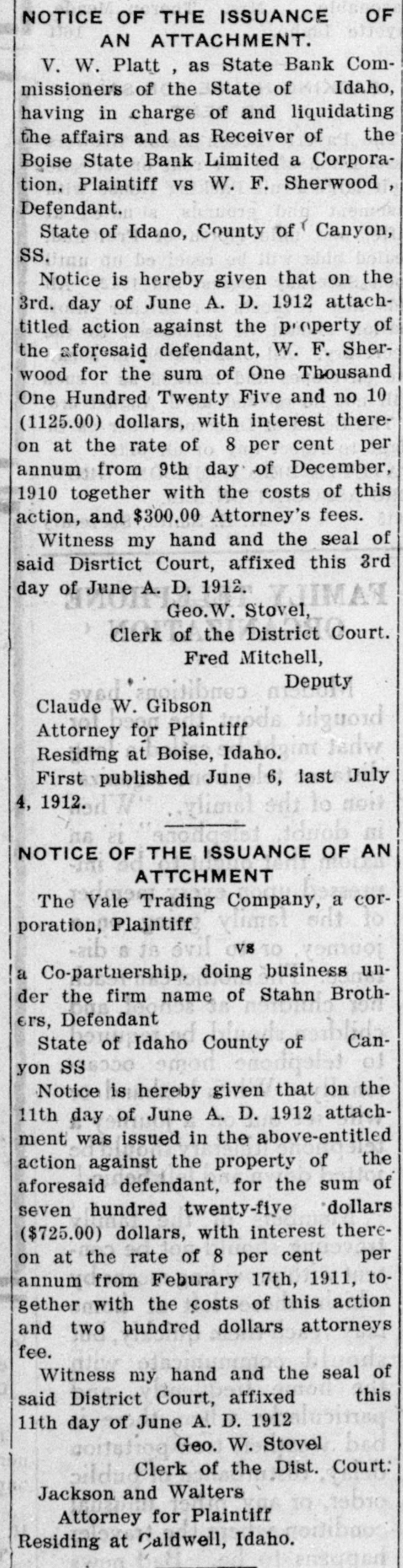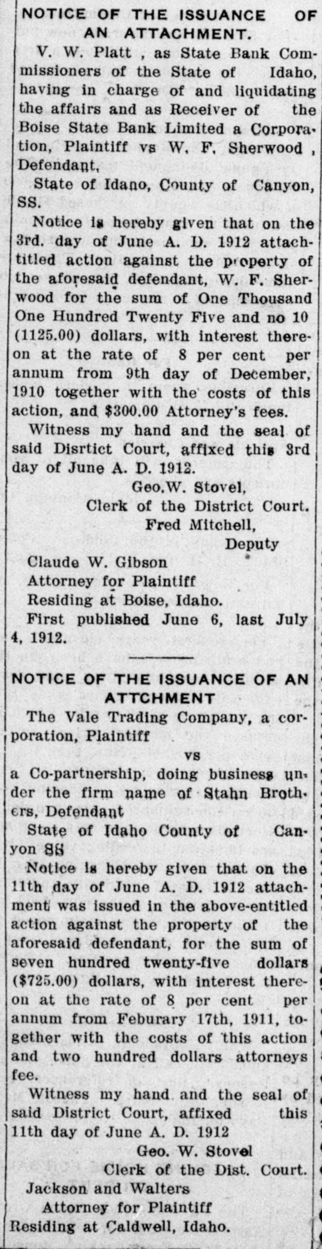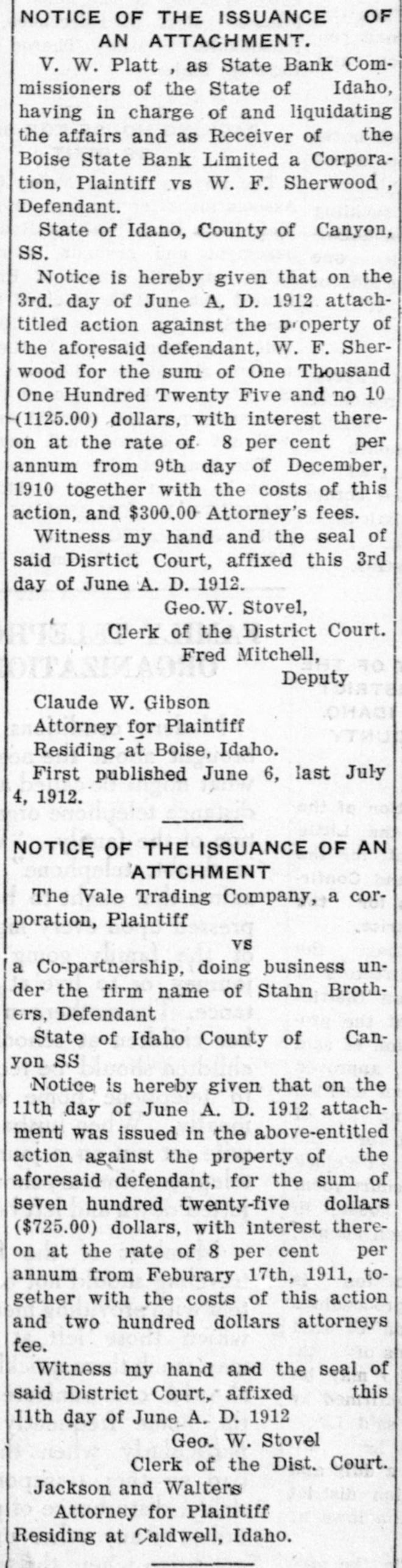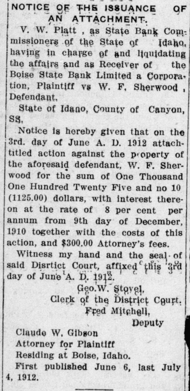 NOTICE OF THE ISSUANCE OF AN ATTACHMENT, V. W. Platt as State Bank Commissioners of the State of Idaho, having in charge of and liquidating the affairs and as Receiver of the Boise State Bank Limited a Corporation, Plaintiff vs W. F. Sherwood, Defendant. State of Idano, County of Canyon, SS. Notice is hereby given that on the 3rd. day of June A. D. 1912 attachutied action against the p-operty of the aforesaid defendant. W. F. Sherwood for the sum of One Thousand One Hundred Twenty Five and no 1CO (1125.00) dollars. with interest thereon at the rate of 8 per cent per annum from 9th day of December. 1910 together with the costs of this action, and $300.00 Attorney's fees. Witness my hand and the seal of said Diartict Court, affixed this 3rd day of June A. D. 1912. Geo. Stovel, Clerk of the District Court. Fred Mitchell, Deputy Claude W. Gibson Attorney for Plaintiff Residing at Boise, Idaho. First published June 6, last July 4, 1912.