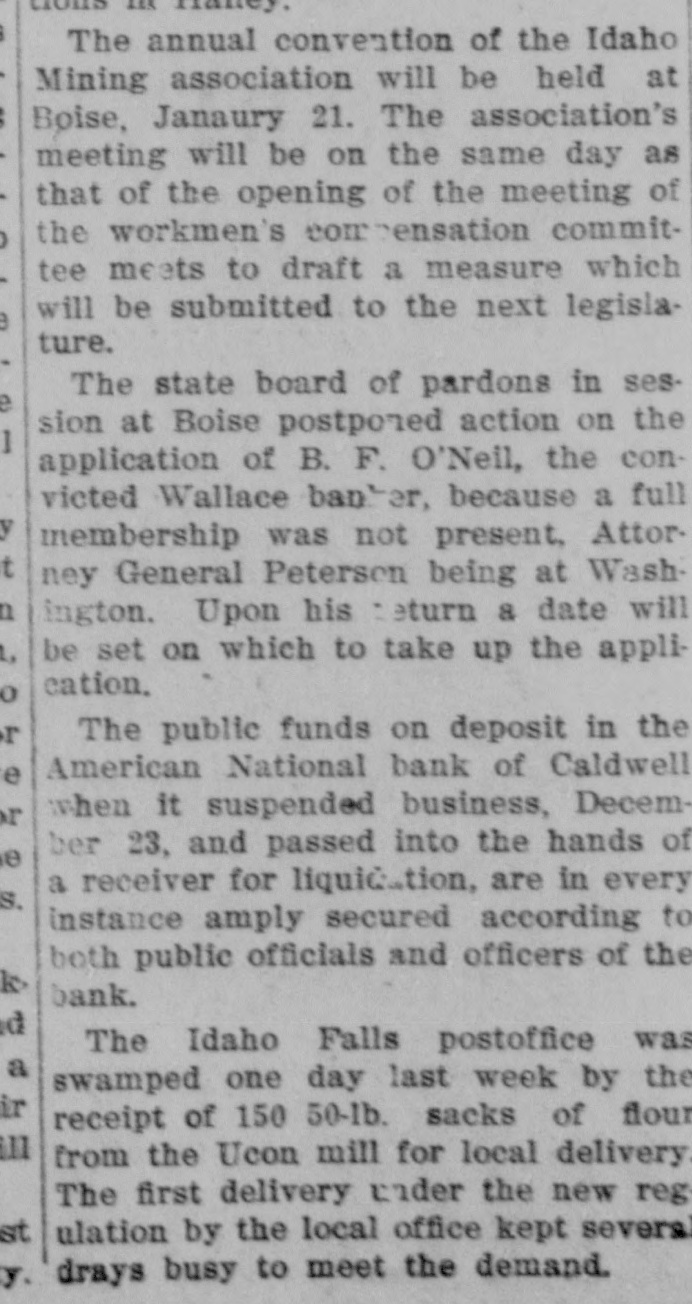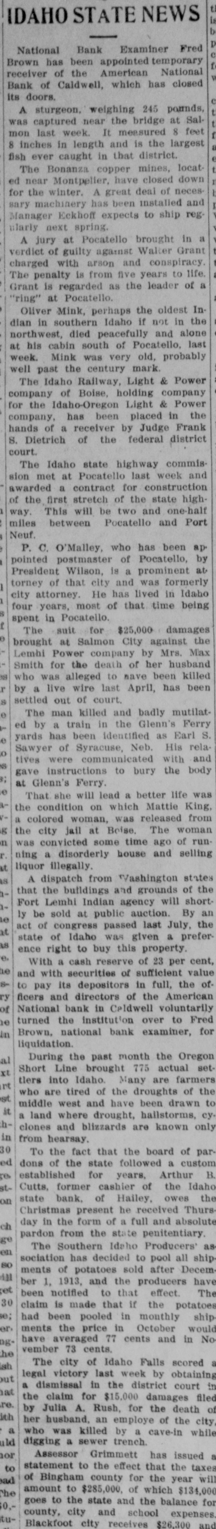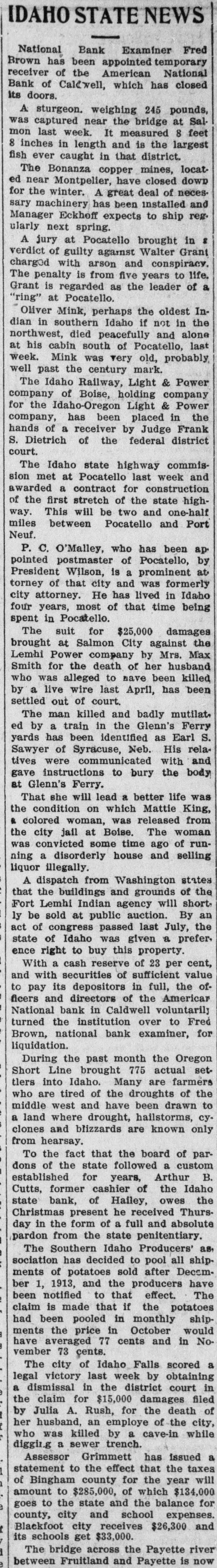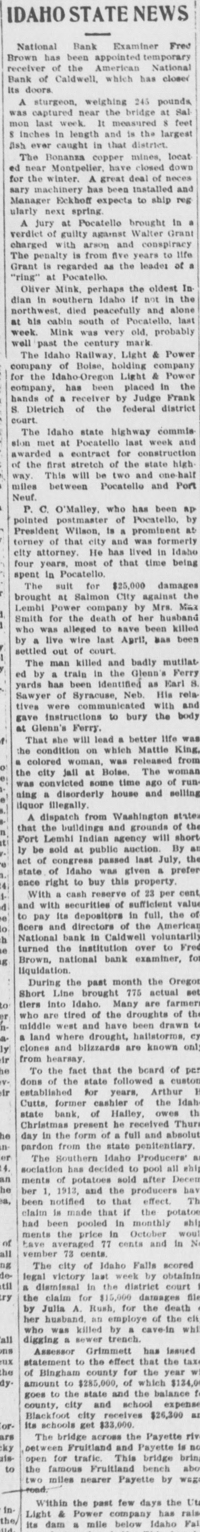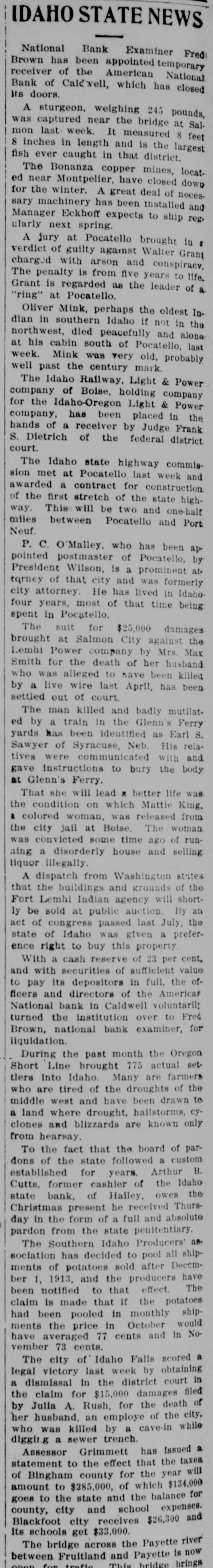 IN THE GEM STATE During 1913 there was raised in Idaho 8,000 carloads of potatoes, a farm product in which Idaho broke the world's record for a one-acre yield. It is predicted that before the close of 1914, citizens of Boise will have the pleasure of riding to and from Barber over an interurban trolley line. Up to July 1, 1913, $8,132,831 was expended by the United States gov. ernment on the Boise reclamation project, of which the Arrow Rock dam is the key. During the past year the school population in Idaho increased from 104,735 to 108,850, a net gain of 4,115 students. Over $1,800,000 was paid out to teachers in salaries.It is probable that the case of Franklin county against Bannock county will be reopened, in order to more fully determine the boundary line between the two counties. The value of the mineral and mental output of Idaho for the year is given as $22,807,575, an increase of $778,247 over 1912. and representing 353,942,500 pounds of lead, zinc, copper, silver and gold. During the past year Idaho fruit growers shipped 2,000 cars of fruit of the highest quality, netting producers $1,038,270 profit and added 5,000 acres of fruit lands to its rapidly growing area. In 1911 the Oregon Short Line brought 8,933 emigrants into southern Idaho. In 1912, the last year for which complete figures are at hand, the same company brought in 0,407 emigrants. Canyon county will rank second with the counties of Idaho and will be exceeded only by Ada county in the amount of property shown on the abstract of the personal assessment roll for 1913. When the last federal census was taken Idaho had within her borders 325,594 men, women and children. This was an increase in the ten years from 1900 of 101.3 per cent, a record made by but few of the states. Bert Mattingly Miller will probably be brought back to Boise from Vale. Ore., to answer to the charge of grand larceny. He is accused of stealing a team of horses from J. W. Willis, which were later sold in Oregon. The state now has in round numbers $10,000,000 in its permanent endowment funds derived from the sale of state lands. And the state still owns about 2,500,000 acres of land and timber of probably $12,000,000 in value. Two members have been added to the Pocatello city council. Eight months ago the Fifth ward was created. which gives two more on the municipal representative body, but the appointments were delayed until last week. M. E. Whitehead, charged with issuing a check on a bank in which he had no funds, pleading guilty as charged in district court at Caldwell and was sentenced to serve 60 days in the county jail. The check in question was for $20. Little Lost river irrigation project is to be revived. The state bond board will apply to the federal government for the segregation of the land in cluded in the project. This amounts to a little more than 20,000 acres in Blaine and Custer counties. The Idaho Falls postoffice was swamped one day last week by the receipt of 150 50-1b. sacks of flour from the Ucon mill for local delivery. The first delivery under the new regulation by the local office kept several drays busy to meet the demand. The public funds on deposit in the American National bank of Caldwell when it suspended business, December 23, and passed into the hands of a receiver for liquidation, are in every instance amply secured according to both public officials and officers of the bank. The board of inquiry held at Nampa to investigate the accident on the Idaho Northern branch when a motor car collided with the rear end of the regular train placed blame for the same wholly on Conductor F. A. Bonner and Brakeman J. F. Sewell of the train. Parties are negotiating for the construction at Pocatello of a 100-room hotel to cost not less than $100,000. The only arrangement now to be made is to induce the owners of the desired realty to take stock in the hotel company equal to the value of the lots in question. In 1914 the Oregon Short Line proposes to tap two of the richest agricultural sections in Idaho. One section lying between Idaho Falls and St. Anthony, a wonderfully rich agricultural district, is to be encircled by a belt line or loop 80 miles long to cost $1,500,000. President D. Worth Clark of the Wilson club has issued a call to all Democrats to gather in Pocatello on the evening of January 8 for the reg. ular Jackson day banquet and speechmaking. The gold strike recently made in the Allie mine at Gilmore, is said to exceed any strike that has ever been made in that camp. Reliable reports say that the strike was made at the depth of 300 feet, where a large vein of gold ore was encountered which is estimated to run from $9,000 to $10,000 per ton.