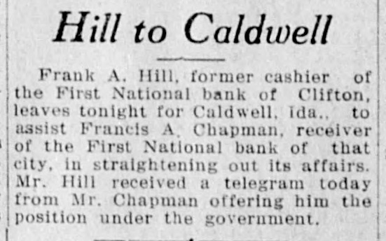Hill to Caldwell Frank A. Hill, former cashier of the First National bank of Clifton, leaves tonight for Caldwell, Ida., to assist Francis A, Chapman, receiver of the First National bank of that city, in straightening out its affairs. Mr. Hill received a telegram today from Mr. Chapman offering him the position under the government.