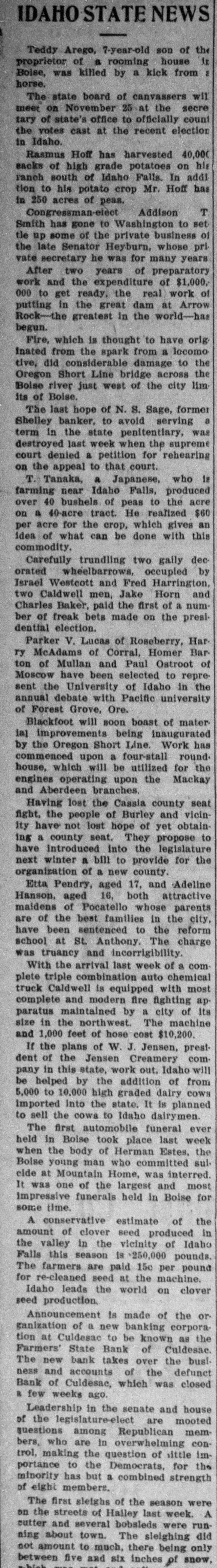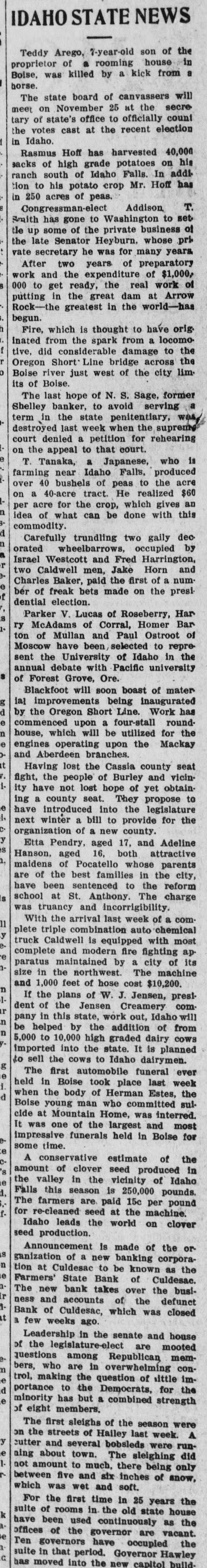 IDAHO STATE NEWS Teddy Arego, 7-year-old son of the proprietor of a rooming house it Boise, was killed by a kick from a horse. The state board of canvassers will meet on November 25 at the secre tary of state's office to officially count the votes cast at the recent election in Idaho. Rasmus Hoff has harvested 40,000 sacks of high grade potatoes on his ranch south of Idaho Falls. In addi tion to his potato crop Mr. Hoff has in 250 acres of peas. Congressman-elect Addison T Smith has gone to Washington to set tle up some of the private business 01 the late Senator Heyburn, whose pri vate secretary he was for many years After two years of preparatory work and the expenditure of $1,000, 000 to get ready, the real work of putting in the great dam at Arrow Rock-the greatest in the world-has begun. Fire, which is thought to have orig inated from the spark from a locomotive, did considerable damage to the Oregon Short Line bridge across the Boise river just west of the city lim its of Boise. The last hope of N. S. Sage, former Shelley banker, to avoid serving a term in the state penitentiary, was destroyed last week when the supreme court denied a petition for rehearing on the appeal to that court. T. Tanaka, Japanese, who is farming near Idaho Falls, produced over 40 bushels of peas to the acre on a 40-acre tract. He realized $60 per acre for the crop, which gives an idea of what can be done with this commodity. Carefully trundling two gaily decorated wheelbarrows, occupied by D Israel Westcott and Fred Harrington two Caldwell men, Jake Horn and P Charles Baker, paid the first of a num ber of freak bets made on the presidential election. h Parker V. Lucas of Roseberry, Harry McAdams of Corral, Homer Barton of Mullan and Paul Ostroot of fi Moscow have been selected to represent the University of Idaho in the annual debate with Pacific university of Forest Grove, Ore. 0 Blackfoot will soon boast of mater ial improvements being inaugurated a by the Oregon Short Line. Work has 0 commenced upon a four-stall round. house, which will be utilized for the engines operating upon the Mackay and Aberdeen branches, of W Having lost the Cassia county seat ti fight, the people of Burley and vicinity have not lost hope of yet obtaingo ing a county seat. They propose to have introduced into the legislature next winter a bill to provide for the organization of a new county. or Etta Pendry, aged 17, and Adeline Hanson, aged 16, both attractive maidens of Pocatello whose parents are of the best families in the city, th have been sentenced to the reform pa school at St. Anthony. The charge B was truancy and incorrigibility. B With the arrival last week of a comof plete triple combination auto chemical W truck Caldwell is equipped with most R complete and modern fire fighting apparatus maintained by a city of its h: size in the northwest. The machine and 1,000 feet of hose cost $10,200. If the plans of W. J. Jensen, president of the Jensen Creamery company in this state, work out. Idaho will be helped by the addition of from 5,000 to 10,000 high graded dairy cows imported into the state. It is planned to sell the COWS to Idaho dairymen. The first automobile funeral ever held in Boise took place last week when the body of Herman Estes, the Boise young man who committed suicide at Mountain Home, was interred. It was one of the largest and most impressive funerals held in Boise for some time. A conservative estimate of the amount of clover seed produced in the valley in the vicinity of Idaho Falls this season is 250,000 pounds. The farmers are paid 15c per pound or re-cleaned seed at the machine. Idaho leads the world on clover seed production. Announcement is made of the organization of a new banking corporation at Culdesac to be known as the Farmers' State Bank of Culdesac. The new bank takes over the busihess and accounts of the defunct Bank of Culdesac, which was closed few weeks ago. Leadership in the senate and house f the legislature-elect are mooted uestions among Republican memers, who are in overwhelming conim rol, making the question of ittle imas ortance to the Democrats, for the pe ninority has but a combined strength th f eight members. of The first sleighs of the season were n the streets of Hailey last week. A utter and several bobsleds were run-