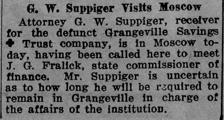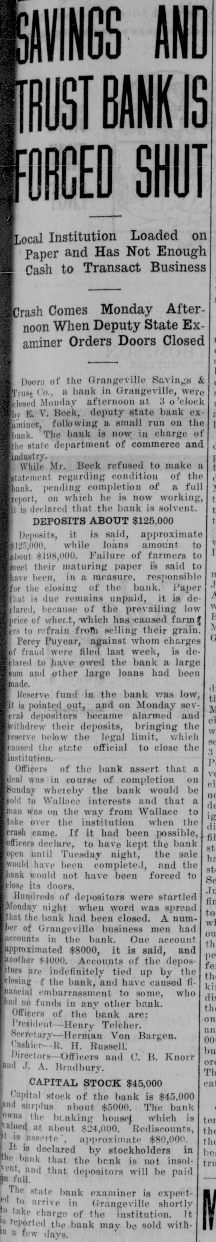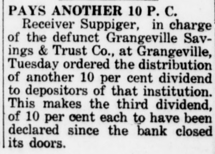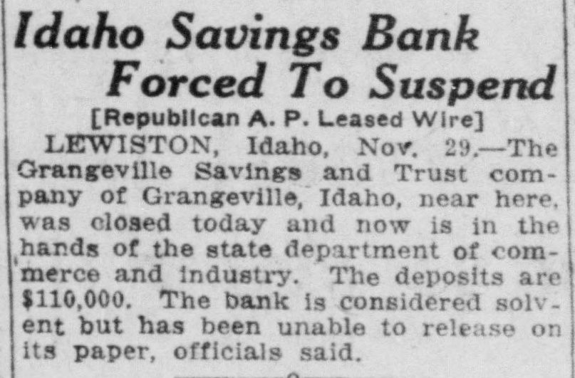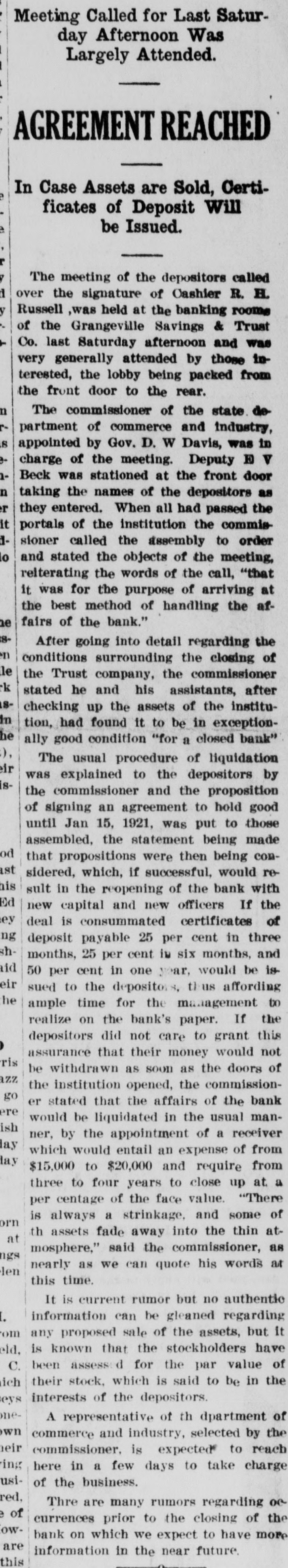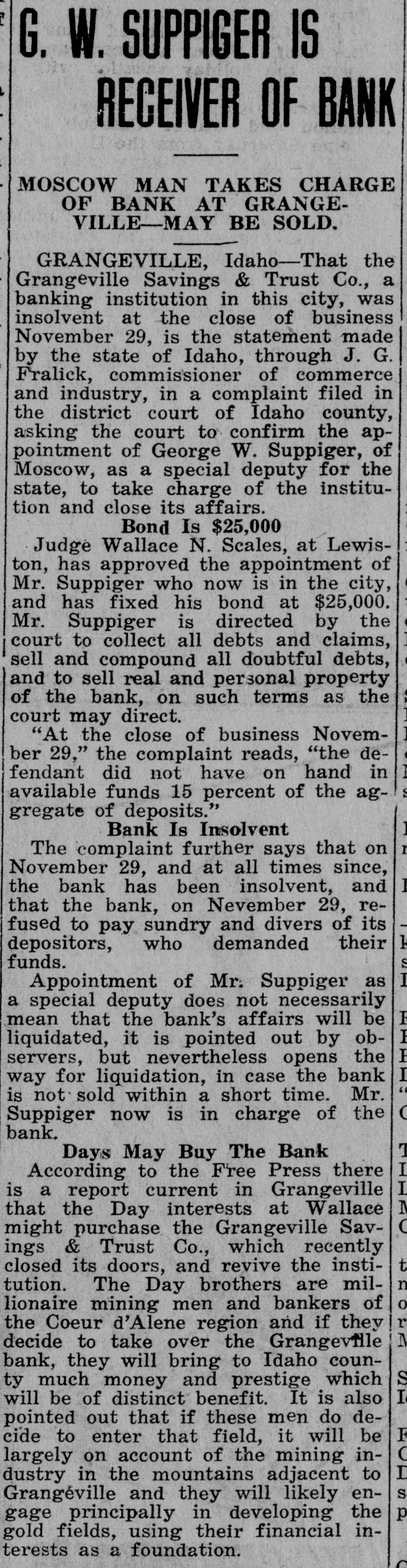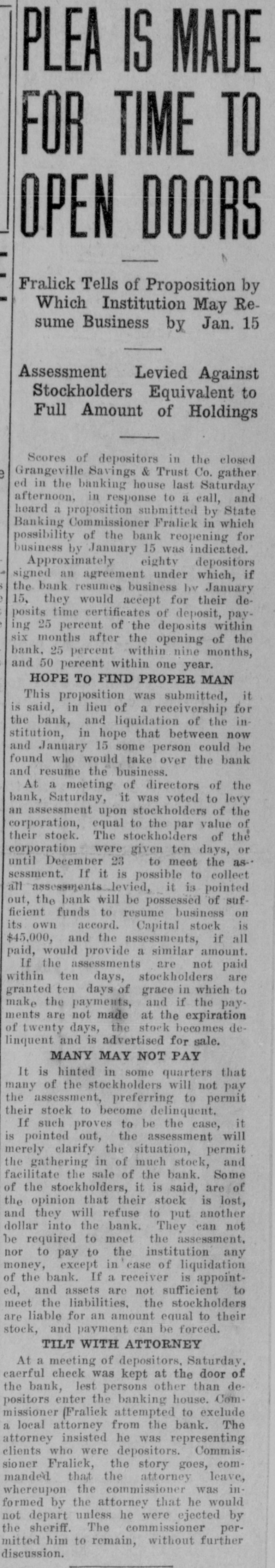 PLEA IS MADE FOR TIME TO OPEN DOORS Fralick Tells of Proposition by Which Institution May Resume Business by Jan. 15 Assessment Levied Against Stockholders Equivalent to Full Amount of Holdings Scores of depositors in the closed Grangeville Savings & Trust Co. gather ed in the banking house last Saturday afternoon, in response to a call, and heard a proposition submitted by State Banking Commissioner Fralick in which possibility of the bank reopening for business by January 15 was indicated. Approximately eighty depositors signed an agreement under which, if the bank resumes business by January 15, they would accept for their deposits time certificates of deposit, paying 25 percent of the deposits within six months after the opening of the bank, 25 percent within nine months, and 50 percent within one year. HOPE To FIND PROPER MAN This proposition was submitted, it is said, in lieu of a receivership for the bank, and liquidation of the institution, in hope that between now and January 15 some person could be found who would take over the bank and resume the business. At a meeting of directors of the bank, Saturday, it was voted to levy an assessment upon stockholders of the corporation, equal to the par value of their stock. The stockholders of the corporation were given ten days, or until December 23 to meet the assessment. If it is possible to collect all assessments levied, it is pointed out, the bank will be possessed of sufficient funds to resume business on its own accord. Capital stock is $45,000, and the assessments, if all paid, would provide a similar amount. If the assessments are not paid within ten days, stockholders are granted ten days of grace in which to make the payments, and if the payments are not made at the expiration of twenty days, the stock becomes delinquent and is advertised for sale. MANY MAY NOT PAY It is hinted in some quarters that many of the stockholders will not pay the assessment, preferring to permit their stock to become delinquent. If such proves to be the case, it is pointed out, the assessment will merely clarify the situation, permit the gathering in of much stock, and facilitate the sale of the bank. Some of the stockholders, it is said, are of the opinion that their stock is lost, and they will refuse to put another dollar into the bank. They can not be required to meet the assessment. nor to pay to the institution any money, except in case of liquidation of the bank. If a receiver is appointed, and assets are not sufficient to meet the liabilities, the stockholders are liable for an amount equal to their stock, and payment can be forced. TILT WITH ATTORNEY At a meeting of depositors, Saturday. caerful check was kept at the door of the bank, lest persons other than depositors enter the banking house. Commissioner (Fralick attempted to exclude local attorney from the bank The