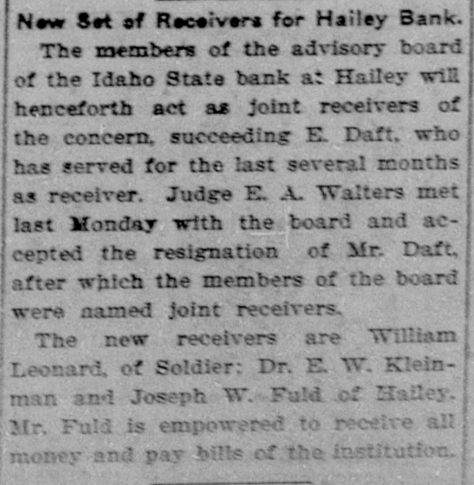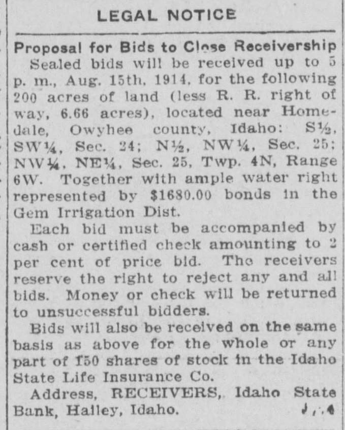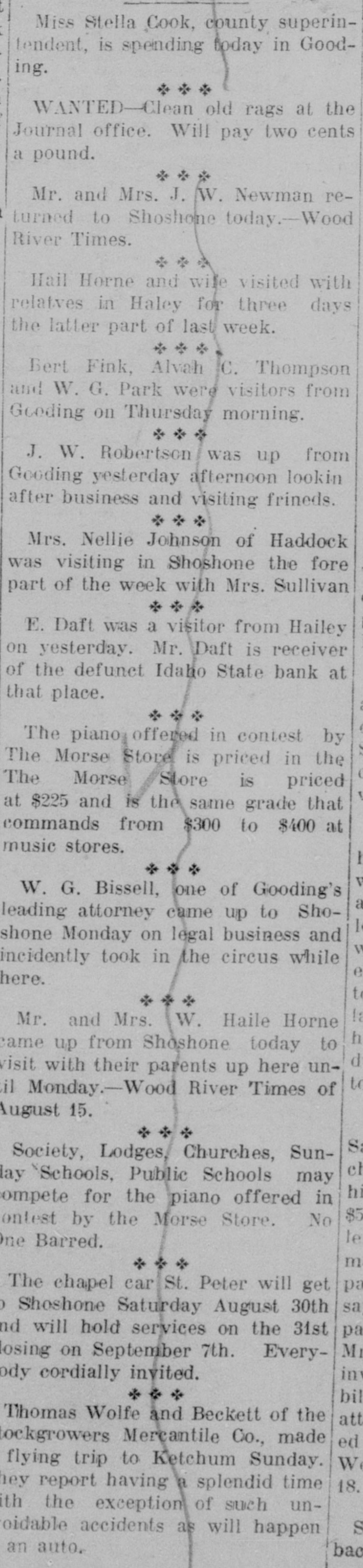 Miss Stella Cook, county superintendent, is spending today in Gooding. WANTED-Clean old rags at the Journal office. Will pay two cents a pound. * * * Mr. and Mrs. J. W. Newman returned to Shoshone today.-Wood River Times. Hail Horne and wife visited with relatves in Haley for three days the latter part of last week. Bert Fink, Alviah C. Thompson and W. G. Park were visitors from Geeding on Thursday morning. J. W. Robertson was up from Gooding yesterday afternoon lookin after business and visiting frineds. Mrs. Nellie Johnson of Haddock was visiting in Shoshone the fore part of the week with Mrs. Sullivan E. Daft was a visitor from Hailey on yesterday. Mr. Daft is receiver of the defunet Idaho State bank at that place. The piano offered in contest by The Morse Store is priced in the The Morse Store is priced at $225 and is the same grade that commands from $300 to $400 at music stores. * W. G. Bissell, one of Gooding's leading attorney came up to Shoshone Monday on legal business and incidently took in the circus while here. * Mr. and Mrs. W. Haile Horne came up from Shoshone today to visit with their parents up here unil Monday.-Wood River Times of August 15. * Sa Society, Lodges, Churches, Sunel lay `Schools, Public Schools may hi ompete for the piano offered in $5 onlest by the Morse Store. No le one Barred. m pa The chapel car St. Peter will get sa Shoshone Saturday August 30th nd will hold services on the 31st pa M1 losing on September 7th. Everyin ody cordially invited. e * * bil Thomas Wolfe and Beckett of the att tockgrowers Mercantile Co., made ed flying trip to Ketchum Sunday. W ley report having a splendid time 18. th the exception of such unoidable accidents as will happen an auto. bac