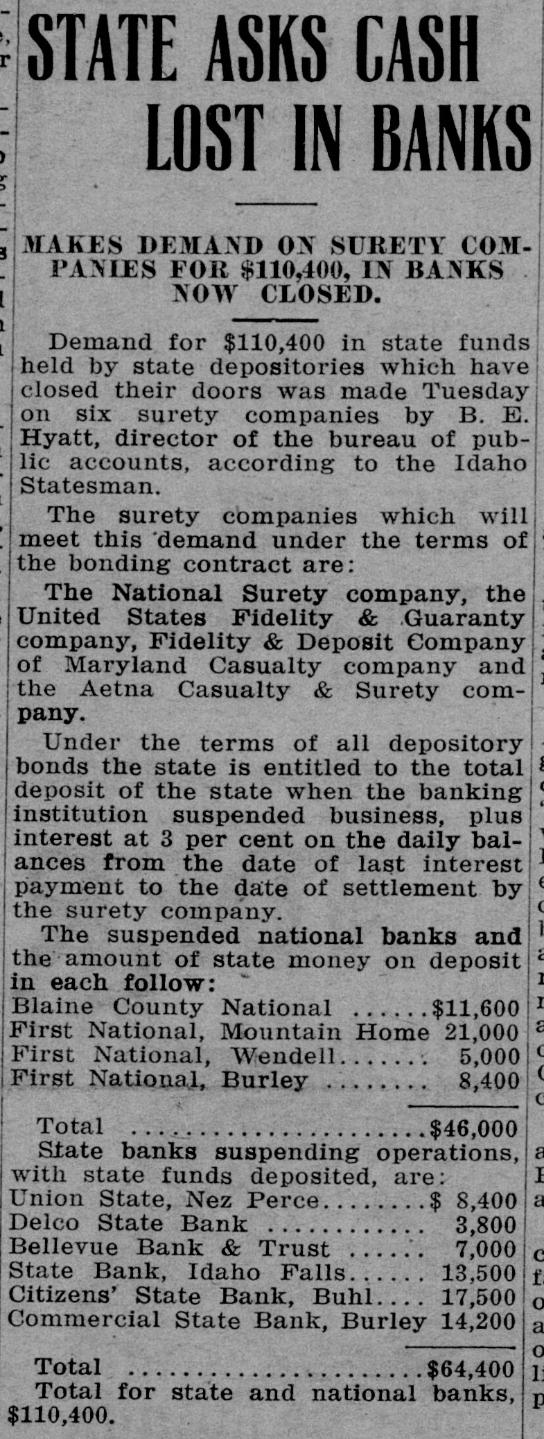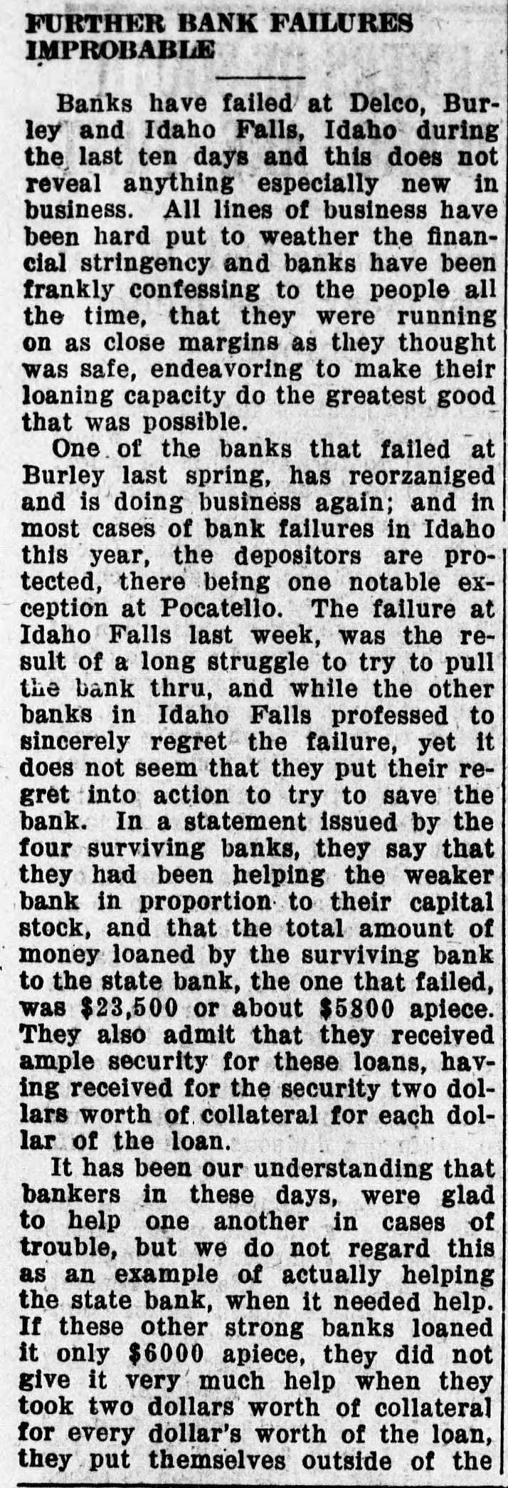 FURTHER BANK FAILURES IMPROBABLE Banks have failed at Delco, Burley and Idaho Falls, Idaho during the last ten days and this does not reveal anything especially new in business. All lines of business have been hard put to weather the financial stringency and banks have been frankly confessing to the people all the time, that they were running on as close margins as they thought was safe, endeavoring to make their loaning capacity do the greatest good that was possible. One of the banks that failed at Burley last spring, has reorzaniged and is doing business again; and in most cases of bank failures in Idaho this year, the depositors are protected, there being one notable exception at Pocatello. The failure at Idaho Falls last week, was the result of a long struggle to try to pull the bank thru, and while the other banks in Idaho Falls professed to sincerely regret the failure, yet it does not seem that they put their regret into action to try to save the bank. In a statement issued by the four surviving banks, they say that they had been helping the weaker bank in proportion- to their capital stock, and that the total amount of money loaned by the surviving bank to the state bank, the one that failed, was $23,500 or about $5800 apiece. They also admit that they received ample security for these loans, having received for the security two dollars worth of collateral for each dollar of the loan. It has been our understanding that bankers in these days, were glad to help one another in cases of trouble, but we do not regard this as an example of actually helping the state bank, when it needed help. If these other strong banks loaned it only $6000 apiece, they did not give it very much help when they took two dollars worth of collateral for every dollar's worth of the loan, they put themselves outside of the