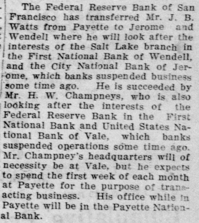 The Federal Reserve Bank of San Francisco has transferred Mr. J. B. Watts from Payette to Jerome and Wendell where he will look after the interests of the Salt Lake branch in the First National Bank of Wendell, and the City National Bank of Jerome, which banks suspended business some time ago. He is succeeded by Mr. H. W. Champneys, who is also looking after the interests of the Federal Reserve Bank in the First National Bank and United States National Bank of Vale, which banks suspended operations some time ago. Mr. Champney's headquarters will of necessity be at Vale, but he expects to spend the first week of each month at Payette for the purpose of transacting business. His office while In Payette will be in the Payette National Bank.