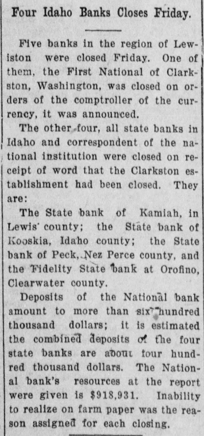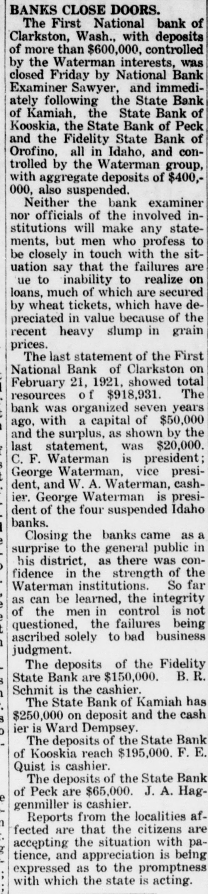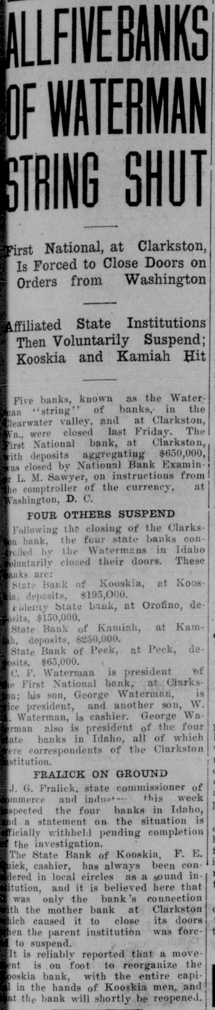 BANKS ALLFIVEL OF WATERMAN STRING SHUT First National, at Clarkston, Is Forced to Close Doors on Orders from Washington Affiliated State Institutions Then Voluntarily Suspend; Kooskia and Kamiah Hit Five banks, known as the Waterman "string" of banks, in the Clearwater valley, and at Clarkston, Wn., were closed last Friday. The First National bank, at Clarkston, with deposits aggregating $650,000, vas closed by National Bank ExaminL. M. Sawyer, on instructions from or at the comptroller of the currency, Washington, D. C. FOUR OTHERS SUSPEND Following the closing of the Clarkson bank, the four state banks controlled by the Watermans in Idaho oluntarily closed their doors. These anks are: State Bank of Kooskia, at Koostia, deposits, $195,000. Fidenty State bank, at Orofino, deposits, $150,000. State Bank of Kamiah, at Kamfah, deposits, $250,000. State Bank of Peck, at Peck, deposits, $65,000. C. F. Waterman is president of e First National bank, at Clarksis ton; his son, George Waterman, ace president, and another son, W. U. Waterman, is cashier. George Waerman also is président of the four ate banks in Idaho, all of which sere correspondents of the Clarkston institution. FRALICK ON GROUND J. G. Fralick, state commissioner of ommerce and indust this week inspected the four banks in Idaho, nd a statement on the situation is ficially withheld pending completion the investigation. The State Bank of Kooskia, F. E. mick, cashier, has always been condered in local circles as a sound in itution, and it is believed here that was only the bank's connection ith the mother bank at Clarkston hich caused it to close its doors men the parent institution was foreto suspend. It is reliably reported that a moveent is on foot to reorganize the ooskia bank, with the entire capiI in the hands of Kooskia men, and at the bank will shortly be reopened.