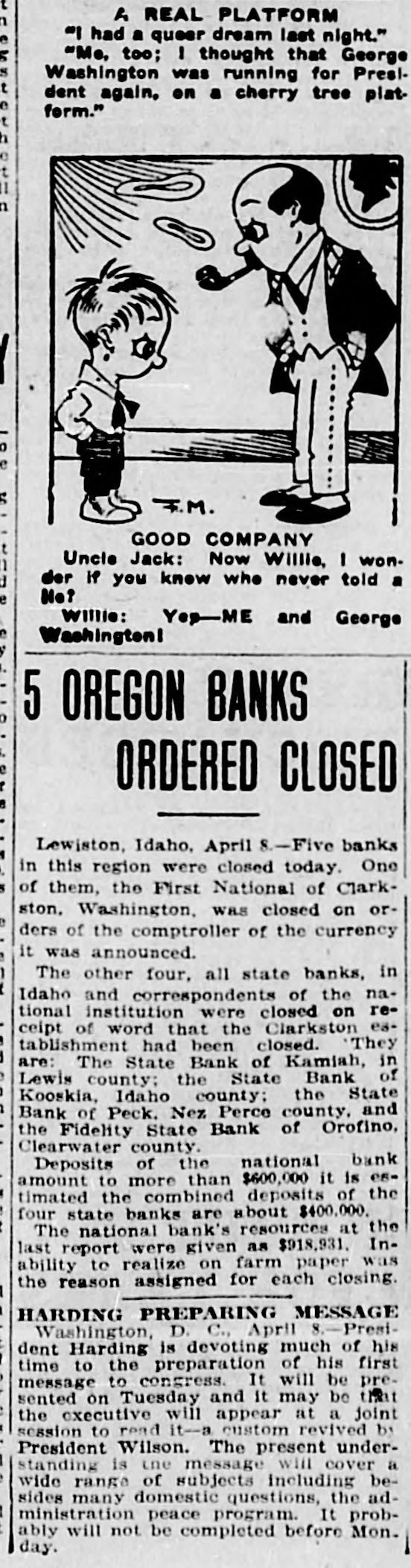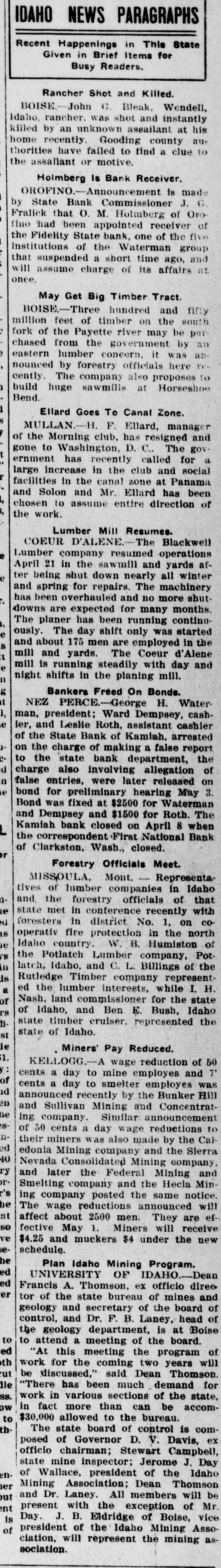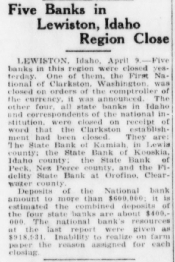 BANKS ALLFIVEL OF WATERMAN STRING SHUT First National, at Clarkston, Is Forced to Close Doors on Orders from Washington Affiliated State Institutions Then Voluntarily Suspend; Kooskia and Kamiah Hit Five banks, known as the Waterman "string" of banks, in the Clearwater valley, and at Clarkston, Wn., were closed last Friday. The First National bank, at Clarkston, with deposits aggregating $650,000, vas closed by National Bank ExaminL. M. Sawyer, on instructions from or at the comptroller of the currency, Washington, D. C. FOUR OTHERS SUSPEND Following the closing of the Clarkson bank, the four state banks controlled by the Watermans in Idaho oluntarily closed their doors. These anks are: State Bank of Kooskia, at Koostia, deposits, $195,000. Fidenty State bank, at Orofino, deposits, $150,000. State Bank of Kamiah, at Kamfah, deposits, $250,000. State Bank of Peck, at Peck, deposits, $65,000. C. F. Waterman is president of e First National bank, at Clarksis ton; his son, George Waterman, ace president, and another son, W. U. Waterman, is cashier. George Waerman also is président of the four ate banks in Idaho, all of which sere correspondents of the Clarkston institution. FRALICK ON GROUND J. G. Fralick, state commissioner of ommerce and indust this week inspected the four banks in Idaho, nd a statement on the situation is ficially withheld pending completion the investigation. The State Bank of Kooskia, F. E. mick, cashier, has always been condered in local circles as a sound in itution, and it is believed here that was only the bank's connection ith the mother bank at Clarkston hich caused it to close its doors men the parent institution was foreto suspend. It is reliably reported that a moveent is on foot to reorganize the ooskia bank, with the entire capiI in the hands of Kooskia men, and at the bank will shortly be reopened.
