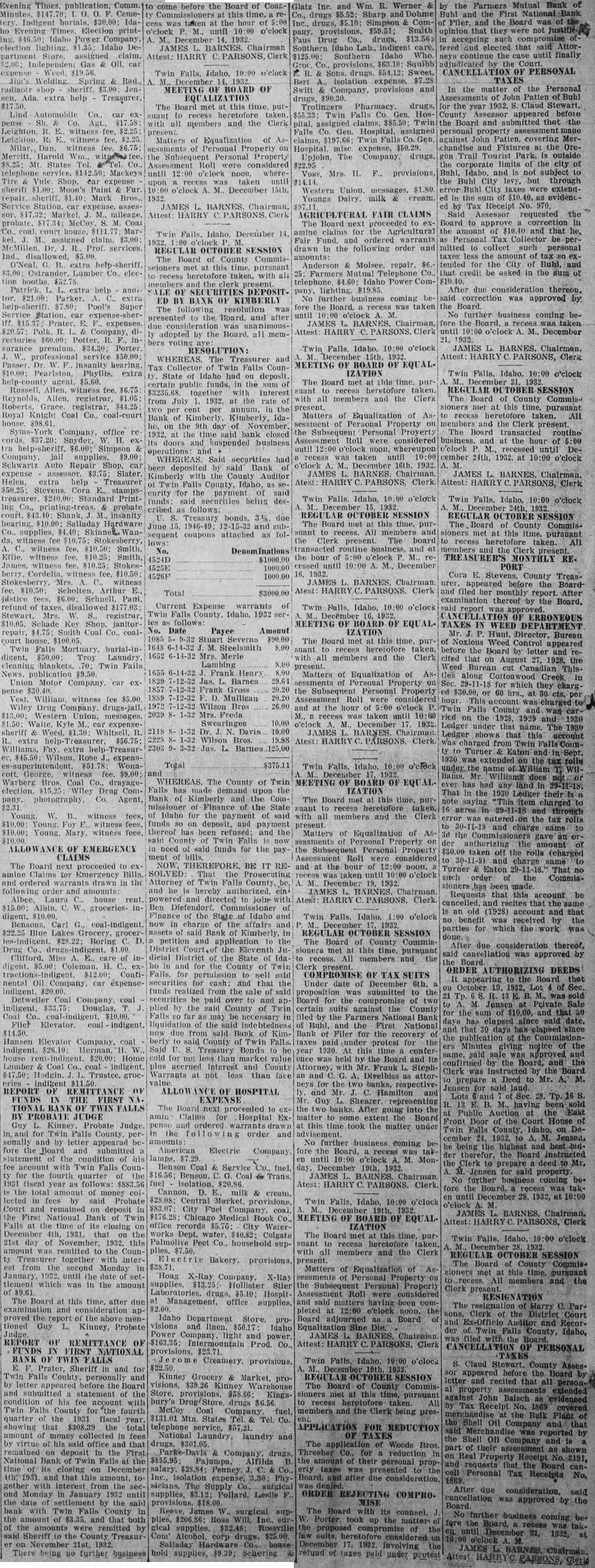 Evening publication, Comm. CemeIndigent Ida Evening printIdaho Power election Idaho De$2.00: Gas Oil, car Weed. Welding Spring Rad., radiaotr shop sheriff. extra help Treasurer, Lind $17.58 Leighton, witness fee, $2.25 Leighton, witness fee, Milar. Dan. witness fee Harold Mt. States Vule Shop. expense sheriff Moon's Paint Fur sheriff. Mark Bros. Station Markel mileage, probate, McCoy coal. assigned claim. Prof. Ind., extra $3.00: Lumber tion booths. extra help Pool's Super Service Station. car Prater. $20.57: Company, rectories Potter. surance premium. Porter professional service Passer insanity $10.00: extra Russell, Allen, witness fee Allen, registrar, Royal Knight Coal Co., coal-court $98.61. office H. help-sheriff, Simpson supplies, CLAIMS The Board next proceeded amine for Emergency Bills. and drawn in the following and amounts Laura house rent. Albin. groceriesBensons, Carl grocerDrug Clifford. $12.00; Continental Oil Company, car expenseDetweller Company coal Douglas, Coal Filer Elevator. Hansen Elevator Company coal house $20.00: Home Lumber Coal indikent REPORT OF OF FUNDS THE FIRST BANK OF TWIN FALLS BY PROBATE JUDGE Guy Kinney Probate Judge for Twin Falls County, sonally and by letter appearad fore the Board submitted statement condition of account with Twin Falls Counfourth quarter 1931 fiscal year as follows: total amount money collected said Probate Court and remained deposit the First National Bank at time its closing December 1931. the 21st of this was remitted the Countogether interfrom second Monday January, the tlement which was in the amount The Board at this time after due examination and proved tioned Kinney, Probate REPORT OF FUNDS FIRST NATIONAL BANK OF TWIN Sheriff in and for personally before the and statement of the of his fee Twin Falls County for fourth quarter the fiscal year showing $308.39 the total virtue office and that deposit the National the and this the January 1932 the by the Twin County the and that the the being further business come before the Board of this time, was taken until JAMES BARNES Chairman Attest: HARRY PARSONS, Twin Falls, Idaho. o'clock 1932. MEETING OF OF The Board met this time, suant taken all members and the Clerk Matters Equalization of Property the Property Roll considered until o'clock whereupon recess taken o'clock December 1932 JAMES BARNES. Chairman, Attest HARRY PARSONS Twin Falls, Idaho December 14. OCTOBER SESSION The Board County Commisthis time, recess taken, with ali DEPOSITED BY BANK KIMBERLY The resolution the Board. and after adopted by the Board. all memRESOLUTION: WHEREAS. Treasurer Tax Collector Twin Falls CounState Idaho had deposit. certain the sum $3235.68 with interest from July 1932. the of per the Bank Kimberly. Kimberly, ho, on the November 1932. said bank closed its doors suspended business Said securities had deposited by Bank Kimberly the County Auditor of Twin Falls County, Idaho, curity for the payment funds: securities being described follows: Treasury June 15. and sequent coupons attached as lows: No. 4524D $1000.00 4525E 1000.00 4526F Total Current Expense warrants of Falls County. Idaho. 1932 follows: No. Date Payee Amount Severns Steelsmith 1652 6-14-32 Mrs. Merle Lambing 8.00 Frank Henry 8.00 7-12-32 Jas. Barnes 29.64 7-12-32 Frank Gross 20.20 7-12-32 Mulligan 20.20 Wilson 26.00 Mrs. Freda Swearingen 10.00 Davis 10.00 Bros. 19.98 Barnes Total $375.11 WHEREAS. The County of Twin Falls has made upon the Bank of Kimberly the Comof the State Idaho for the said funds on payment thereof has been refused: and the County of Twin in need funds for the ment NOW, BE IT That Prosecuting Attorney of Twin Falls County, to Ben Finance of the State Idaho and charge the affairs and assets said Bank Kimberly, petition the District dicial District the State of and County Falls. permission sell cash and that funds realized from the sale said paid and plied by the said County far be necessary liquidation the said due Bank of KimCounty Twin Falls. Said Treasury Bonds sold not value accrued interest and County Warrants at not than and Mr. Hamilton EXPENSE Guy Shearer representing The Board next proceeded to the banks. After into the amin Claims Hospital Ex matter some extent the Board ordered warrants this time the matter under order and amounts No further business coming American Electric Company the Board, recess until o'clock MonBenson Coal Service December 19th. 1932 Coal Trans. JAMES BARNES fuel isolation. $20.86 HARRY PARSONS. Clerk. Cannon, & cream, Central provisions, Twin Falls, o'clock 19th, Chicago Medical Book MEETING OF BOARD OF office records City Water- IZATION works $40.82 Colgate The Board met this time, purPalmolive Peet Co., household suant recess heretofore with members and the Clerk provisions, present Matters Equalization of Hoag X-Ray Company, Property supplies, Hollister Stier the Personal Property Laboratories. Hospit Assessment Roll were considered Management, office supplies, said matters pleted 12:00 o'clock Idaho Department pro- adjourned Board visions linen. $50.17 Equalization Sine Die. Idaho Power Company, power, JAMES $163.35 HARRY Prod. Co. PARSONS, Clerk Creamery, provisions, Twin Falls, Idaho. o'clock Kinney Grocery Market, OCTOBER SESSION provisions, Kinney The Board of County Commisprovisions, Kings- sioners at this time, pursuant recess All McCoy Company members and the Clerk being presStates Tel. Co. telephone service, FOR National Laundry, and laundry drugs, The Woods Bros. Company, drugs, Thresher Co., for reduction Alfilda personal Penney taxes expense, Phy Board, after sicians, The Supply supplies, Pollard. Leslie ORDER REJECTING COMPROMISE surgical The Board its sup- counsel. $206.86 up the compromise of Alcohol Salladay 1932 involving supplies, Schering refund taxes under protest and Wm. R. Werner drugs Comprovisions, $59.51; Smith Faus Drug drugs, indigent care. Southern Idaho Who. provisions, Squibb Sons, drugs. $54.12: Sweet, Bert expense, $7.28 Company, provisions and