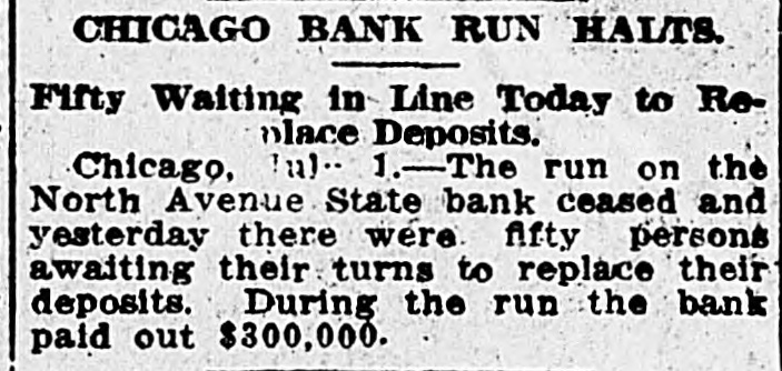 15 years ago. Evanston housewives called poor managers by business men. Blame late shopping for keeping open Saturday. Thirty patients transferred from old detention hospital to new psychopathic ward. Bureau formed by mayors of New York, Philadelphia and Chicago to protect cities from public service corporations. Bonds of eHrman Schmitz, Robert E. Malone and Frank P. McMahon, in jury bribing scandal, fixed at $10,000. Former Mayor Schank, Indianapolis, had stranger watch $5,000 auto. Both gone. Frank Wallace, 3200 W. Lake st., arrested. Alleged to have taken stolen money from Hazel Martin, 19, while posing at "state's attorney man." Loop banks furnishing funds to stop run on North Avenue State Bank. $200,000 withdrawn Saturday. Morgan Park's only movie show failed to open yesterday. Sunday school attendance increased. Vernon L. Bean, Chief Gleason's secretary, charged with violating civil service rule. Alleged to have outside business as attorney. Tony Jacobs, 18, and Bernard Hermanoeky, 18, arrested while trying to force entrance to tailor shop. M. Weinberg, 720 Maxwell st., wants warrant for arrest of Ald. Matt Franz, 20th Ward. Alleges he was slugged for insult to Franze. John Vegan, unemployed, hit by auto at Michigan av. and Adams st. Dead. Isaac Reeder and Isaac Contui went rowing on lake. Lost oars. Rescued by tug. Two thousand more lights to be installed by sanitary district. 14,000 nitrogen lamns to be nut in use July 6