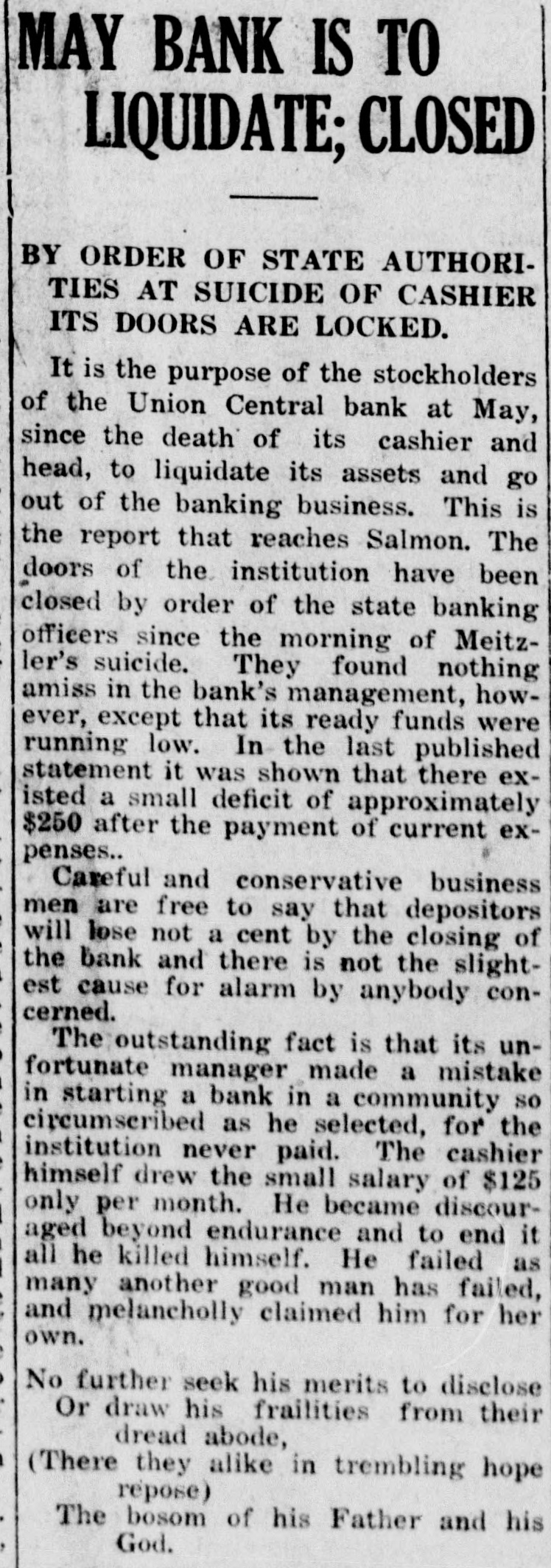 CHALLIS, IDA., WEDNESDAY, SEPTEMBER 7, 1921 LAW PROVIDES FOR PUBLICA. MAY BANK IS TO LIQ. TION OF SCHOOL REPORT UIDATE; CLOSED Like all other institutions the public It is the purpose of the stockolders schools have been hit by the prevailof the Union Central bank at May, since the death of its cashier and ing tightening process of getting back to normalcy. This condition goes head, to lipuidate its assets and go who hard with the average citizen out of the banking business. This is as holds the public school system he report that reaches Challis. The doors of the institution have bee. nearest to his heart. He may be indifferent as to how go the other afclosed by order of the state banking but fairs of public administration officers since the morning of Meitz with the schools it is different. ler's suicide. They found nothing i Numbers of the best towns in Ida miss in the bank's management, how ho are struggling with present probever, except that its ready funds were lems of how to keep their schools running low. In the last published statement it was shown that there ex running. Notably among these are Arco, Twin Falls, Buhl and Nampa sted a small deficit of approximately which are rich and populous with $250 after the payment of current ex enses. communities surrounding them also Careful and conservative busines: ich. These have found it necessary to eliminate unnecessary expenses in nen are free to say that depositore g nswer to the demands that expendi will lose not a cent by the closing o ures be held within resources. Orna the bank and there is not the slight S mental teachers and unessential sul est cause for alarm by anybody con n cerned. fects have been ruthlessly cut out L The outstanding fact is that its un Taxpayers are insisting that there shall be no idlers among the teachers fortunate manager made a mistake n starting a bank in a community S but that all shall be employed all the time. circumscribed as he selected, for th institution never paid. The cashie Moreover it is insisted that the pub lic be taken into the confidence of himself drew the small salary of $12 a only per month. He became discou chool administrators by detailed pui ications of school affairs, for what ged beyond endurance and to end i ill he killed himself. He failed a nd to whom school moneys are paid and from what sources they are demany another good man has failed lived. The last legislature of th nd melancholly claimed him for he W own. state of Idaho, heeding this demand, S No further seek his merits to disclos passed a mandatory law to the same Or draw his frailties from thei nd, which is found at Paragraph 18 S dread abode, Section 46, Chapter 219, as follows: It is the duty of the Board of (There they alike in trembling hop at repose) School Trustees to make report 1g The bosem of his father and hi: in writing on the first day of July, in God. of the financial condition of their
