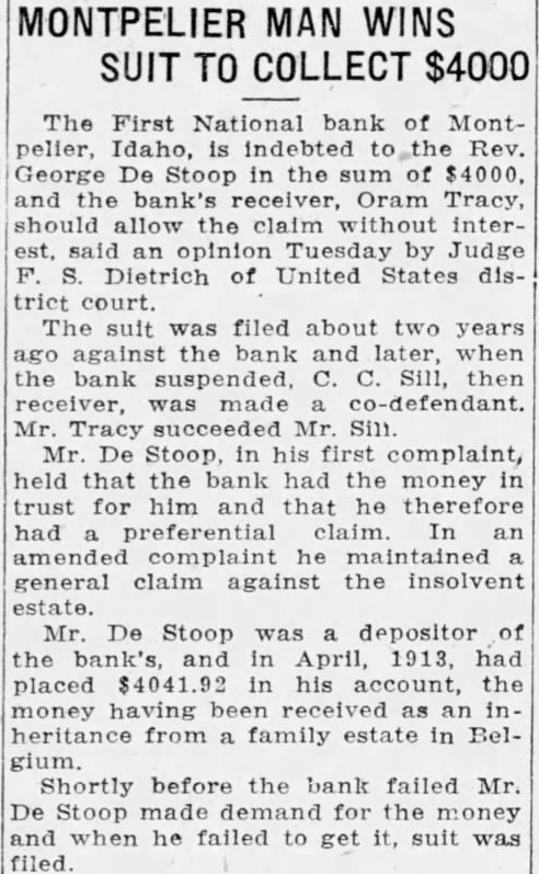 MONTPELIER MAN WINS SUIT TO COLLECT $4000 The First National bank of Montpelier, Idaho, is indebted to the Rev. George De Stoop in the sum of $4000, and the bank's receiver, Oram Tracy, should allow the claim without interest, said an opinion Tuesday by Judge F. S. Dietrich of United States district court. The suit was filed about two years ago against the bank and later, when the bank suspended, C. C. Sill, then receiver, was made co-defendant. Mr Tracy succeeded Mr. Sill. Mr. De Stoop. in his first complaint, held that the bank had the money in trust for him and that he therefore had a preferential claim. In an amended complaint he maintained general claim against the insolvent estate. Mr. De Stoop was a depositor of the bank's, and in April, 1913, had placed $4041.92 in his account, the money having been received as an inheritance from a family estate in BelShortly before the bank failed Mr. De Stoop made demand for the money and when he failed to get it, suit was filed.