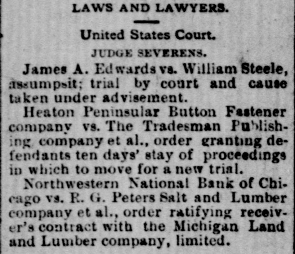LAWS AND LAWYERS. I United States Court. JUDGE SEVERENS. James A. Edwards vs. William Steele, assumpsit; trial by court and cause taken under advisement. Heaton Peninsular Button Fastener company vs. The Tradesman Publishing company et al., order granting defendants ten days' stay of proceedings in which to move for a new trial. Northwestern National Bank of Chicago vs. R. G. Peters Salt and Lumber company et al., order ratifying receiver's contract with the Michigan Land and Lumber company, limited.