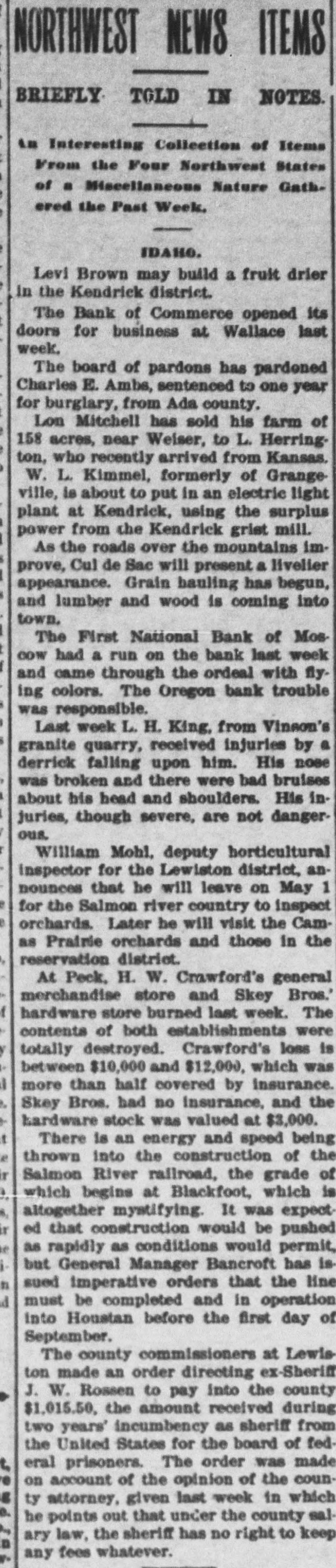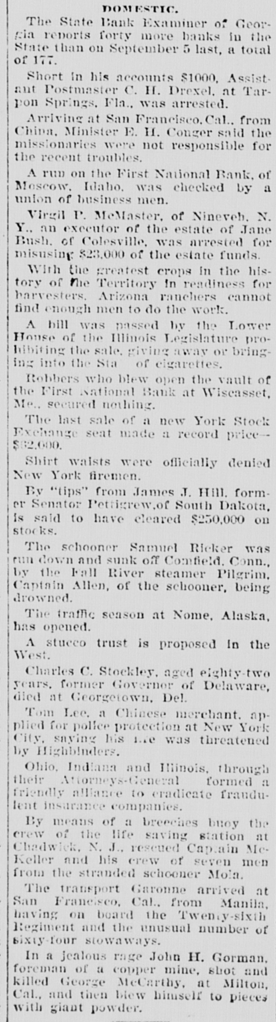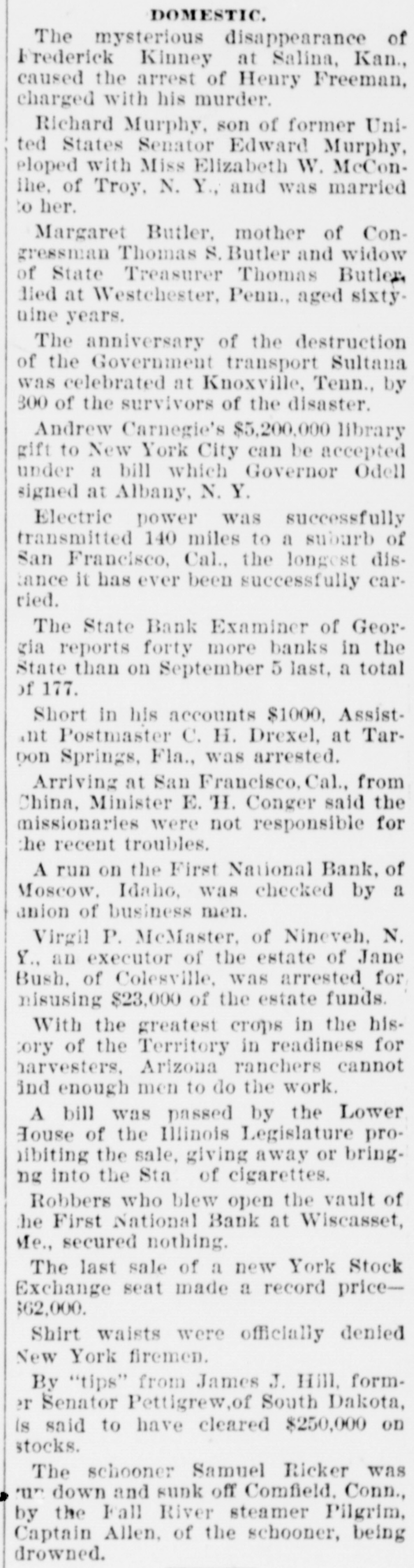 DOMESTIC. The mysterious disappearance of Frederick Kinney at Salina, Kan., caused the arrest of Henry Freeman, charged with his murder. Richard Murphy, son of former United States Senator Edward Murphy, eloped with Miss Elizabeth W. McConihe, of Troy, N. Y., and was married to her. Margaret Butler, mother of Congressman Thomas S. Butler and widow of State Treasurer Thomas Butler, died at Westchester, Penn., aged sixtynine years. The anniversary of the destruction of the Government transport Sultana was celebrated at Knoxville, Tenn., by 300 of the survivors of the disaster. Andrew Carnegie's $5,200,000 library gift to New York City can be accepted under a bill which Governor Odell signed at Albany, N. Y. Electric power was successfully transmitted 140 miles to a suburb of San Francisco, Cal., the longest distance it has ever been successfully carried. The State Bank Examiner of Georgia reports forty more banks in the State than on September 5 last, a total of 177. Short in his accounts $1000, Assistant Postmaster C. H. Drexel, at Tarpon Springs, Fla., was arrested. Arriving at San Francisco, Cal., from China, Minister E. 'H. Conger said the missionaries were not responsible for :he recent troubles. A run on the First National Bank, of Moscow. Idaho, was checked by a anion of business men. Virgil P. McMaster. of Nineveh. N. Y., an executor of the estate of Jane Bush, of Colesville, was arrested for misusing $23,000 of the estate funds. With the greatest crops in the hisory of the Territory in readiness for harvesters. Arizona ranchers cannot ind enough men to do the work. A bill was passed by the Lower House of the Illinois Legislature prohibiting the sale, giving away or bringng into the Sta of cigarettes. Robbers who blew open the vault of the First National Bank at Wiscasset, Me., secured nothing. The last sale of a new York Stock Exchange seat made a record price$62,000. Shirt waists were officially denied New York firemen. By "tips" from James J. Hill, former Senator Pettigrew, of South Dakota, Is said to have cleared $250,000 on stocks. The schooner Samuel Ricker was 'un down and sunk off Comfield. Conn., by the Fall River steamer Pilgrim, Captain Allen, of the schooner, being drowned.