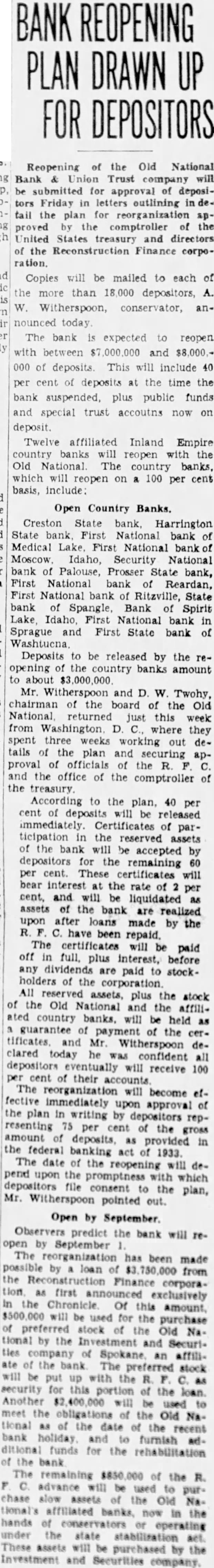 BANK REOPENING PLAN DRAWN UP FOR DEPOSITORS Reopening of the Old National Bank Trust will submitted for of deposiFriday outlining the plan for reorganization approved by the comptroller the United States treasury and directors of the Reconstruction Finance corporation. Copies will be mailed to each of the than depositors, A. W. Witherspoon, conservator, announced today. The bank is expected to reopen with between $7,000,000 and $8,000.000 of deposits. This will include 40 per cent of deposits at the time the bank suspended, plus public funds and special trust accoutns now on deposit. Twelve affiliated Inland Empire banks will the Old National The country banks, which will reopen on 100 per cent basis, include: Open Country Banks. Creston State bank, Harrington State bank, First National bank of Medical First National bank Moscow. Idaho, Security National Palouse, Prosser State bank, First National Reardan, First National Ritzville, State bank Spangle, Bank Spirit Lake, Idaho National Sprague and First State bank of Washtucna Deposits be released by the reopening the country banks amount to Mr. Witherspoon and W. Twohy, chairman the board of the Old National, returned just this week from Washington D. where they spent three weeks working out details of the plan and approval of officials of the and the office of the comptroller of the According to the plan, 40 per cent deposits will be released immediately. Certificates of participation in the reserved assets of the bank will be accepted by depositors the remaining 60 per These certificates will interest at the rate of per cent. and will be liquidated assets of the bank are realized upon after loans made by the repaid. The certificates will be paid off in full, plus interest, before any are paid stockholders the corporation. All plus the stock of the Old National and the affillated country banks, will be held as guarantee of the certificates and Mr. Witherspoon declared he confident all depositors eventually will receive 100 per cent of their The reorganization will become effective immediately upon approval of the plan in writing by representing cent of the gross amount deposits, as provided in the federal banking act of 1933. The date of the will depend upon the promptness with which depositors file consent the plan, Mr. Witherspoon pointed out. Open by September Observers predict the bank will reby September The reorganization has been made by loan of from the corporation as first exclusively the Chronicle Of this amount will be used for the purchase of preferred stock of the Old tional by the Investment and Securiate the bank preferred stock will be put with the security for this portion of the Another 400 will be used meet the obligations the Old tional of the date the recent bank furnish ditional funds for the rehabilitation of bank remaining of the advance chase the Old Na. affiliated now in the conservators operating the state stabilization These assets will purchased by the and Securities