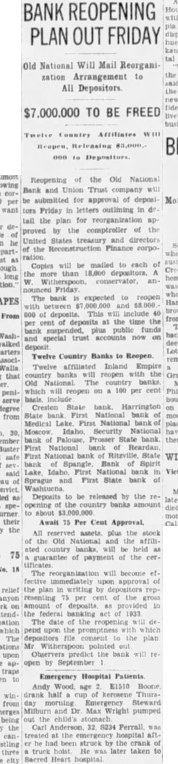 BANK REOPENING PLAN OUT FRIDAY Old National Will Mail Reorganization Arrangement to All Depositors $7,000,000 TO BE FREED Affiliates Releasing Reopening of the Old National Bank and Union Trust company will be submitted for approval of Friday in letters outlining in tall the plan for reorganization proved by the comptroller the United States treasury and directors of the Reconstruction Finance ration Copies will be mailed to each of the than 18,000 depositors. W. anFriday The bank is expected to reopen with between and This will include 40 000 of deposits. per cent of deposits at the time the bank plus public funds and special trust accounts now on deposit Twelve Country Banks to Reopen Twelve affiliated Inland Empire will reopen with the Old National. The country which will reopen on a 100 per cent Creston bank. Harrington State bank National bank of Medical Lake. First National bank of Moscow Idaho, Security National have bank of Palouse, Prosser bank. there First National bank of Reardan. First National bank Ritzville, State bank Bank of Spirit Lake, Idaho. First National bank in Sprague and First State bank of Deposits to be released by the relate opening of the banks amount to about Await 75 Per Cent Approval. All reserved assets plus the stock of the Old National and the affiliated country will be held as guarantee of payment of the cerThe reorganization will become effective immediately upon approval of the plan in writing by representing 75 per cent of the gross amount of deposits as provided in the federal banking act of 1933 The date of the will de pend upon the promptness with which file consent to the plan Mr Witherspoon predict the bank will reopen by September Emergency Hospital Patients Andy Wood. age E1510 Boone drank half cup of Thursday Emergency Steward Milburn and Dr Max Wright pumped out the child's Carl Anderson 32. S234 Ferrall was treated the emergency hospital er he had been struck by the crank of truck hoist. He was later taken to Sacred Heart