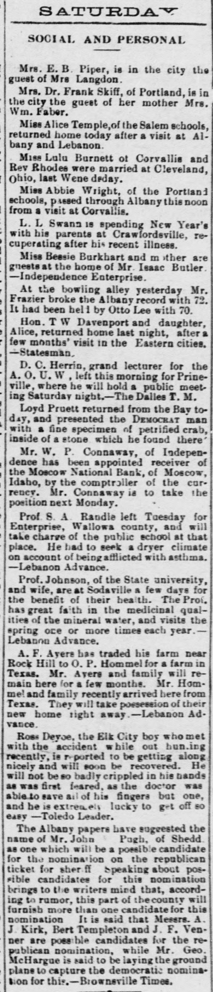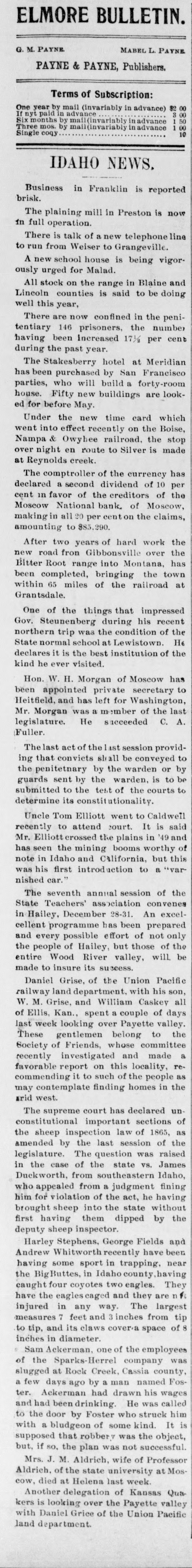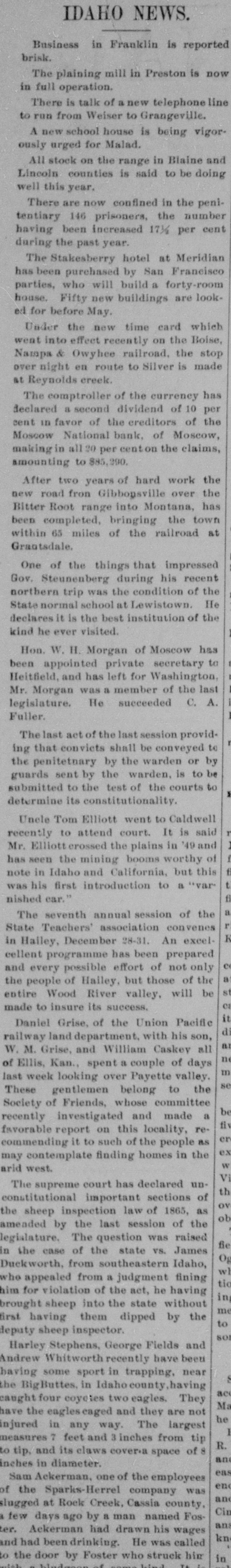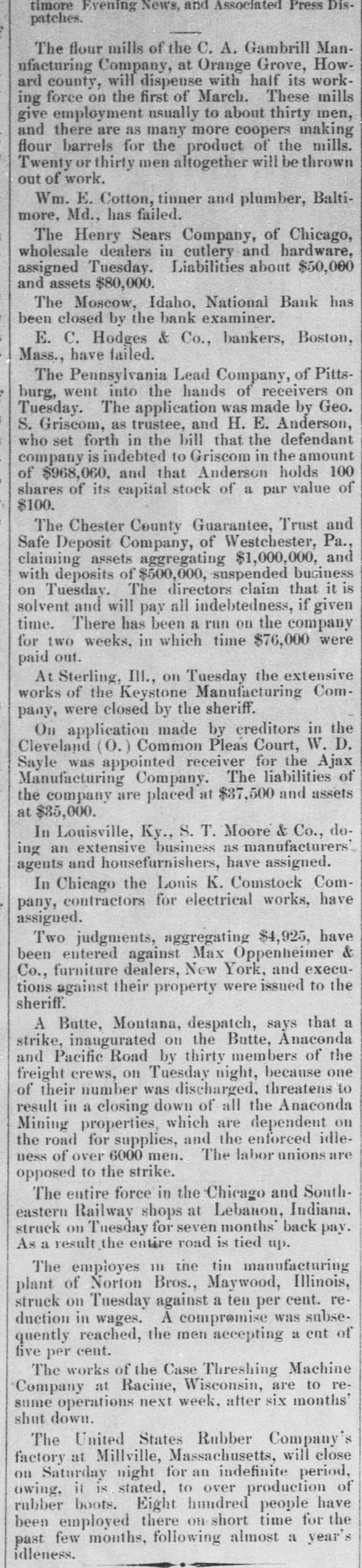 Telegraphic Briefs. Charleston, S. C.-Bill Dodgins died in Pickens county, S. C., aged 103 years. New Orleans.-Cardipal Gibbons arrived in the city on a short visit to relatives. New Orleans.-Edward Conery, Sr., the well-known millionaire merchant, died. New Orleans.-George R. Finley, head of the large drug firm of Finley, Dicks, & Co., died. London -Thomas Batement, who was twice president of the Primitive Methodist Conference, is dead. New Orleans.-E. Conrey, Sr., the steamboat king of the South, and one of New Orleans's wealthiest citizens, died. Salt Lake, Utah.-The day's three ballots in the State Legislature for United States Senator developed no material change. Rome, Italy -The University was closed, owing to riotous conduct on the part of the students. Several of the ringleaders were arrested. Spokane, Wash.-The First National Bank of Oakdale, Spokane county, has gone into voluntary liquidation. Depositors are notified to come and get their money. London-The House of Commons, by a vote of 325 to 110, passed the financial proposal in the educational bill to grant to voluntary schools the sum of 5 shillings per child. New Orleans.-The House River and Harbor Committee arrived in the city this morning from Texas, and left immediately on their return trip. They will stop over at Birmingham, and be entertained there. Moscow, Idaho-The Moscow National Bank was closed by Bank-Examiner Eugene I. Wilson, of Ellenburg, acting under the orders of Comptroller Eckels. R. C. Brown is president, and C. M. Brune, cashier. Pittsburg, Pa.-In the Court of Common Pleas, George S. Griscom and H. E. Anderson were appointed receivers for the Pennsylvania Lead Company, of Pittsburg. Judgment was confessed to Trustee Griscom for $949,000. New York.-Bob Fitzsimmons expects to start for Nevada on February 12th, as he wishes to have four weeks' hard training for the big fight. It is likely that a watering-place about three miles from Carson City will be selected. London -Edward R. Taylor, alias Arthur W. Platt, who is under arrest for killing Jesse Tyree in Kentucky, in 1885, was formally extradited in the BowStreet Police Court, and will be taken to America at once by Kentucky officials. Charleston, S. C-A letter from Admiral Bunce to Mayor Smith, says that nearly all the ships of the squadron of evolution will come into the harbor after the manoeuvres outside, and that an exchange of courtesies will be in order, Madrid.-The Infanta Marie Louise Ferdinande, Duchess of Montpensier, is dead; aged 65 years. She was a sister of ex-Queen Isabella II., of Spain; grandmother of the King of Spain, and was married in 1846 to the Duke of Montpensier, who died in 1890. Canton. O.-There are over one hundred cases of typhoid-fever in the city, The cause is attributed to the water-supply. There have been several deaths, Mrs. Emma Troll, formerly an amanuensis for Major McKinley, being among those who have succumbed to the disease. Sterling, Ill-The extensive works of the Keystone Manufacturing Company. Thomas A, Galt president, were closed by the Sheriff, on a levy made in favor of Mr. Galt for $89,085. and the First National Bank of Sterling for $9,996. The Keystone company manufactured all kinds of farming implements.
