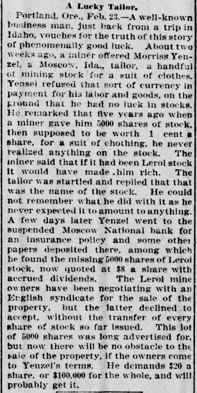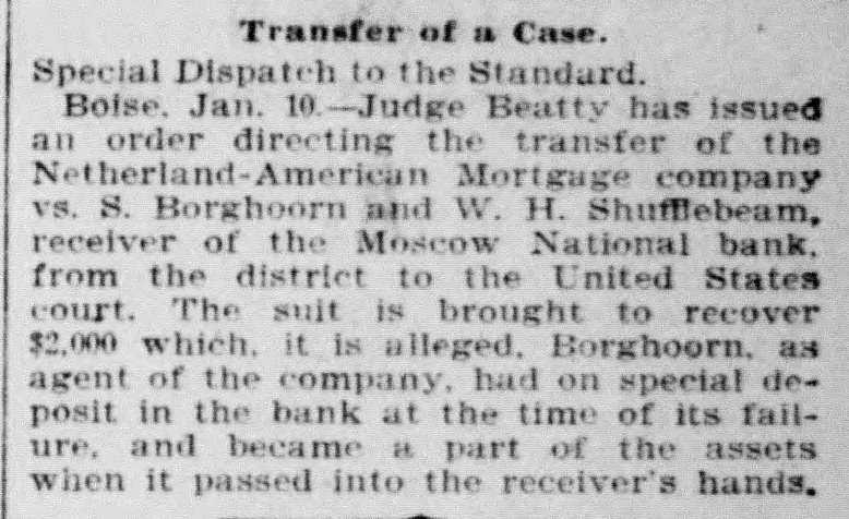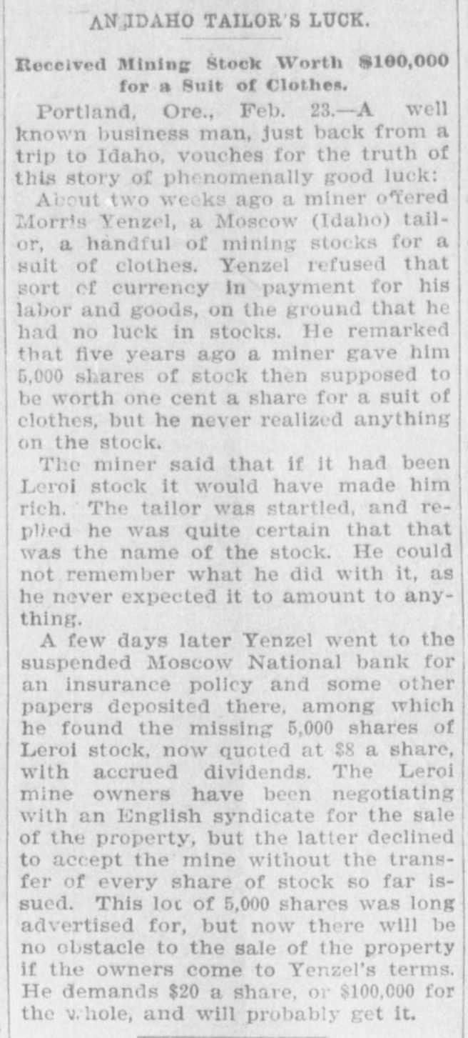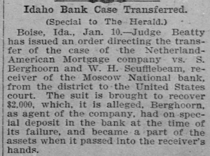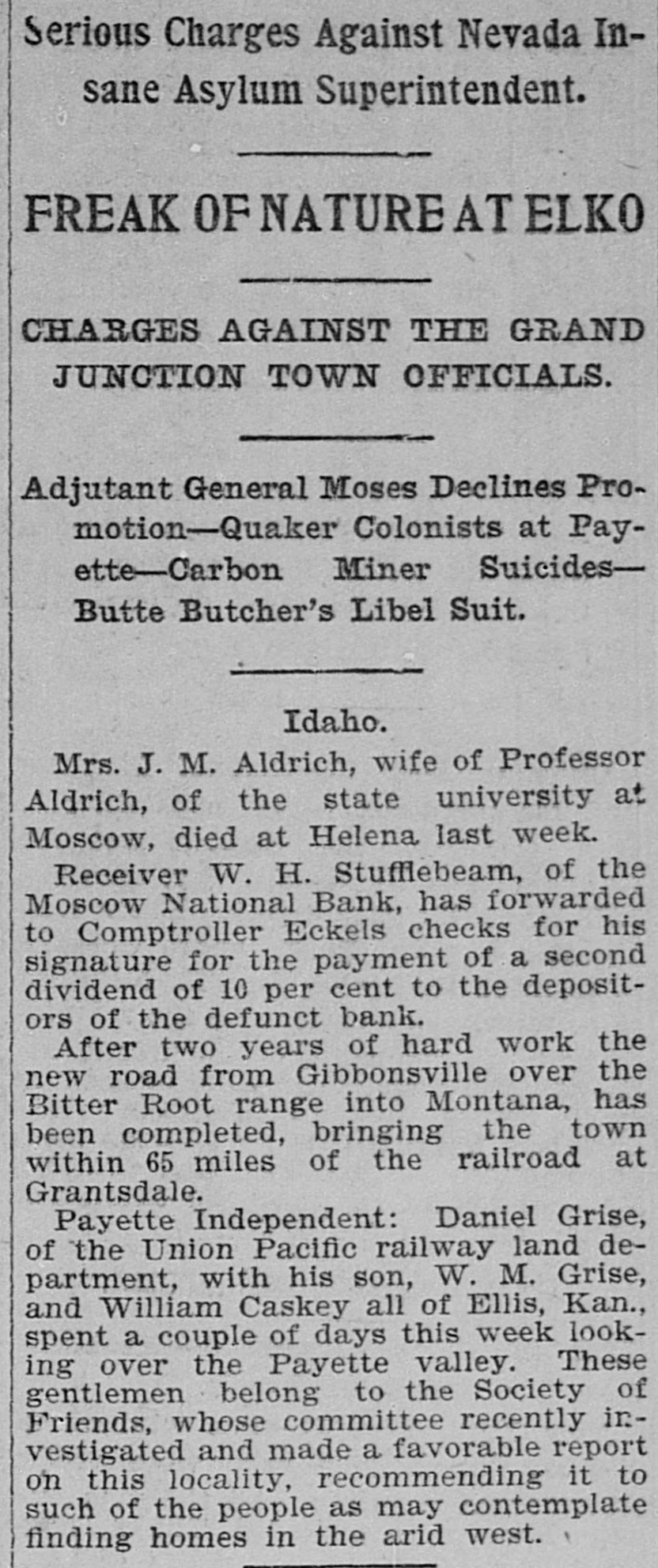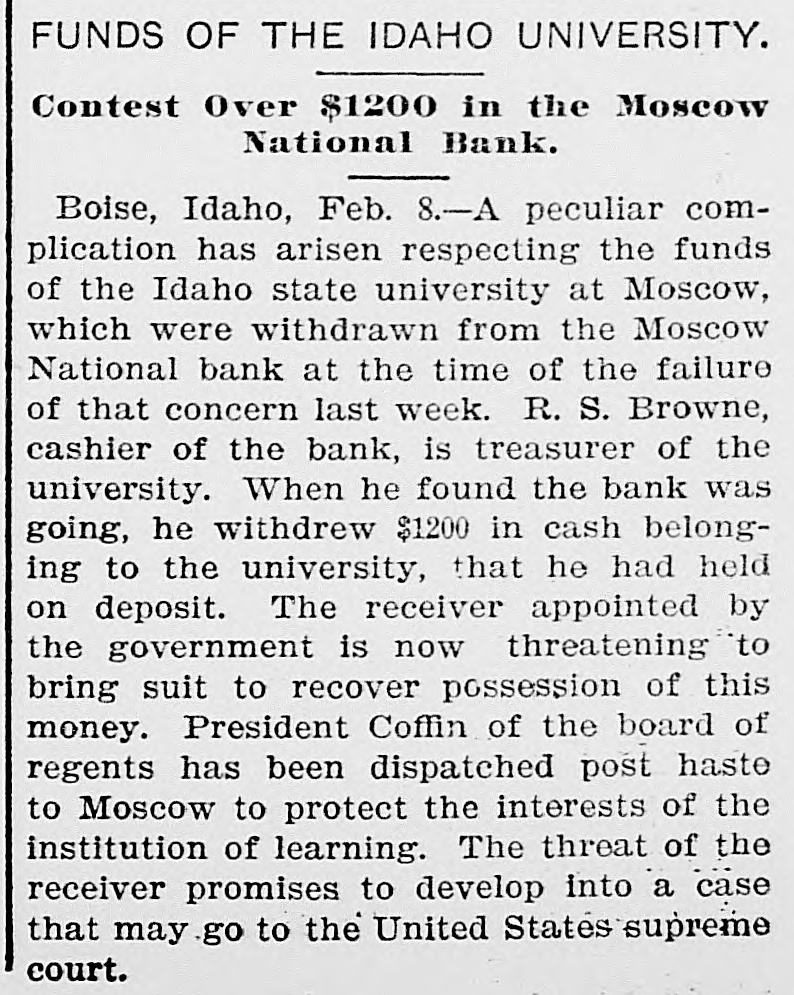 Telegraphic Briefs. Charleston, S. C.-Bill Dodgins died in Pickens county, S. C., aged 103 years. New Orleans.-Cardipal Gibbons arrived in the city on a short visit to relatives. New Orleans.-Edward Conery, Sr., the well-known millionaire merchant, died. New Orleans.-George R. Finley, head of the large drug firm of Finley, Dicks, & Co., died. London -Thomas Batement, who was twice president of the Primitive Methodist Conference, is dead. New Orleans.-E. Conrey, Sr., the steamboat king of the South, and one of New Orleans's wealthiest citizens, died. Salt Lake, Utah.-The day's three ballots in the State Legislature for United States Senator developed no material change. Rome, Italy -The University was closed, owing to riotous conduct on the part of the students. Several of the ringleaders were arrested. Spokane, Wash.-The First National Bank of Oakdale, Spokane county, has gone into voluntary liquidation. Depositors are notified to come and get their money. London-The House of Commons, by a vote of 325 to 110, passed the financial proposal in the educational bill to grant to voluntary schools the sum of 5 shillings per child. New Orleans.-The House River and Harbor Committee arrived in the city this morning from Texas, and left immediately on their return trip. They will stop over at Birmingham, and be entertained there. Moscow, Idaho-The Moscow National Bank was closed by Bank-Examiner Eugene I. Wilson, of Ellenburg, acting under the orders of Comptroller Eckels. R. C. Brown is president, and C. M. Brune, cashier. Pittsburg, Pa.-In the Court of Common Pleas, George S. Griscom and H. E. Anderson were appointed receivers for the Pennsylvania Lead Company, of Pittsburg. Judgment was confessed to Trustee Griscom for $949,000. New York.-Bob Fitzsimmons expects to start for Nevada on February 12th, as he wishes to have four weeks' hard training for the big fight. It is likely that a watering-place about three miles from Carson City will be selected. London -Edward R. Taylor, alias Arthur W. Platt, who is under arrest for killing Jesse Tyree in Kentucky, in 1885, was formally extradited in the BowStreet Police Court, and will be taken to America at once by Kentucky officials. Charleston, S. C-A letter from Admiral Bunce to Mayor Smith, says that nearly all the ships of the squadron of evolution will come into the harbor after the manoeuvres outside, and that an exchange of courtesies will be in order, Madrid.-The Infanta Marie Louise Ferdinande, Duchess of Montpensier, is dead; aged 65 years. She was a sister of ex-Queen Isabella II., of Spain; grandmother of the King of Spain, and was married in 1846 to the Duke of Montpensier, who died in 1890. Canton. O.-There are over one hundred cases of typhoid-fever in the city, The cause is attributed to the water-supply. There have been several deaths, Mrs. Emma Troll, formerly an amanuensis for Major McKinley, being among those who have succumbed to the disease. Sterling, Ill-The extensive works of the Keystone Manufacturing Company. Thomas A, Galt president, were closed by the Sheriff, on a levy made in favor of Mr. Galt for $89,085. and the First National Bank of Sterling for $9,996. The Keystone company manufactured all kinds of farming implements.