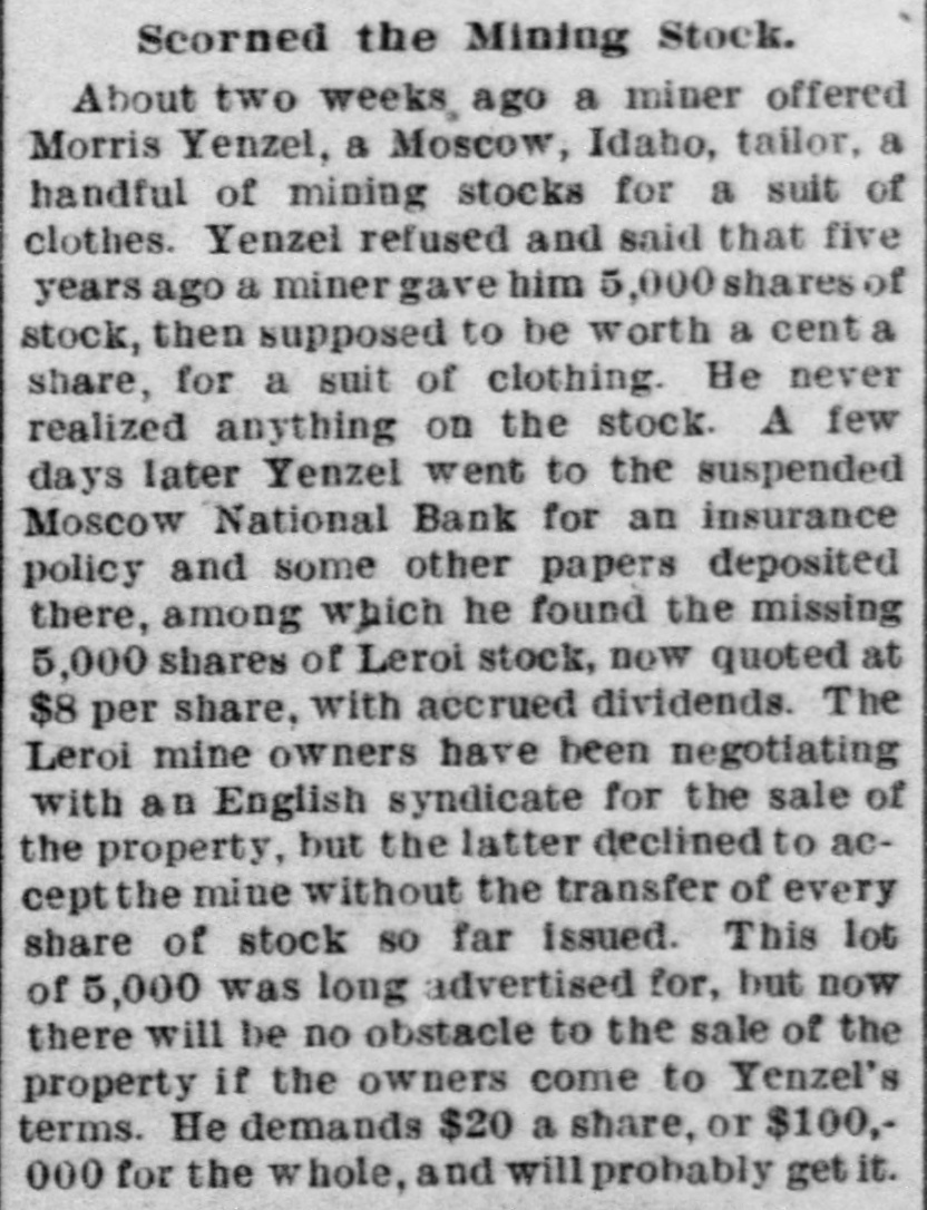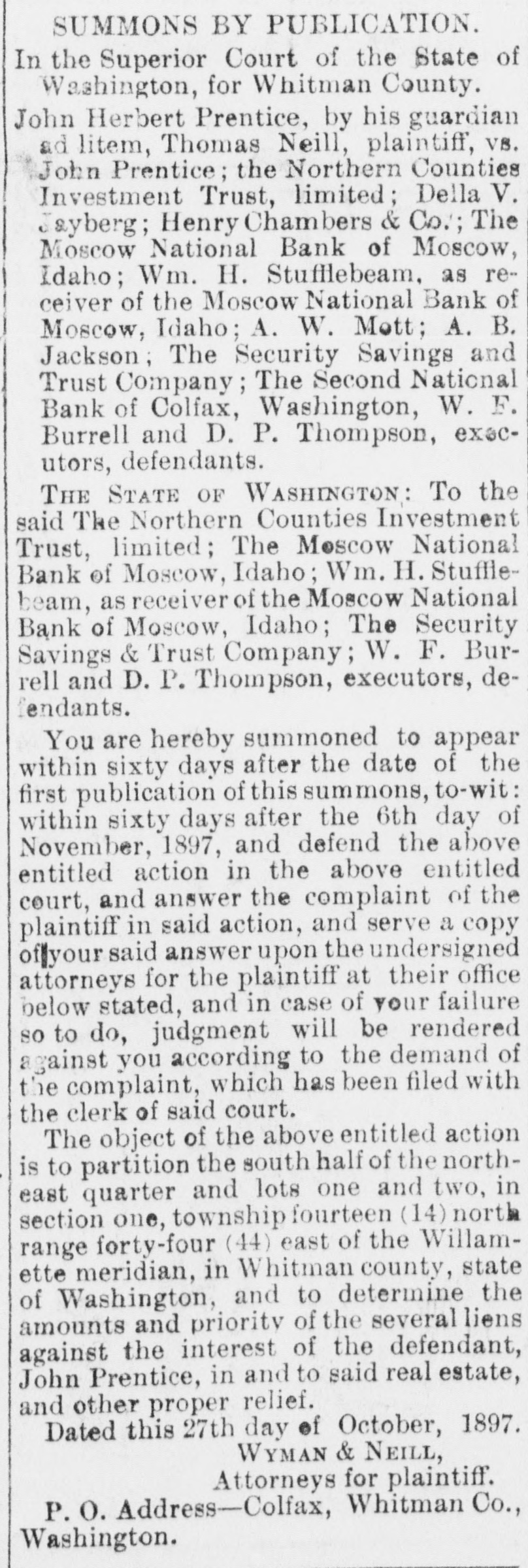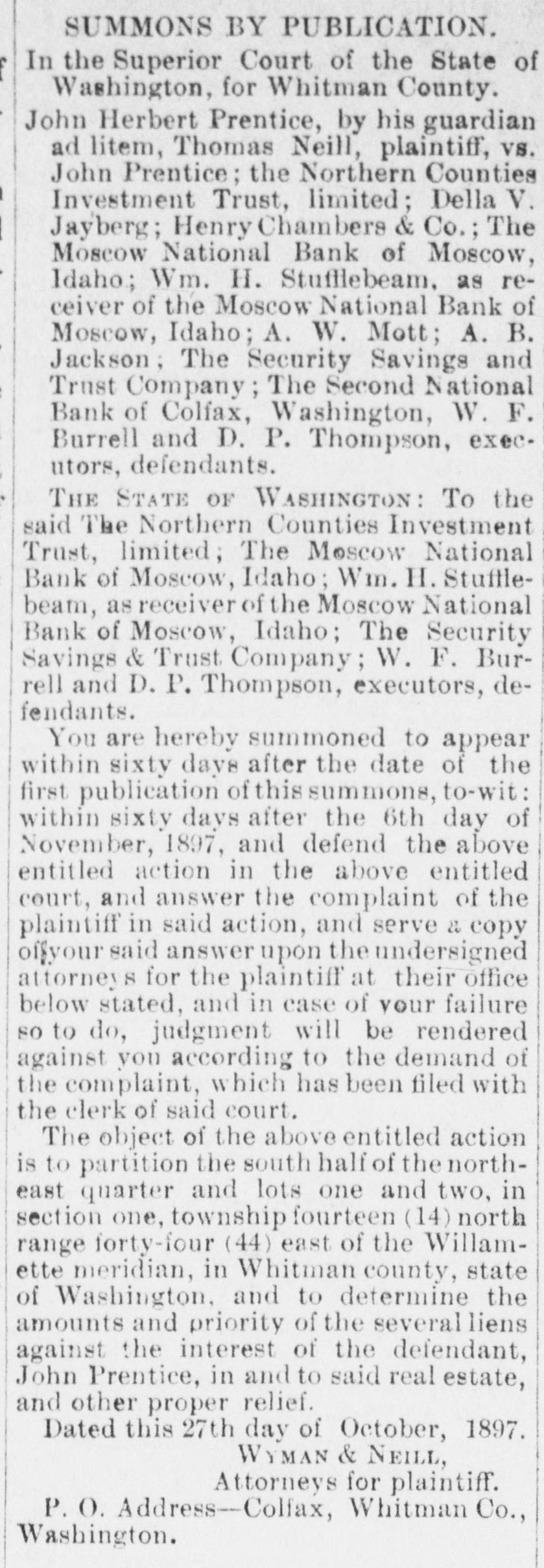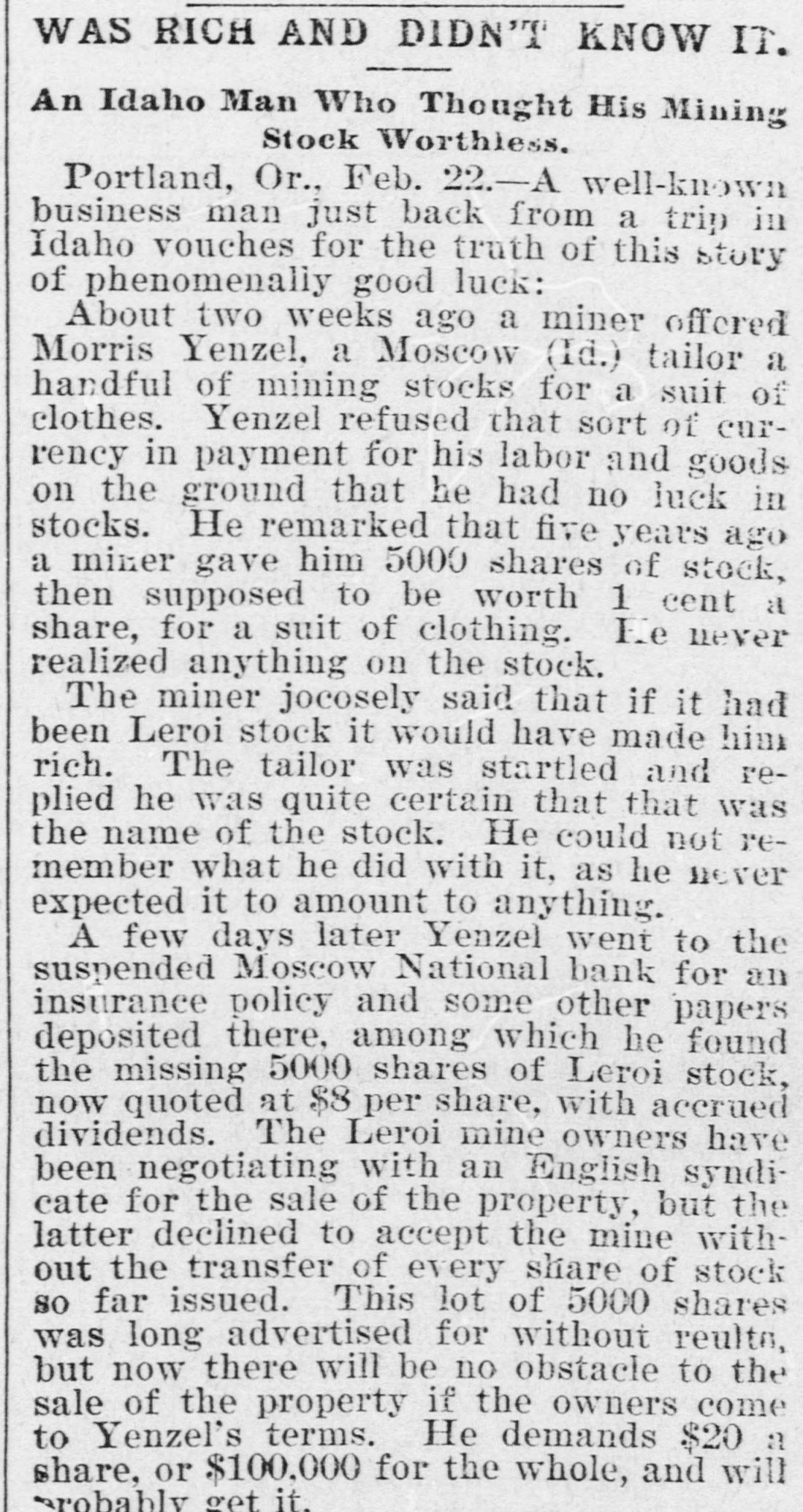 Telegraphic Briefs. Charleston, S. C.-Bill Dodgins died in Pickens county, S. C., aged 103 years. New Orleans.-Cardipal Gibbons arrived in the city on a short visit to relatives. New Orleans.-Edward Conery, Sr., the well-known millionaire merchant, died. New Orleans.-George R. Finley, head of the large drug firm of Finley, Dicks, & Co., died. London -Thomas Batement, who was twice president of the Primitive Methodist Conference, is dead. New Orleans.-E. Conrey, Sr., the steamboat king of the South, and one of New Orleans's wealthiest citizens, died. Salt Lake, Utah.-The day's three ballots in the State Legislature for United States Senator developed no material change. Rome, Italy -The University was closed, owing to riotous conduct on the part of the students. Several of the ringleaders were arrested. Spokane, Wash.-The First National Bank of Oakdale, Spokane county, has gone into voluntary liquidation. Depositors are notified to come and get their money. London-The House of Commons, by a vote of 325 to 110, passed the financial proposal in the educational bill to grant to voluntary schools the sum of 5 shillings per child. New Orleans.-The House River and Harbor Committee arrived in the city this morning from Texas, and left immediately on their return trip. They will stop over at Birmingham, and be entertained there. Moscow, Idaho-The Moscow National Bank was closed by Bank-Examiner Eugene I. Wilson, of Ellenburg, acting under the orders of Comptroller Eckels. R. C. Brown is president, and C. M. Brune, cashier. Pittsburg, Pa.-In the Court of Common Pleas, George S. Griscom and H. E. Anderson were appointed receivers for the Pennsylvania Lead Company, of Pittsburg. Judgment was confessed to Trustee Griscom for $949,000. New York.-Bob Fitzsimmons expects to start for Nevada on February 12th, as he wishes to have four weeks' hard training for the big fight. It is likely that a watering-place about three miles from Carson City will be selected. London -Edward R. Taylor, alias Arthur W. Platt, who is under arrest for killing Jesse Tyree in Kentucky, in 1885, was formally extradited in the BowStreet Police Court, and will be taken to America at once by Kentucky officials. Charleston, S. C-A letter from Admiral Bunce to Mayor Smith, says that nearly all the ships of the squadron of evolution will come into the harbor after the manoeuvres outside, and that an exchange of courtesies will be in order, Madrid.-The Infanta Marie Louise Ferdinande, Duchess of Montpensier, is dead; aged 65 years. She was a sister of ex-Queen Isabella II., of Spain; grandmother of the King of Spain, and was married in 1846 to the Duke of Montpensier, who died in 1890. Canton. O.-There are over one hundred cases of typhoid-fever in the city, The cause is attributed to the water-supply. There have been several deaths, Mrs. Emma Troll, formerly an amanuensis for Major McKinley, being among those who have succumbed to the disease. Sterling, Ill-The extensive works of the Keystone Manufacturing Company. Thomas A, Galt president, were closed by the Sheriff, on a levy made in favor of Mr. Galt for $89,085. and the First National Bank of Sterling for $9,996. The Keystone company manufactured all kinds of farming implements.
