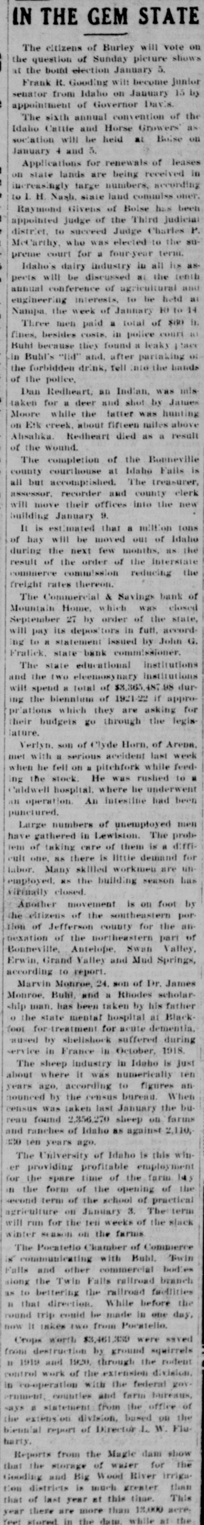 e The citizens of Burley will vote shows on question of Sunday picture 5. the it bond election January Frank the H. Gooding will become junior 15 by from Idaho on January Davis the appointment senator of Governor of sixth annual convention as The Cattle and Horse Growers Buise Idaho sociation will be held at on January + and 5. Applications for renewals received of leases in state lands are being according increasingly on targe numbers, commules other. H. Name state land been to Givens of Boise has judicial Raymond judge of the Third P. appointed to succeed Judge Charles the suMcCarthy. district, who was elected to term. court for a four-year his preme Idaho's dairy industry in all tenth as will be discussed at the and peris annual conference of agricultural held as engineering interests, to be 10 to It Nampa. the week of January in. Three men paid a total of court $150 ⑉ besides costs. in police tack Buhi fines, because they found 24 leaky I of Buhl's "Itd" and. after pariaking hands in the forbidden drink, tell into the of the police. Dan Redheart, an Indian, was Jalues mis for a deer and shot by taken while the fatter was hunting above Moore Etk creek. about fifteen miles result on Alsahka. Redheart died as a of the wound. The completion of the Bonneville is courthouse at Idaho Falls all county but accomplished. The treasurer, clerk assessor, recorder and county will move their offices into the new building January 9. It is estimated that a million Idaho tons of hay will be moved out of the during the next few months, as result of the order of the interstate the commerce commission reducing freight rates thereon. The Commercial & Savings bank closed of Mountain Home, which was September 27 by order of the state, will pay its deposit tors in full. accord G. ng to H statement issued by John Fralick, state bank commisMomer. The state educational Institutions and the two electrosynary institutions will spend H total of $3,365 47.98 during the biennium of 1921-22 if appro- for priations which they are asking their budgets go through the legis lature. Verlyn. son of Clyde Horn, of Arenn. with 28 serious accident last week met when he fell on 28 pitchfork while feedthe stock. He was rushed to Caldwell ing hospital. where he underwent an operation. An intestine had been punctured. Large numbers of unemployed men have gathered in Lewiston. The prob lem of taking care of them is a difficult one, NS there is little demand for labor. Many skilled workmen are unemployed, NS the building season has vitinally closed. Another movement is on foot by the citizens of the southeastern porIlon of Jefferson county for the annexation of the northeastern part of Bonneville, Antelope. Swan Valley, Erwin, Grand Valley and Mud Springs, according to report. Marvin Motroe, 24. son of Dr. James Monroe. Buhi, and a Rhodes scholar<hip man. has been taken by his father o the state mental hospital at Blackfoot for-treatment for acute dementia. used by shellshock suffered during service in France in October, 1918. The sheep industry in Idaho is just about where it was numerically ten years ago, according to figures an nounced by the census bureau. When census was taken last January the bureau found 2,356,270 sheep on farms and ranches of Idaho as against 2,110, #0 ten years ago. The University of Idaho is this winer providing profitable employment for the spare time of the farm 145 in the form of the opening of the second term of the school of practical agriculture on January 3. The term will run for the tell weeks of the slack winter season on the farms The Pocatetio Chamber of Commerce is communicating with Buhl. Twin Falls and other commercial bodies the Twin Falls railroad branch as to the slong bettering railroad facilities 11 that direction. While before the round trip could be made in one day, now It inkes two from Poestelle. Crops worth $3,461,339 were saved from destruction by ground squirrels 11 1919 and 1920. through the rudent control work of the extension division. in co-operation with the federal gov promment. countres and farm bureaus, says a statement from the office of the extens's division, based on the biennial report of Director 1. W. Fluharty, Reports from the Magie dam show that the storage of water for the Gooding and Big Wood River irrigadistricts is much greater of last at this that Con year thee. This than year there are more than 12,000 aere Yeet stored in the while at the