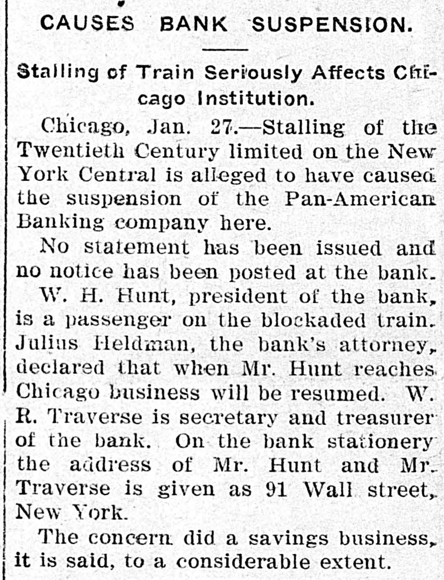 CAUSES BANK SUSPENSION. Stalling of Train Seriously Affects Chicago Institution. Chicago, Jan. 27.-Stalling of the Twentieth Century limited on the New York Central is alleged to have caused the suspension of the Pan-American Banking company here. No statement has been issued and no notice has been posted at the bank. W. H. Hunt, president of the bank, is a passenger on the blockaded train. Julius Heldman, the bank's attorney, declared that when Mr. Hunt reaches Chicago business will be resumed. W. R. Traverse is secretary and treasurer of the bank. On the bank stationery the address of Mr. Hunt and Mr. Traverse is given as 91 Wall street, New York. The concern did a savings business, it is said, to a considerable extent.