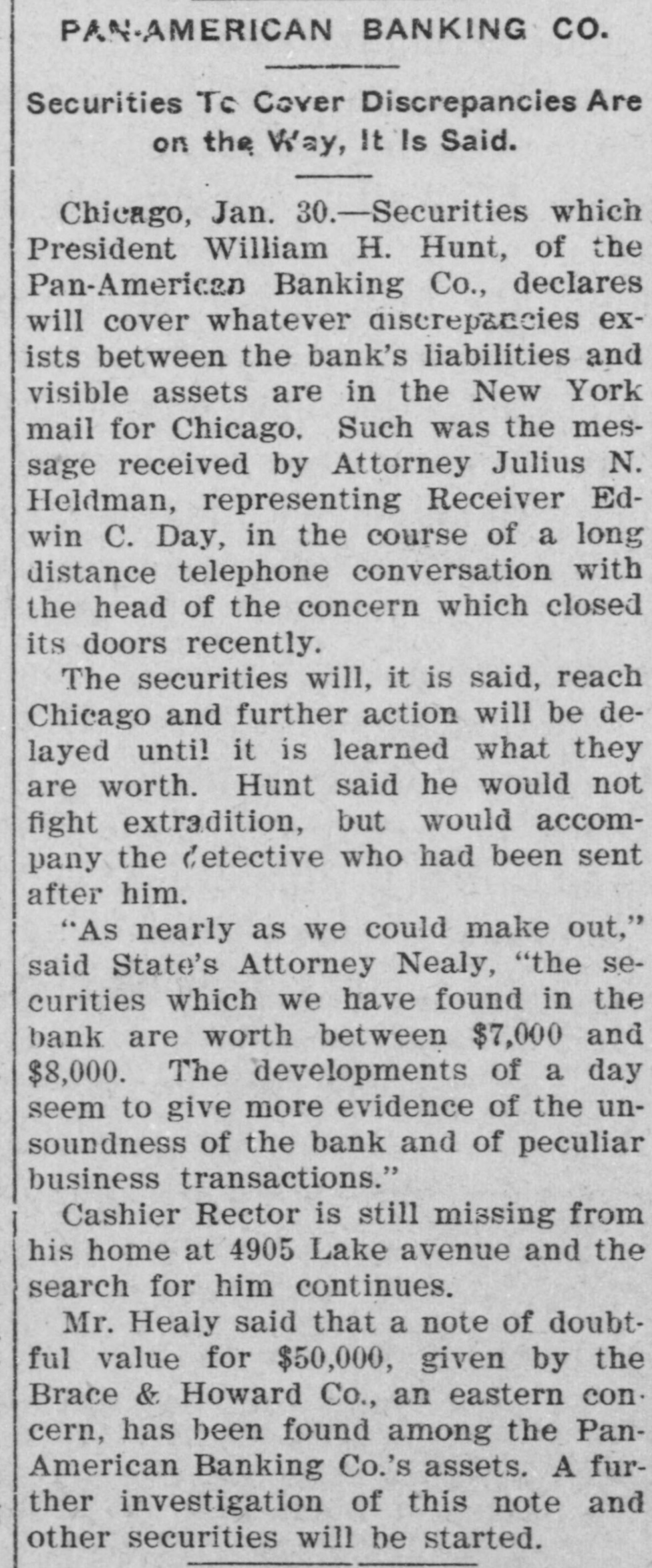 PAN-AMERICAN BANKING CO. Securities To Cover Discrepancies Are on the Way, It Is Said. Chicago, Jan. 30.-Securities which President William H. Hunt, of the Pan-American Banking Co., declares will cover whatever discrepancies exists between the bank's liabilities and visible assets are in the New York mail for Chicago. Such was the message received by Attorney Julius N. Heldman, representing Receiver Edwin C. Day, in the course of a long distance telephone conversation with the head of the concern which closed its doors recently. The securities will, it is said, reach Chicago and further action will be delayed unti! it is learned what they are worth. Hunt said he would not fight extradition, but would accompany the detective who had been sent after him. "As nearly as we could make out," said State's Attorney Nealy, "the securities which we have found in the bank are worth between $7,000 and $8,000. The developments of a day seem to give more evidence of the unsoundness of the bank and of peculiar business transactions." Cashier Rector is still missing from his home at 4905 Lake avenue and the search for him continues. Mr. Healy said that a note of doubtful value for $50,000, given by the Brace & Howard Co., an eastern concern, has been found among the PanAmerican Banking Co.'s assets. A further investigation of this note and other securities will be started.