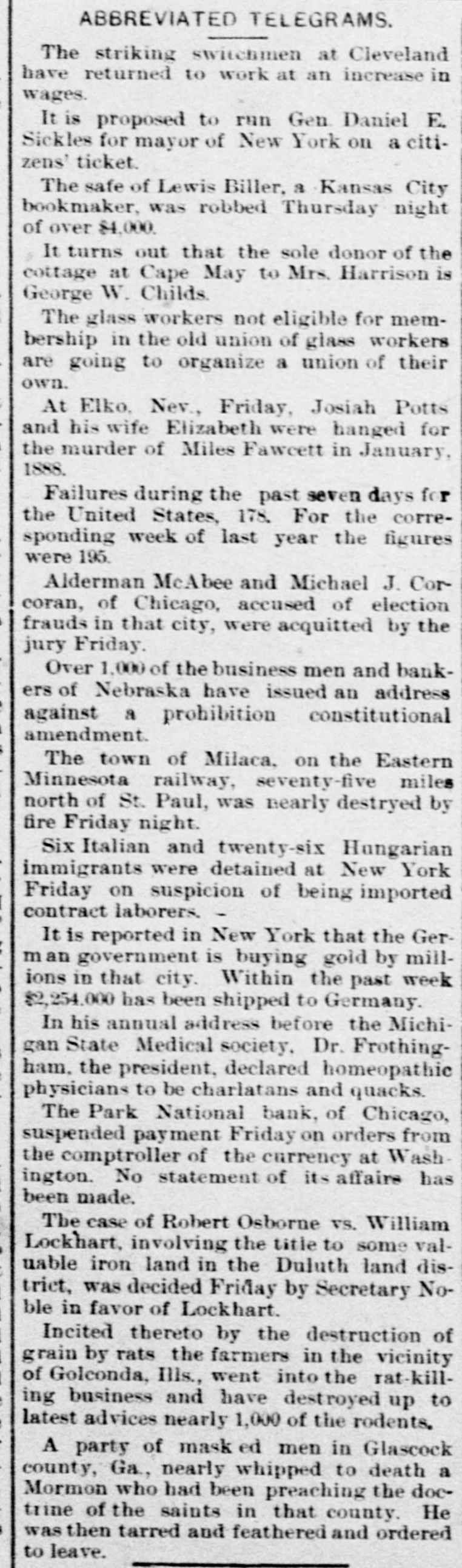 ABBREVIATED TELEGRAMS. The striking switchmen at Cleveland have returned to work at an increase in wages. It is proposed to run Gen Daniel E. Sickles for mayor of New York on a citizens' ticket. The safe of Lewis Biller, a Kansas City bookmaker, was robbed Thursday night of over $4,000. It turns out that the sole donor of the cottage at Cape May to Mrs. Harrison is George W. Childs. The glass workers not eligible for membership in the old union of glass workers are going to organize a union of their own. At Elko, Nev., Friday, Josiah Potts and his wife Elizabeth were hanged for the murder of Miles Fawcett in January, 1888. Failures during the past seven days for the United States, 178. For the corresponding week of last year the figures were 195. Alderman McAbee and Michael J. Corcoran, of Chicago, accused of election frauds in that city, were acquitted by the jury Friday. Over 1,000 of the business men and bankers of Nebraska have issued an address against a prohibition constitutional amendment. The town of Milaca, on the Eastern Minnesota railway, seventy-five miles north of St. Paul, was nearly destryed by fire Friday night. Six Italian and twenty-six Hungarian immigrants were detained at New York Friday on suspicion of being imported contract laborers. It is reported in New York that the Germ an government is buying gold by millions in that city. Within the past week $2,254.000 has been shipped to Germany. In his annual address before the Michigan State Medical society, Dr. Frothingham. the president, declared homeopathic physicians to be charlatans and quacks. The Park National bank, of Chicago, suspended payment Friday on orders from the comptroller of the currency at Washington. No statement of its affairs has been made. The case of Robert Osborne vs. William Lockhart, involving the title to some valuable iron land in the Duluth land district, was decided Friday by Secretary Noble in favor of Lockhart. Incited thereto by the destruction of grain by rats the farmers in the vicinity of Golconda, Ills., went into the rat-killing business and have destroyed up to latest advices nearly 1,000 of the rodents. A party of mask ed men in Glascock county, Ga., nearly whipped to death a Mormon who had been preaching the doctrine of the saints in that county. He was then tarred and feathered and ordered to leave.