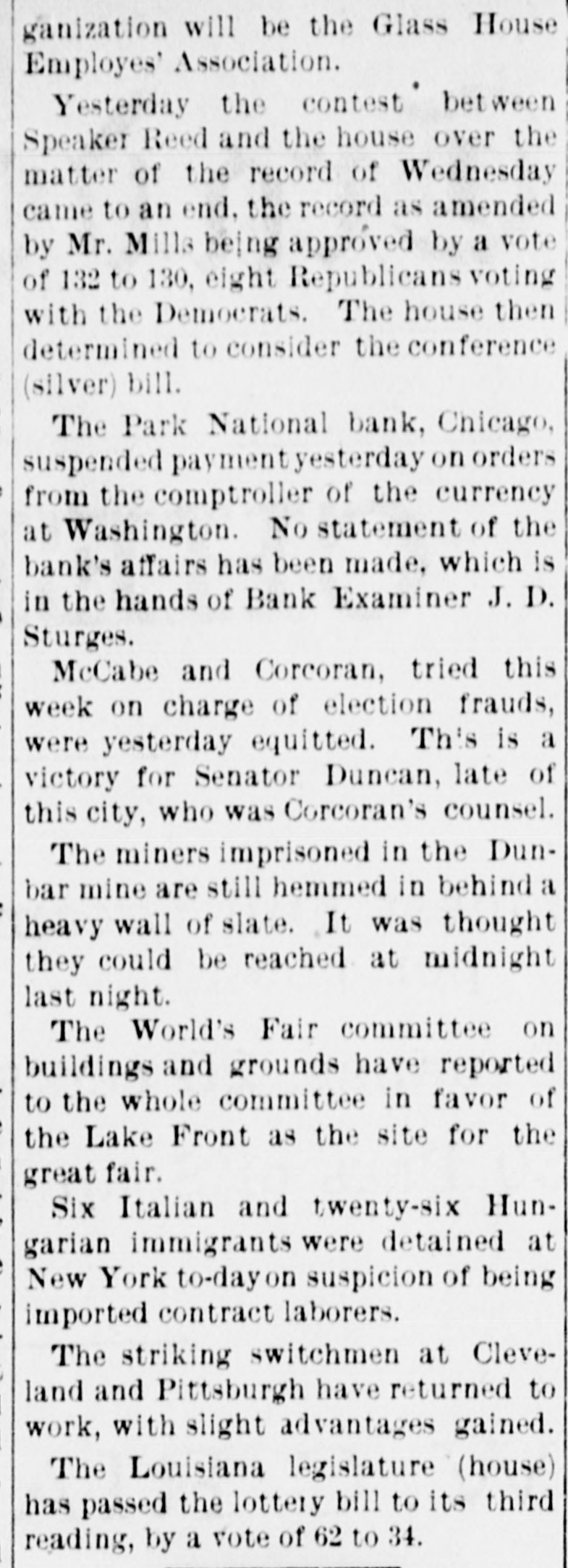 ganization will be the Glass House Employes' Association. Yesterday the contest bet ween Speaker Reed and the house over the matter of the record of Wednesday came to an end, the record as amended by Mr. Mills being approved by a vote of 132 to 130, eight Republicans voting with the Democrats. The house then determined to consider the conference (silver) bill. The Park National bank, Chicago, suspended payment yesterday on orders from the comptroller of the currency at Washington. No statement of the bank's affairs has been made, which is in the hands of Bank Examiner J. D. Sturges. McCabe and Corcoran, tried this week on charge of election frauds, were yesterday equitted. This is a victory for Senator Duncan, late of this city, who was Corcoran's counsel. The miners imprisoned in the Dunbar mine are still hemmed in behind a heavy wall of slate. It was thought they could be reached at midnight last night. The World's Fair committee on buildings and grounds have reported to the whole committee in favor of the Lake Front as the site for the great fair. Six Italian and twenty-six Hungarian immigrants were detained at New York to-day on suspicion of being imported contract laborers. The striking switchmen at Cleveland and Pittsburgh have returned to work, with slight advantages gained. The Louisiana legislature (house) has passed the lottery bill to its third reading, by a vote of 62 to 34.
