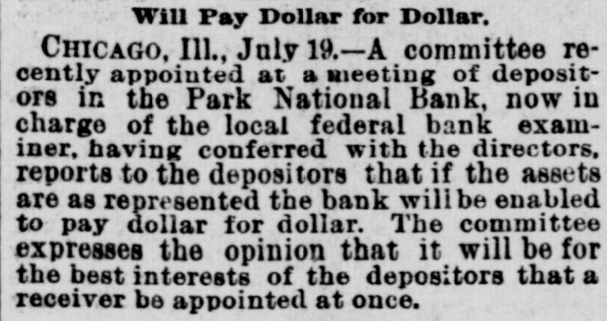 Will Pay Dollar for Dollar. CHICAGO, Ill., July 19.-A committee recently appointed at a meeting of depositors in the Park National Bank, now in charge of the local federal bank examiner, having conferred with the directors, reports to the depositors that if the assets are as represented the bank will be enabled to pay dollar for dollar. The committee expresses the opinion that it will be for the best interests of the depositors that a receiver be appointed at once.
