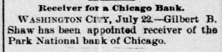A Receiver for Chicago's Park Bank. WASHINGTON. D. C., July 21.-The Comptroller of the Currency has appointed Gilbert B. Shaw receiver of the Park National Bank of Chicago, Ill. The appointment was delaved several days in order to allow the directors a chance to restore the bank to a business basis. They were unable to do this, however, and it was thought best to wind up the bank's affairs.