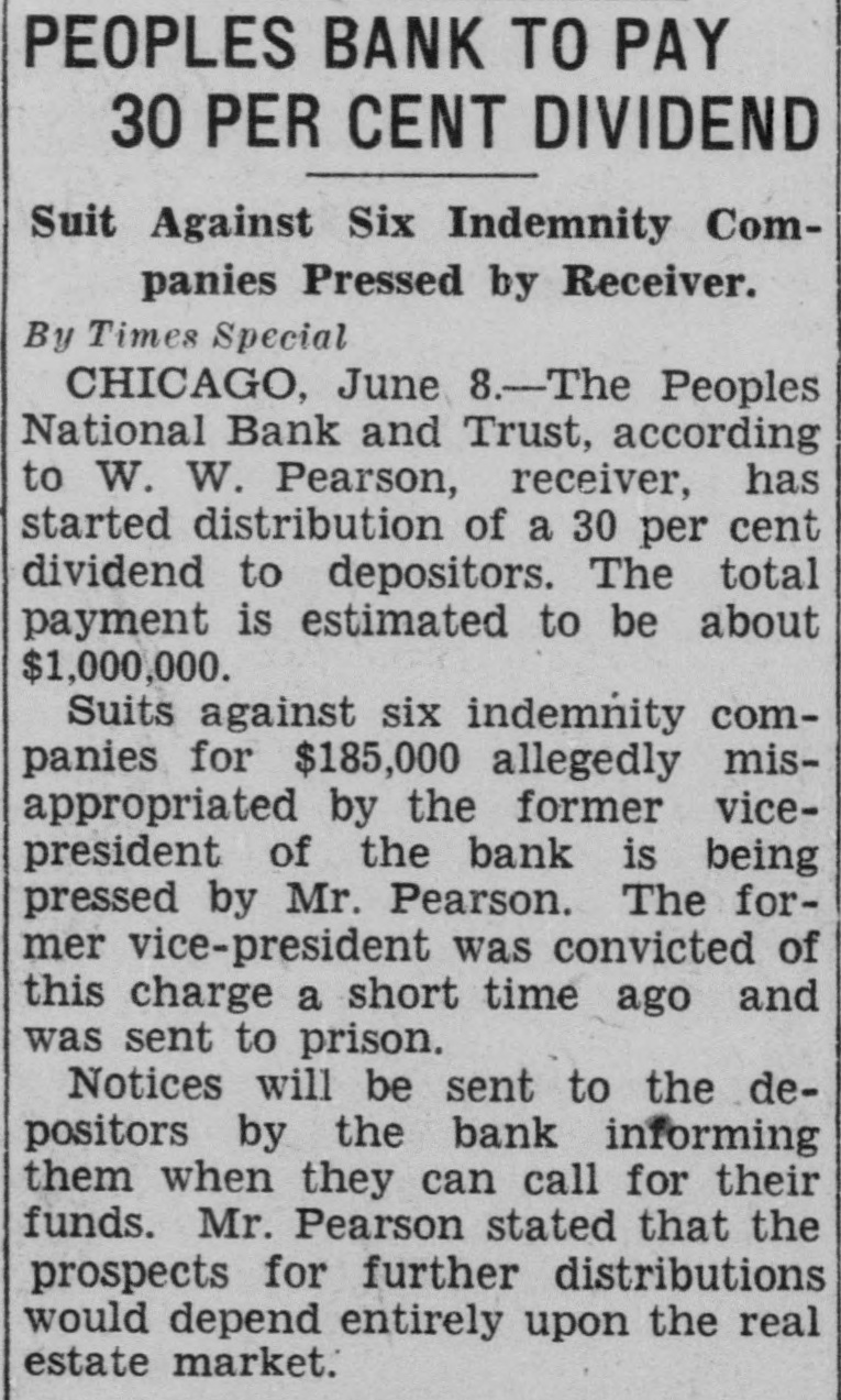 PEOPLES BANK TO PAY 30 PER CENT DIVIDEND Suit Against Six Indemnity Companies Pressed by Receiver. By Times Special CHICAGO, June 8.-The Peoples National Bank and Trust, according to W. W. Pearson, receiver, has started distribution of a 30 per cent dividend to depositors. The total payment is estimated to be about $1,000,000. Suits against six indemnity companies for $185,000 allegedly misappropriated by the former vicepresident of the bank is being pressed by Mr. Pearson. The former vice-president was convicted of this charge a short time ago and was sent to prison. Notices will be sent to the depositors by the bank informing them when they can call for their funds. Mr. Pearson stated that the prospects for further distributions would depend entirely upon the real estate market.