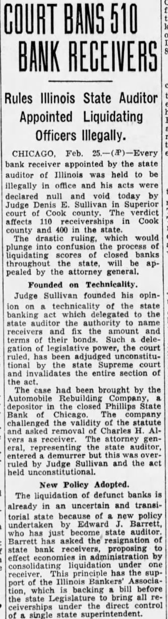 The case had been brought by the Automobile Rebuilding Company, depositor in the closed Phillips State Bank of Chicago...asked removal of Charles H. Alvers as receiver. (1933 articles discuss receiverships being declared void.) Judge Sullivan ruled...that all receivers of closed banks in Illinois holding office in violation the state constitution and their actions are void. (Feb 1933). The case had been brought by the Automobile Rebuilding company, depositor in the closed Phillips State Bank of Chicago. (Articles Feb–Mar 1933).