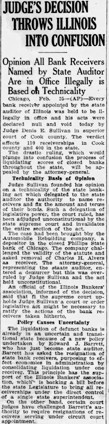 JUDGE'S DECISION THROWS ILLINOIS INTO CONFUSION Opinion All Bank Receivers Named by State Auditor Are in Office Illegally is Based oh Technicality Chicago, Feb. bank receiver appointed by the state auditor of Illinois was held to be illegally in office and his acts were declared null and void today by Judge Denis E. Sullivan in superior court of Cook county. The verdict affects 110 receiverships in Cook county and 400 in the state. The drastic ruling, which would plunge confusion the process of liquidating scores of closed banks throughout the state, will be appealed by the Technicality Basis of Opinion Judge Sullivan founded his opinion on technicality the state banking act which delegated to the state auditor the authority to name ceivers and fix the and terms of their bonds. Such delegation of legislative power, the court ruled, has been adjudged unconstitutional by the state supreme court and invalidates the entire section of the The case had brought bby the Automobile Rebuilding depositor in the closed Phillips State bank of Chicago. The company challenged the validity the statute and asked removal Charles H. Alvers as receiver. The representing the staate auditor, entered demurrer but this overruled by Judge Sullivan and the act held An official of the Illinois Bankers' association, informed the decision, said that fi the supreme court upholds Judge Sullivan court or order legislative act might be necessary to ratify the of the bank receivers taken Pollcy Causes Uncertainty The liquidation of defunct banks already in an uncertain and transitional state new policy undertaken by Edward Barrett, who has just become state auditor. Barrett has asked the resignation state bank receivers, purposing to fect economies in administration by consolidating liquidation under one receiver. This principle has the support of the Illinois tion, which backing bill before the state Legislature bring all receiverships under the direct control of single state superintendent. On the other hand, certain court judges have challenged Barrett's authority to resignations receivers serving under circuit court appointment.