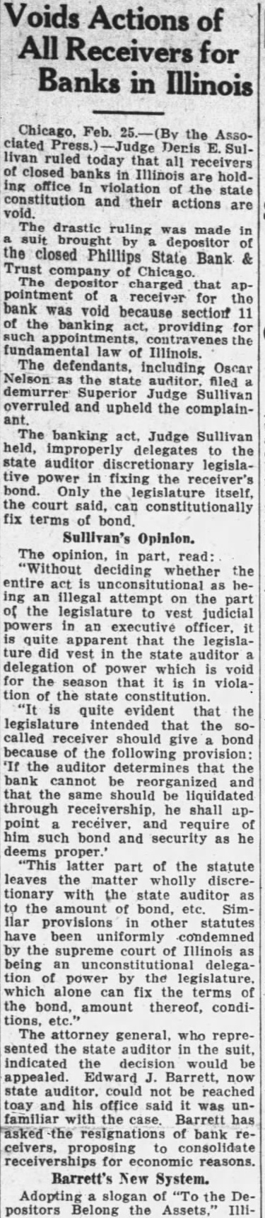 Actions of All Receivers for Banks in Illinois Chicago, Feb. the Deris ruled today that all receivers of closed banks in Illinois holding office violation the state constitution and their actions are void. drastic ruling made depositor closed Phillips State Bank company of Chicago. depositor that pointment of receiver for the bank was void because section banking providing fundamental law of Illinois. The defendants, including Oscar Nelson the auditor, filed demurrer Superior Judge Sullivan overruled upheld the complain- banking act. Judge Sullivan held, improperly delegates the state auditor discretionary legislative fixing the power bond. Only the itself, the court said, can constitutionally fix terms of bond. Sullivan's Opinion. The opinion, part, read: "Without deciding whether the entire illegal attempt on the part the legislature to vest judicial officer, quite that the legislature did vest the state auditor delegation of power which is void for the season that violation of the state constitution. is quite evident that the legislature intended that the called receiver should give bond because of the following provision: the auditor determines that the bank cannot be reorganized that the same should be liquidated through receivership, he shall point and require him such bond and security he deems proper.' latter part of the statute leaves the matter wholly discretionary with the state auditor the amount bond, etc. Simprovisions other statutes have been uniformly condemned the court of Illinois being delegation power by the legislature. which alone can fix the terms of the bond. amount thereof, conditions, The attorney general, represented the state auditor in the indicated decision would appealed. Edward Barrett, state auditor. could not be reached toay and his office said unfamiliar Barrett has resignations of bank to consolidate for reasons. Barrett's New System. Adopting slogan of the positors Belong the Assets," IIII-