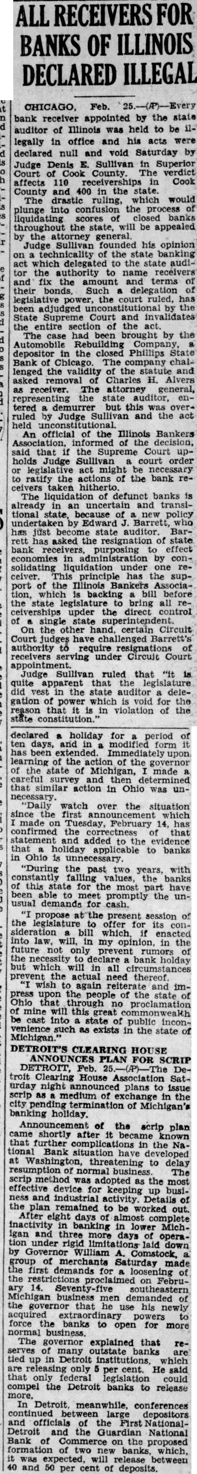ALL RECEIVERS FOR BANKS OF ILLINOIS DECLARED ILLEGAL bank receiver appointed by the state auditor of Illinois was held to be illegally in office and his acts were declared null and void Saturday by Judge Denis E. Sullivan in Superior Court of Cook County. The verdict affects 110 receiverships in Cook County and 400 in the state The drastic ruling, which would plunge into confusion the process of liquidating scores banks throughout the state, will be appealed by the attorney general. Judge Sullivan founded his opinion on technicality of the state banking act which delegated to the state auditor the authority to name receivers the amount and terms of their bonds. Such a delegation of legislative the court ruled, has been adjudged by the State Supreme Court and invalidates the entire section of the act. The case had been brought by the Automobile Rebuilding Company, depositor in the closed Phillips State Bank of Chicago. The company challenged the validity of the asked removal of Charles H. Alvers as receiver. The attorney general, representing the state auditor, entered demurrer but this was overruled by Judge Sullivan and the act An official of the Illinois Bankers decision, said that if if the Supreme Court upholds Judge Sullivan court order or legislative act might be necessary to ratify the actions of the bank receivers taken hitherto. The liquidation of defunct banks is already in an and transitional state because of new policy undertaken by Edward Barrett, who has just become state auditor. Barrett has asked the resignation of state bank receivers, purposing to effect economies in administration by consolidating liquidation under one receiver. principle has the support of the Illinois Bankers Association, which is backing bill before the state legislature to bring all receiverships upder the direct control of single state superintendent. On the other hand, certain Circuit Court have hallenged Barrett's authority to resignations of receivers serving under Circuit Court Judge Sullivan ruled that "it is quite apparent that the legislature did vest in the state auditor a delegation of power which is void for the reason that it is in violation of the state constitution. declared a holiday for period of days, and in modified form has been Immediately upon learning of the action the of the state of Michigan, made careful survey and then that similar action in Ohio was unnecessary. 'Daily watch over the situation since the first which made on Tuesday, February 14, has confirmed the of statement and added to the evidence that holiday applicable to banks in Ohio is unnecessary "During the past two years with constantly falling values, the banks of this state for the most part have been able to promptly the unusual demands for cash. "I propose at the present session of the legislature to offer for its consideration bill which if enacted into law, will, in my opinion, in the future not only prevent rumors the necessity declare a bank holday but which will all tances prevent the actual need thereof "I wish to again reiterate and impress upon the people of the state of Ohio that through no proclamation mine will this great commonwealth be cast into state of public inconvenience such as exists in the state of Michigan. DETROIT'S CLEARING HOUSE ANNOUNCES PLAN FOR SCRIP DETROIT, Feb. 25.-(P)-The Detroit Clearing House Association Saturday night announced plans to issue scrip as a medium of exchange in the city pending termination of Michigan's banking holiday Announcement of the scrip plan came shortly after it became known that further complicati in the Na. tional Bank situation have at Washington threatening to delay resumption of normal The scrip method was adopted as the most effective device for keeping up business and industrial activity. Details of the plan remained to be worked out After eight days of almost complete inactivity in banking in lower Michigan and three more days of operation under rigid limitations laid down by Governor William A. Comstock, group of merchants Saturday made the first demands for a loosening of the on February 14. Seventy southeastern men demanded of the governor that he use his newly acquired extraordinary to force the banks to open for more normal business. The governor explained that reof many outstate banks are tied up in Detroit which are only per cent. He said that only federal legislation could compel the Detroit banks to release more. In Detroit meanwhile, conferences continued large depositors and officials of the First NationalDetroit and the Guardian National Bank of on the proposed formation of two new banks which was expected, will release between 40 and 50 per cent of deposits.