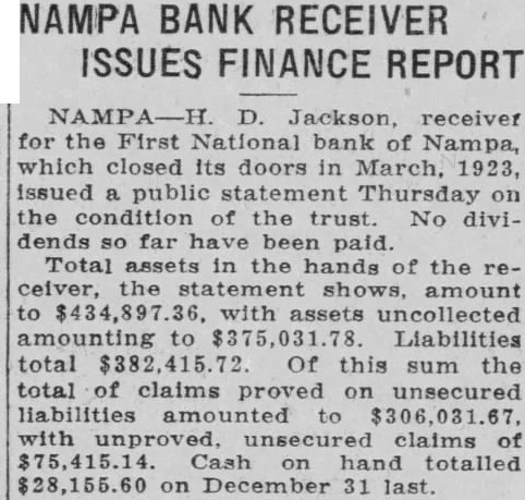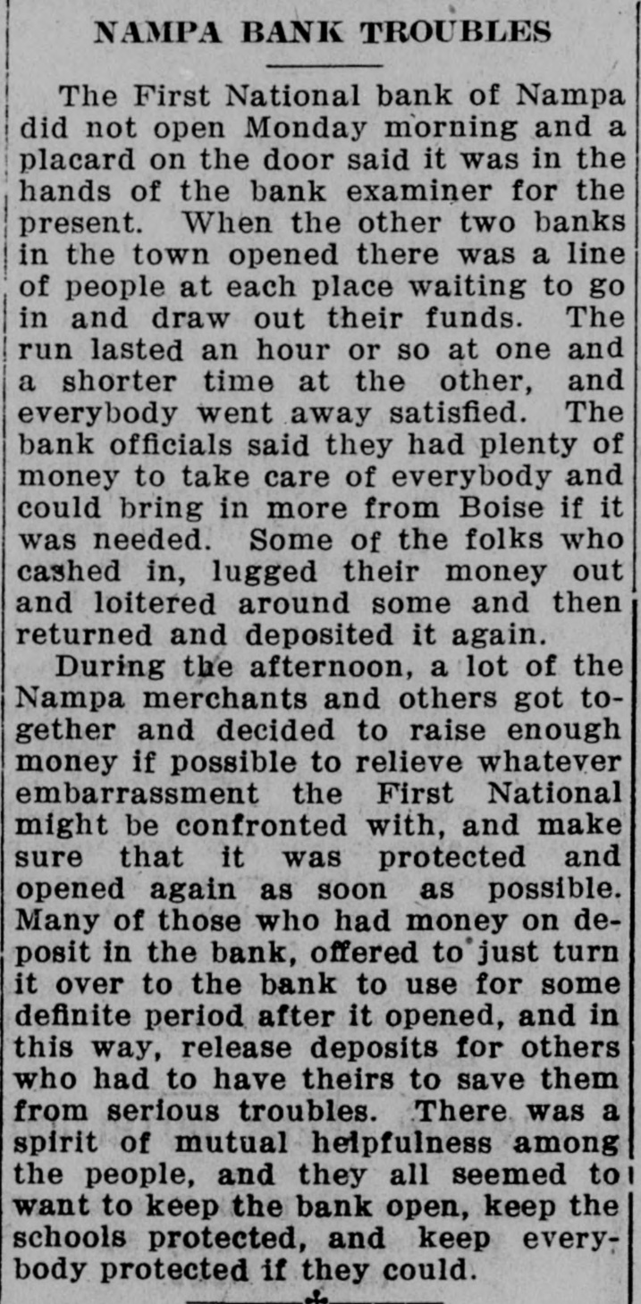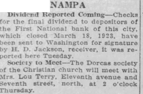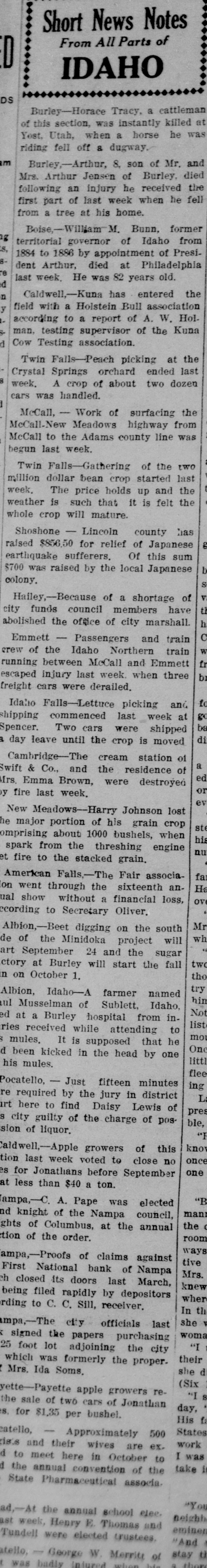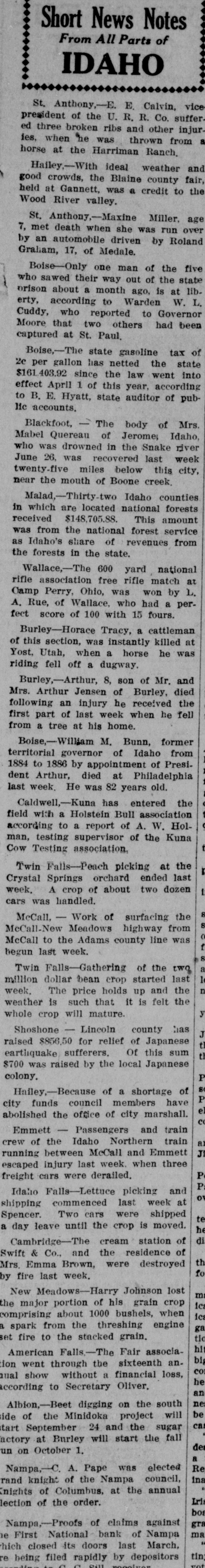 Short News Notes From All Parts of IDAHO St. Anthony,-E. E. Calvin, vice president of the U. R. R. Co. suffer ed three broken ribs and other injur a ies, when he was thrown from horse at the Harriman Ranch. Hailey,-With ideal weather and good crowds, the Blaine county fair, held at Gannett, was a credit to the Wood River valley. St. Anthony,-Maxine Miller, age 7, met death when she was run over by an automobile driven by Roland Graham, 17, of Medale. Boise-Only one man of the five who sawed their way out of the state orison about a month ago, is at liberty, according to Warden W. L. Cuddy, who reported to Governor Moore that two others had been captured at St. Paul. Boise,-The state gasoline tax of 2e per gallon has netted the state $161,403.92 since the law went into effect April 1 of this year, according to B. E. Hyatt, state auditor of public accounts. Blackfoot, The body of Mrs. Mabel Quereau of Jerome Idaho, who was drowned in the Snake river June 26, was recovered last week twenty-five miles below this city, near the mouth of Boone creek. Malad,-Thirty-two Idaho counties in which are located national forests received $148,705.88. This amount was from the national forest service as Idaho's share of revenues from the forests in the state. Wallace,-The 600 yard national rifle association free rifle match at Camp Perry, Ohio, was won by L. A. Rue, of Wallace, who had a perfect score of 100 with 15 fours. Burley-Horace Tracy, a cattleman of this section, was instantly killed at Yost, Utah, when a horse he was riding fell off a dugway. Burley,-Arthur, 8, son of Mr. and Mrs. Arthur Jensen of Burley, died following an injury he received the first part of last week when he fell from a tree at his home. Boise,-William M. Bunn, former territorial governor of Idaho from 1884 to 1886 by appointment of President Arthur, died at Philadelphia last week. He was 82 years old. Caldwell,-Kuna has entered the field with a Holstein Bull association according to a report of A. W. Holman, testing supervisor of the Kuna Cow Testing association. Twin Falls-Peach picking at the Crystal Springs orchard ended last week. A crop of about two dozen cars was handled. McCall, - Work of surfacing the McCall-New Meadows highway from McCall to the Adams county line was begun last week. Twin Falls-Gathering of the two million dollar bean crop started last n week. The price holds up and the weather is such that it is felt the y whole crop will mature. J Shoshone - Lincoln county has raised $856.50 for relief of Japanese earthquake sufferers. Of this sum $700 was raised by the local Japanese colony. P P Halley,-Because of a shortage of el city funds council members have e abolished the office of city marshall. Emmett Passengers and train al crew of the Idaho Northern train J running between McCall and Emmett escaped injury last week. when three P freight cars were derailed. P or Idaho Falls-Lettuce picking and shipping commenced last week at te Spencer. Two cars were shipped he a day leave until the cΓop is moved. di Cambridge-The cream station of th Swift & Co., and the residence of fo Mrs. Emma Brown, were destroyed by fire last week. m New Meadows-Harry Johnson lost 1ca major portion of his grain crop 1ca the comprising about 1000 bushels, when ga spark from the threshing engine tio set fire to the stacked grain. hit big American Falls,-The Fair associaco went through the sixteenth anhe nual ion show without a financial loss, an according to Secretary Oliver. ne be Albion,-Beet digging on the south of the Minidoka project will ca tart ide September 24 and the sugar des actory at Burley will start the fall un on October 1. a Re Nampa,-C. A. Pape was elected ina rand knight of the Nampa council, Inights of Columbus, at the annual Lris lection of the order. bot gra Nampa,-Proofs of claims against ma First National bank of Nampa hich e closed its doors last March, tin: re being filed rapidly by depositors