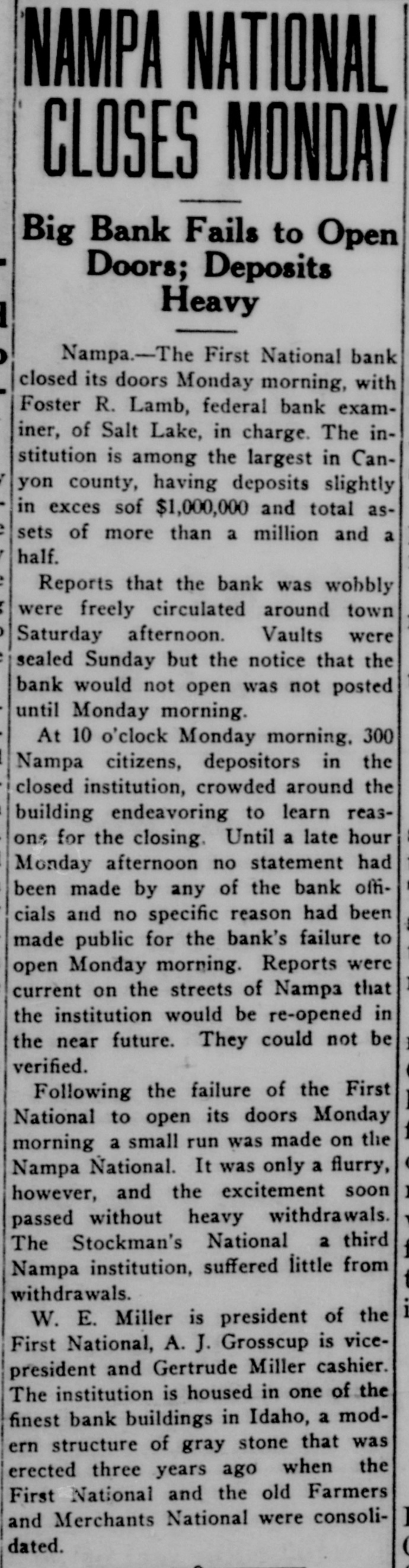 NAMPA NATIONAL CLOSES MONDAY Big Bank Fails to Open Doors; Deposits Heavy Nampa.-The First National bank closed its doors Monday morning, with Foster R. Lamb, federal bank examiner, of Salt Lake, in charge. The institution is among the largest in Canyon county, having deposits slightly in exces sof $1,000,000 and total assets of more than a million and a half. Reports that the bank was wobbly were freely circulated around town Saturday afternoon. Vaults were sealed Sunday but the notice that the bank would not open was not posted until Monday morning. At 10 o'clock Monday morning. 300 Nampa citizens, depositors in the closed institution, crowded around the building endeavoring to learn reasons for the closing. Until a late hour Monday afternoon no statement had been made by any of the bank officials and no specific reason had been made public for the bank's failure to open Monday morning. Reports were current on the streets of Nampa that the institution would be re-opened in the near future. They could not be verified. Following the failure of the First National to open its doors Monday 1 morning a small run was made on the Nampa National. It was only a flurry, however, and the excitement soon passed without heavy withdrawals. The Stockman's National a third 1 Nampa institution, suffered little from withdrawals. W. E. Miller is president of the First National, A. J. Grosscup is vicepresident and Gertrude Miller cashier. The institution is housed in one of the finest bank buildings in Idaho, a modern structure of gray stone that was erected three years ago when the First National and the old Farmers and Merchants National were consolidated. (