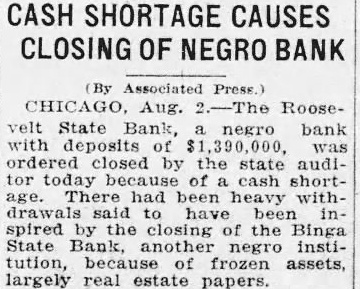 Negro Bank With Deposits Of $1,390,000 Is Closed Chicago, Roosevelt State bank, negro bank, with deposits of $1,390,000 was ordered closed by the state auditor today because of cash shortage. There had been heavy withdrawals said to have been inspired the closing of the Biga State bank, another negro institution, because assets, largely real estate