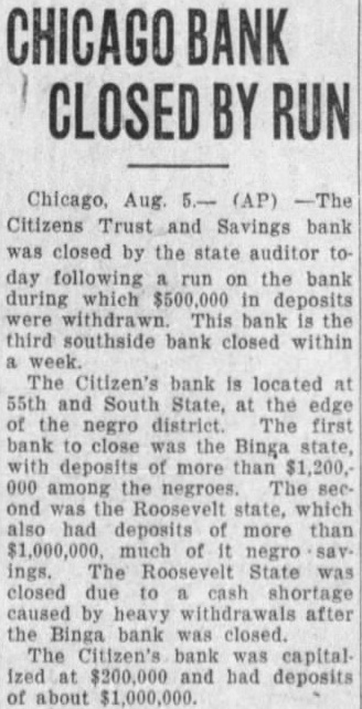 Third Chicago Bank Closed Out by Run Associated Press) CHICAGO, citizens Trust and Savings bank closed the state auditor today following on the bank during which $500,000 deposits were withdrawn. This bank the third South bank closed during the last week. The Citizens bank located and South State, the edge the negro district. The first bank was the Binga State, with posits more than among The second the Roosevelt State, which also more than much negro savings.