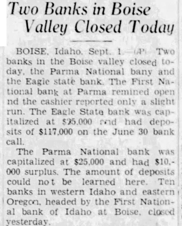 BOISE Idaho. Sept. Two banks in the Boise valley closed today. the Parma National bany and the Eagle state bank. The First National bank at Parma remined open nd the cashier reported only a slight run. The Eagle State bank was cap italized at and had deposits of $117,000 on the June 30 bank The Parma National bank was capitalized at $25,000 and had $10.000 surplus. The amount of deposits could not be learned here. Ten banks in western Idaho and eastern Oregon. headed by the First National bank of Idaho at Boise, closed yesterday