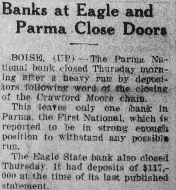 BOISE. (UP) The Parma National bank closed Thursday morning after heavy run by depositors following the closing of the Crawford Moore chain This leaves only one bank in Parma. the First National. which 18 reported to be in strong enough position to withstand any possible The Eagle State bank also closed Thursday It had deposits of $117.000 at the time of its last published statement.