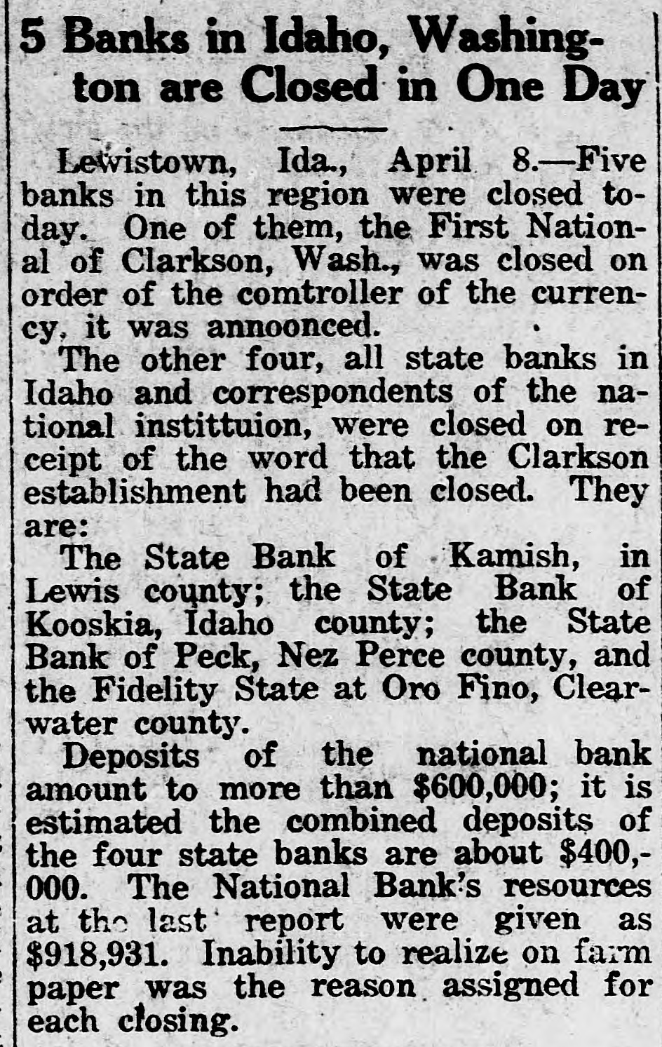 5 Banks in Idaho, Washington are Closed in One Day Lewistown, Ida., April 8.-Five banks in this region were closed today. One of them, the First National of Clarkson, Wash., was closed on order of the comtroller of the currency, it was annoonced. The other four, all state banks in Idaho and correspondents of the national instittuion, were closed on receipt of the word that the Clarkson establishment had been closed. They are: The State Bank of Kamish, in Lewis county; the State Bank of Kooskia, Idaho county; the State Bank of Peck, Nez Perce county, and the Fidelity State at Oro Fino, Clearwater county. Deposits of the national bank amount to more than $600,000; it is estimated the combined deposits of the four state banks are about $400,000. The National Bank's resources at the last report were given as $918,931. Inability to realize on farm paper was the reason assigned for each closing.