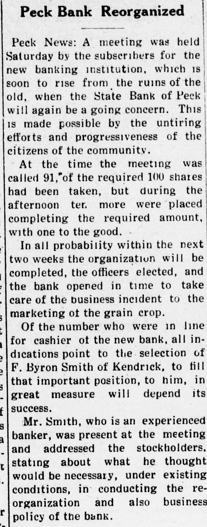 Peck Bank Reorganized Peck News: A meeting was held Saturday by the subscribers for the new banking institution, which IS soon to rise from the ruins of the old, when the State Bank of Peck will again be a going concern. This IS made possible by the untiring efforts and progressiveness of the citizens of the community. At the time the meeting was called 91, of the required 100 shares had been taken, but during the afternoon ter. more were placed completing the required amount, with one to the good. In all probability within the next two weeks the organization will be completed, the officers elected, and the bank opened in time to take care of the business incident to the marketing of the grain crop. Of the number who were in line for cashier of the new bank, all indications point to the selection of F. Byron Smith of Kendrick, to fill that important position, to him, in great measure will depend its success. Mr. Smith, who is an experienced banker, was present at the meeting and addressed the stockholders. stating about what he thought would be necessary, under existing conditions, in conducting the reorganization and also business policy of the bank.