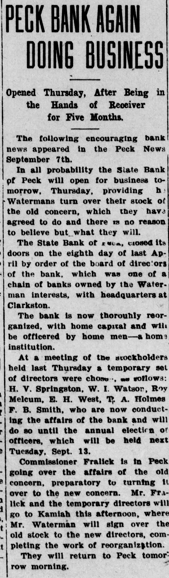 PECK BANK AGAIN DOING BUSINESS Opened Thursday, After Being in the Hands of Receiver for Five Months. The following encouraging bank news appeared in the Peck News September 7th. In all probability the State Bank of Peck will open for business tomorrow, Thursday, providing h Watermans turn over their stock of the old concern, which they have agreed to do and there IS no reason to believe but what they will. The State Bank of reta, closed its doors on the eighth day of last April by order of the board of directors of the bank, which was one of a chain of banks owned by the Waterman interests, with headquarters at Clarkston. The bank is now thorouhly reorganized, with home capital and will be officered by home men-a home institution. At a meeting of the stockholders held last Thursday a temporary set of directors were chose 9 - wollows: H. V. Springston, W. I. Watson, Roy Melcum, E. H. West, Tp A. Holmes F. B. Smith, who are now conducting the affairs of the bank and will do so until the annual election or officers, which will be held next Tuesday, Sept. 13. Commissioner Fralick is in Peck going over the affairs of the old concern, preparatory to turning it over to the new concern. Mr. Fralick and the temporary directors will go to Kamiah this afternoon, where Mr. Waterman will sign over the old stock to the new directors, completing the work of reorganization. They will return to Peck tomor row morning.