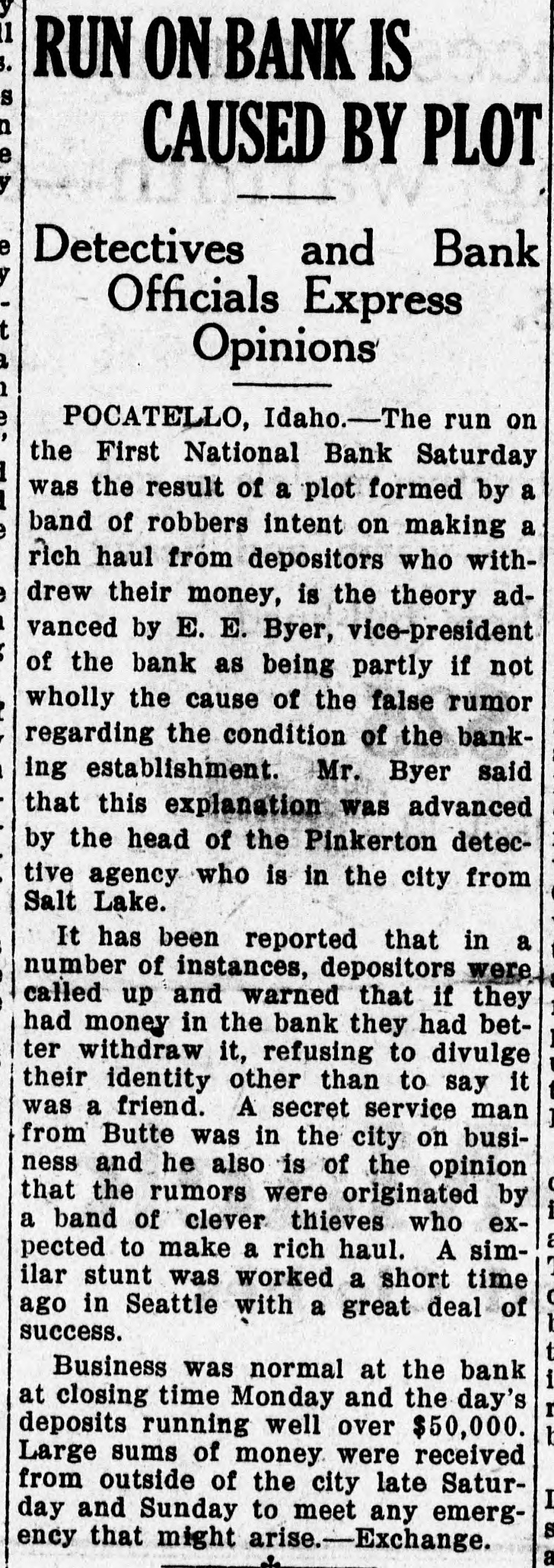 RUN ON BANK IS CAUSED BY PLOT Detectives and Bank Officials Express Opinions POCATELLO, Idaho.-The run on the First National Bank Saturday was the result of a plot formed by a band of robbers intent on making a rich haul from depositors who withdrew their money, is the theory advanced by E. E. Byer, vice-president of the bank as being partly if not wholly the cause of the false rumor regarding the condition of the banking establishment. Mr. Byer said that this explanation was advanced by the head of the Pinkerton detective agency who is in the city from Salt Lake. It has been reported that in a number of instances, depositors were called up and warned that if they had money in the bank they had better withdraw it, refusing to divulge their identity other than to say it was a friend. A secret service man from Butte was in the city on business and he also is of the opinion that the rumors were originated by a band of clever thieves who expected to make a rich haul. A similar stunt was worked a short time ago in Seattle with a great deal of success. Business was normal at the bank at closing time Monday and the day's deposits running well over $50,000. Large sums of money were received from outside of the city late Saturday and Sunday to meet any emergency that might arise.-Exchange.