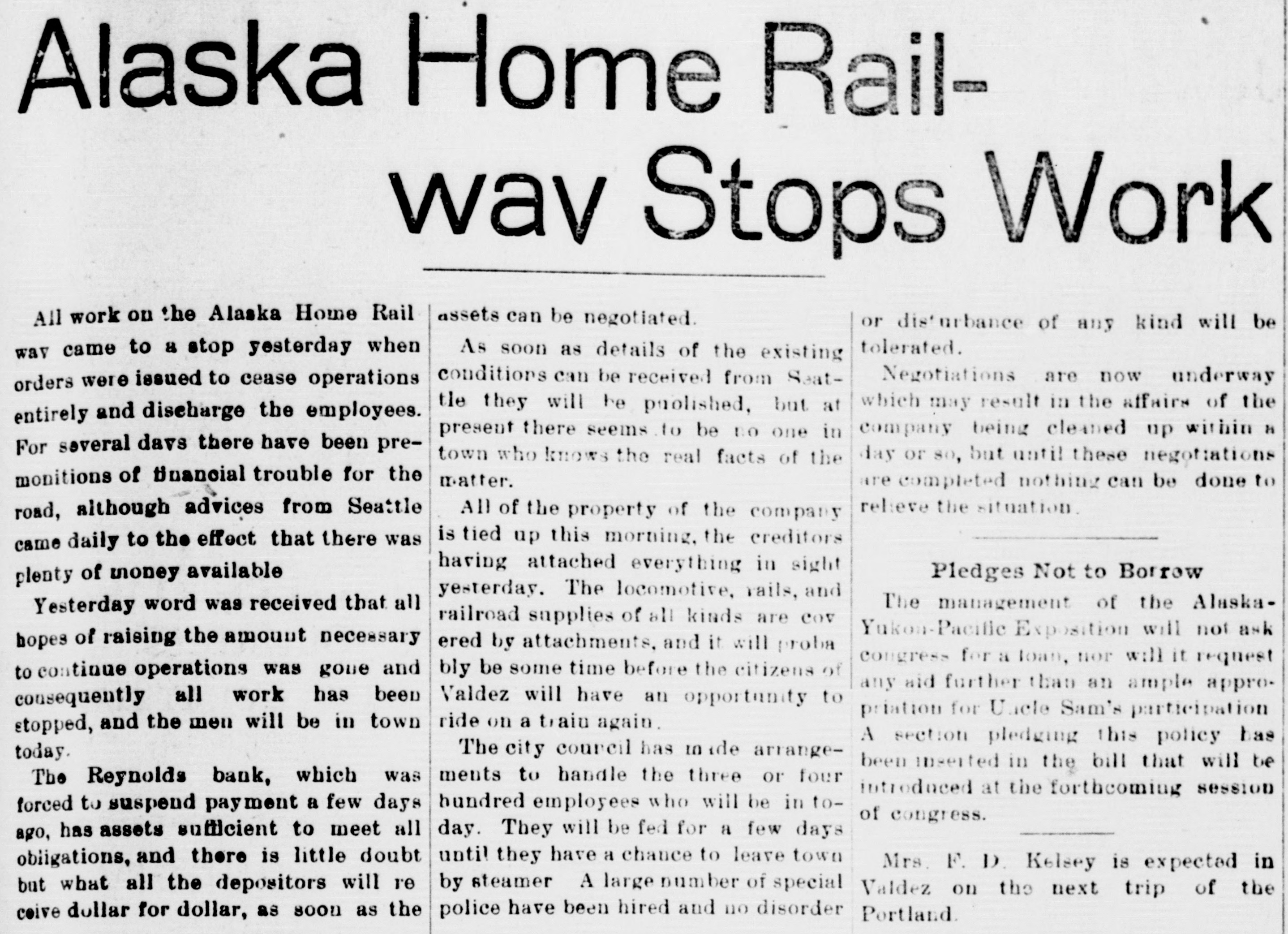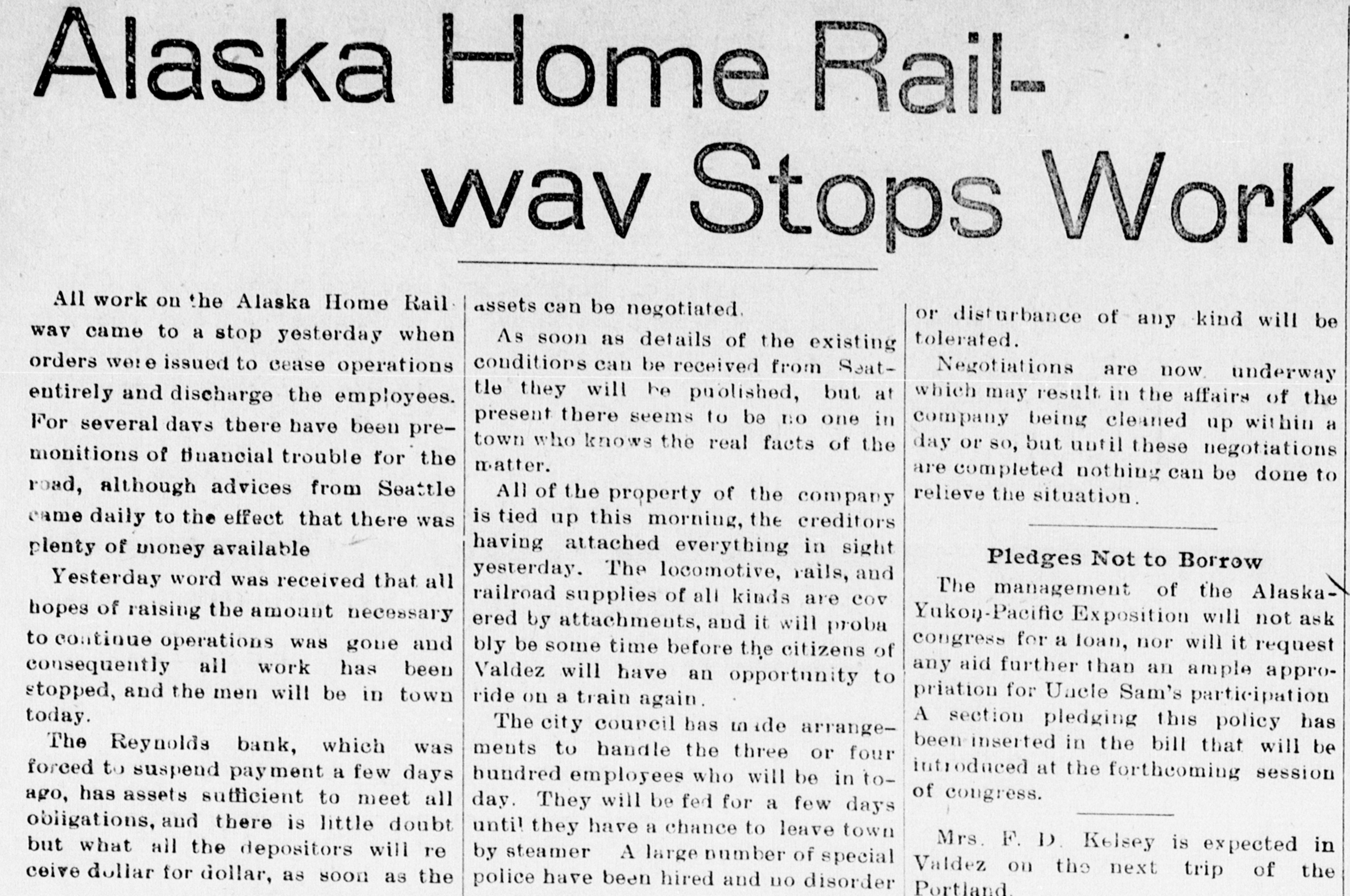 Alaska Home Railwav Stops Work All work on the Alaska Home Rail assets can be negotiated or isturbance of any kind will be way came to a stop yesterday when tolerated. As soon as details of the existing conditions can be received from Seatorders were issued to cease operations Negotiations are now underway tle they will be puolished, but at which may result in the affairs of the entirely and discharge the employees. present there seems to be no one in company being cleaned up within a For several days there have been pretown who knows the real facts of the day or so, but until these negotiations monitions of financial trouble for the matter. are completed nothing can be done to road, although advices from Seattle relieve the situation. All of the property of the company came daily to the effect that there was is tied up this morning, the creditors having attached everything in sight plenty of money available Pledges Not to Borrow yesterday. The locomotive, rails, and Yesterday word was received that all The management of the Alaskarailroad supplies of all kinds are COV hopes of raising the amount necessary Yukon-Pacific Exposition will not ask ered by attachments, and it will proba to continue operations was gone and congress for a loan, nor will it request bly be some time before the citizens of consequently all work has been any aid further than an ample approValdez will have an opportunity to stopped, and the men will be in town priation for Uacle Sam's participation ride on a train again today. A section pledging this policy has The city coupcil has made arrangebeen inserted in the bill that will be The Reynolds bank, which was ments to handle the three or four introduced at the forthcoming session forced to suspend payment a few days hundred employees who will be in toof congress. ago, has assets sufficient to meet all day. They will be fed for a few days obligations, and there is little doubt until they have a chance to leave town Mrs. F. D Kelsey is expected in but what all the depositors will re by steamer A large number of special Valdez on the next trip of the ceive dollar for dollar, as soon as the police have been hired and no disorder Portland