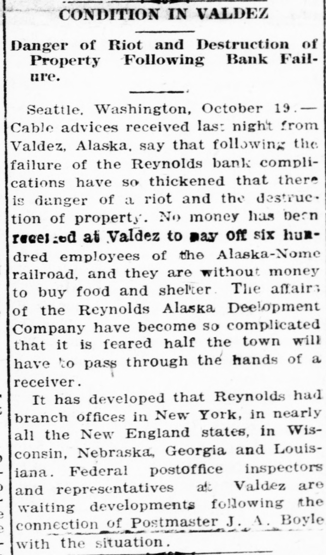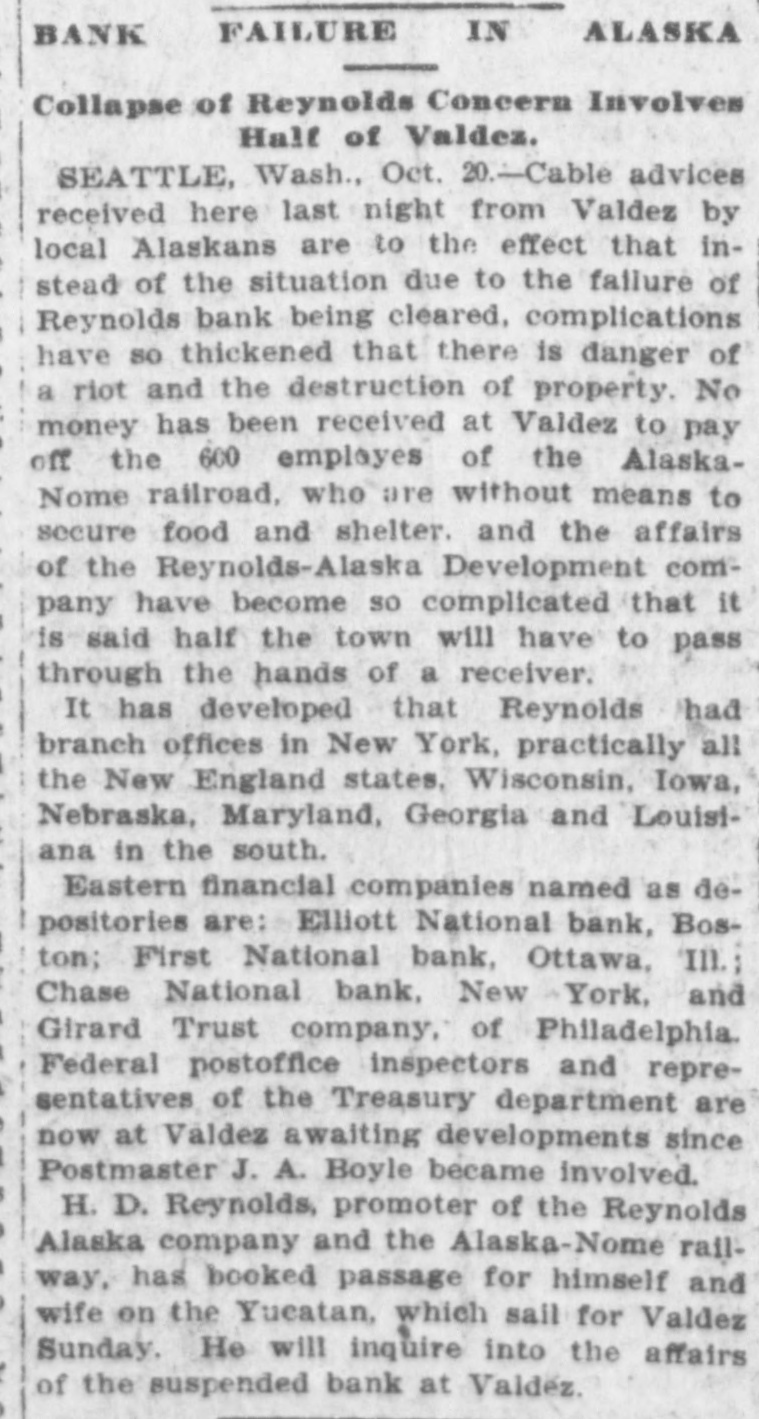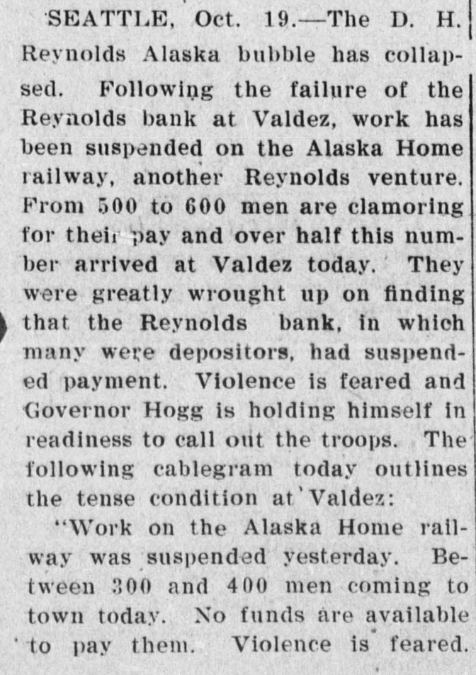 SEATTLE, Oct. 19.-The D. H. Reynolds Alaska bubble has collapsed. Following the failure of the Reynolds bank at Valdez, work has been suspended on the Alaska Home railway, another Reynolds venture. From 500 to 600 men are clamoring for their pay and over half this number arrived at Valdez today. They were greatly wrought up on finding that the Reynolds bank, in which many were depositors, had suspended payment. Violence is feared and Governor Hogg is holding himself in readiness to call out the troops. The following cablegram today outlines the tense condition at Valdez: "Work on the Alaska Home railway was suspended yesterday. Between 300 and 400 men coming to town today. No funds are available to pay them. Violence is feared.