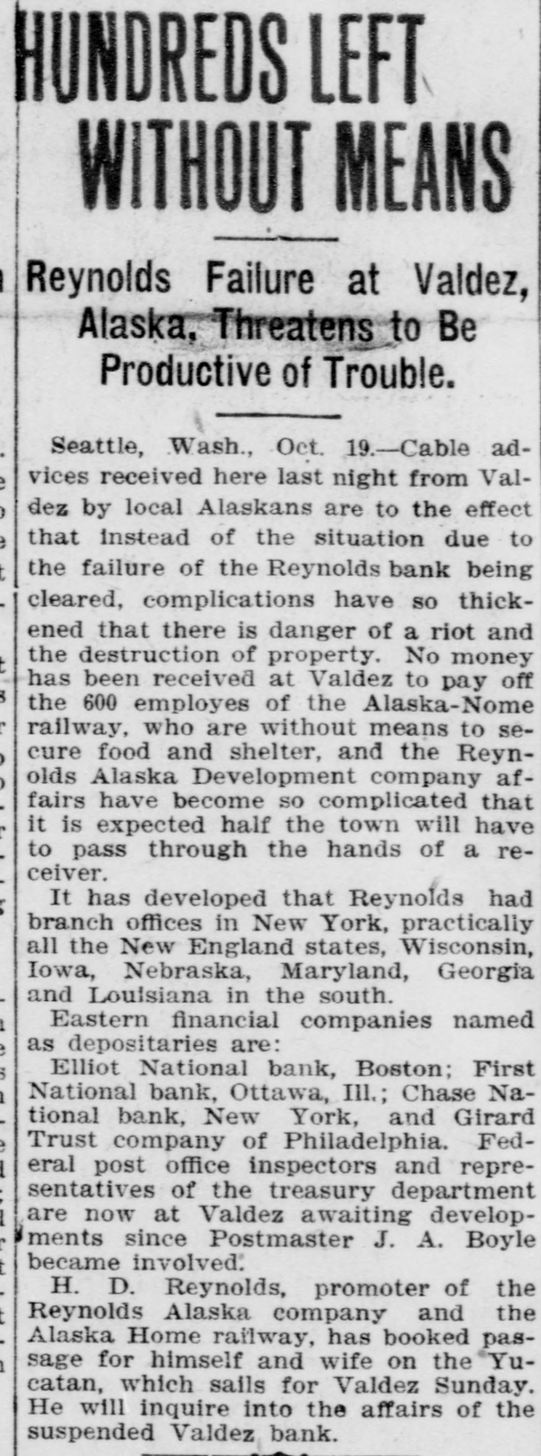 HUNDREDS LEFT WITHOUT MEANS Reynolds Failure at Valdez, Alaska, Threatens to Be Productive of Trouble. Seattle, Wash., Oct. 19.-Cable advices received here last night from Valdez by local Alaskans are to the effect that instead of the situation due to the failure of the Reynolds bank being cleared, complications have SO thickened that there is danger of a riot and the destruction of property. No money has been received at Valdez to pay off the 600 employes of the Alaska-Nome railway, who are without means to secure food and shelter, and the Reynolds Alaska Development company affairs have become SO complicated that it is expected half the town will have to pass through the hands of a receiver. It has developed that Reynolds had branch offices in New York, practically all the New England states, Wisconsin, Iowa, Nebraska, Maryland, Georgia and Louisiana in the south. Eastern financial companies named as depositaries are: Elliot National bank, Boston; First National bank, Ottawa, Ill.; Chase National bank, New York, and Girard Trust company of Philadelphia. Federal post office inspectors and representatives of the treasury department are now at Valdez awaiting developments since Postmaster J. A. Boyle became involved. H. D. Reynolds, promoter of the Reynolds Alaska company and the Alaska Home railway, has booked passage for himself and wife on the Yucatan, which sails for Valdez Sunday. He will inquire into the affairs of the suspended Valdez bank.